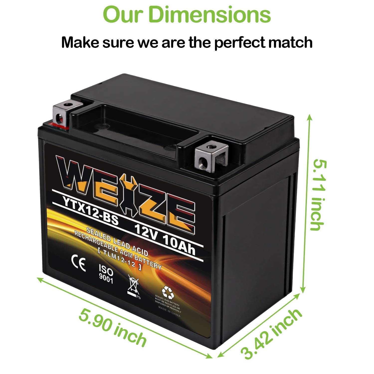 Battery dimensions: 5.91 in x 3.43 in x 5.12 in; Weight: 7.92 Lbs; Voltage: 12 volt; Amperage: 10 ah ; Chemistry: sealed lead acid(SLA), absorbed glass mat technology(AGM) ; Terminal: nut & bolt ;YTX12-BS battery with [+ -] terminal is a rechargeable, power sport battery. Terminal: Left : Positive (+)-Red, Right: Negative (-)-Black. YTX12 BS Battery Replacement For 12-BS ETX12 GTX12-BS CYTX12-BS CTX12-BS For ATV, Motorcycles, Personal Watercraft, Jet Ski's, Snowmobiles,UTV.