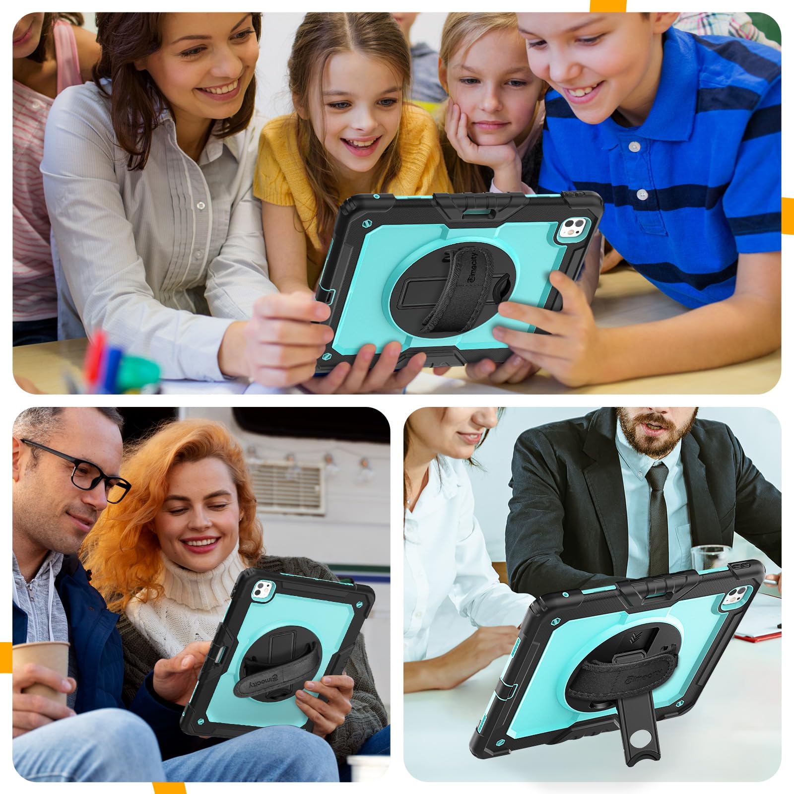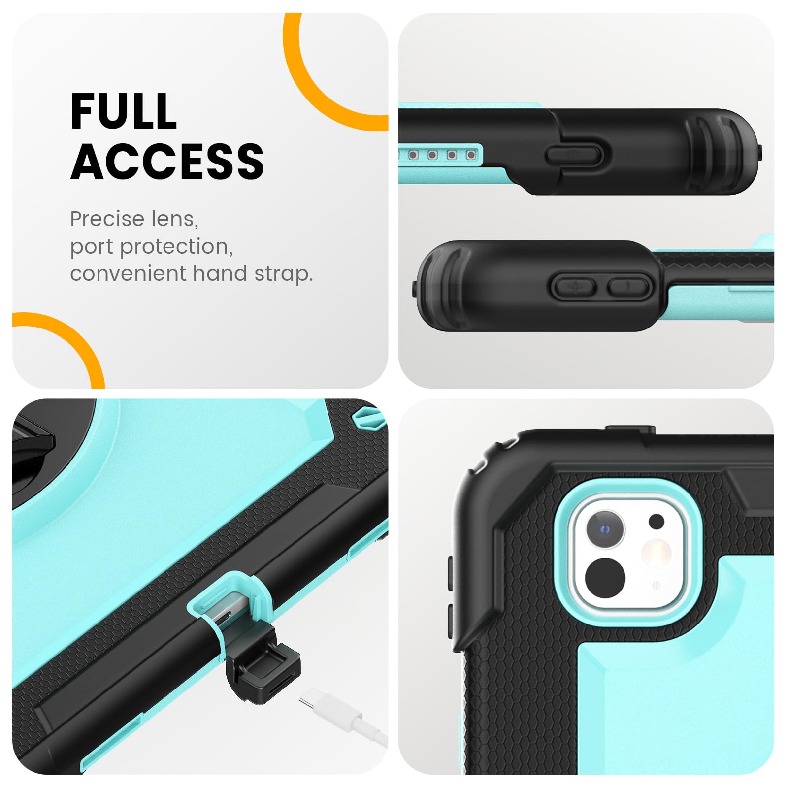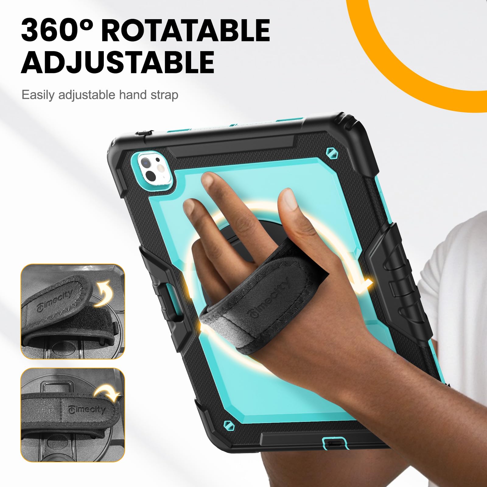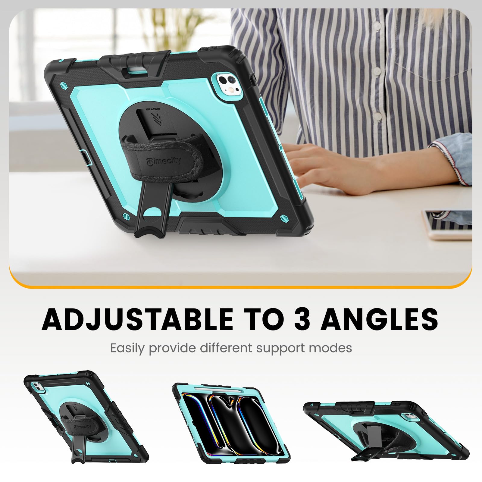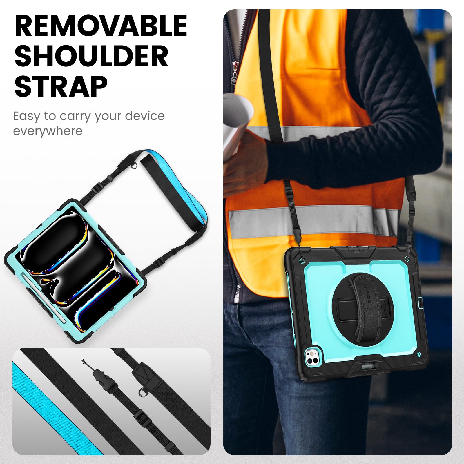 MULTI-ANGLE FUNCTIONALITY: 360° rotating stand with 5 positions for video calls, notes, or viewing; Detachable shoulder strap for commutes; Anti-slip hand strap secures during outdoor work; Dedicated pencil holder for hiking/transport