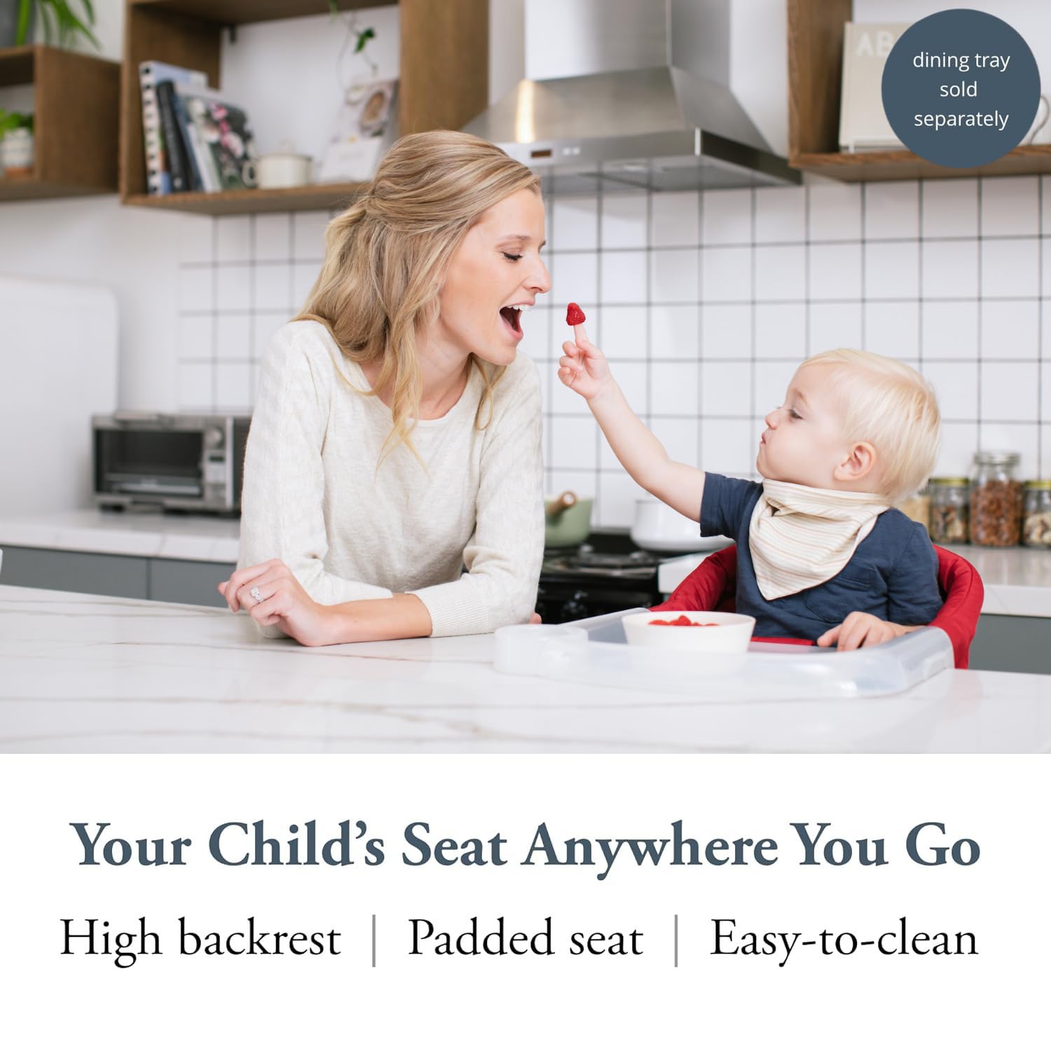 CONVENIENT STORAGE & ACCESSORIES: Features a rear storage pocket for baby items, a washable cover, and a built-in carry bag for easy transport. Add the optional food catcher tray with a cup holder for a tidy feeding experience, available separately.