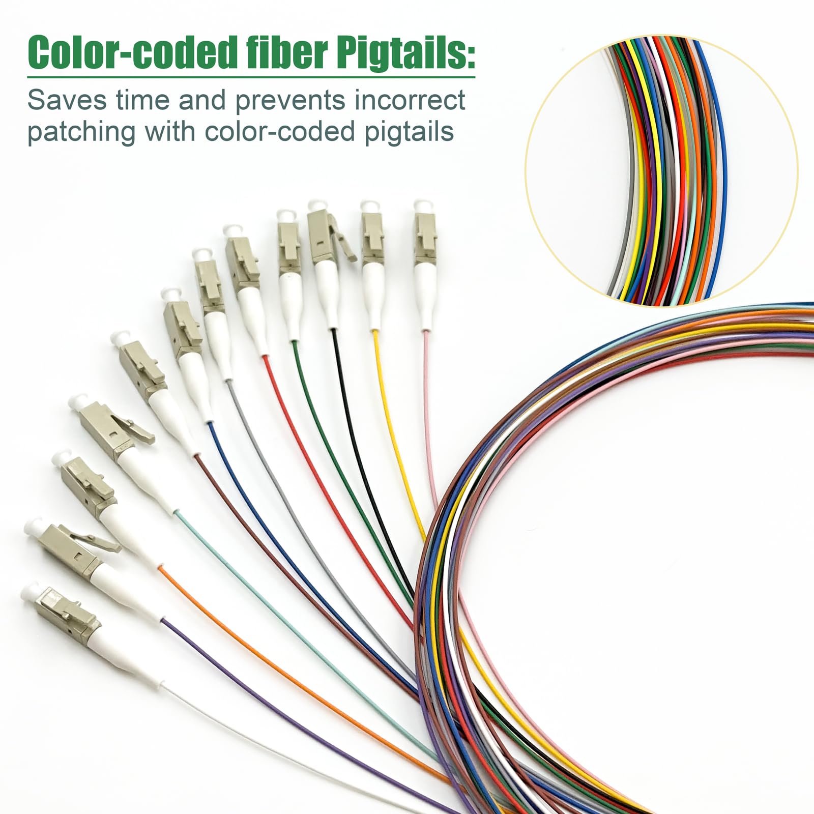 Color-coded Fiber Pigtails: Individually colored to easily match color-coded Fiber Cable that will be spliced. Saves time and prevents incorrect patching with color-coded pigtails