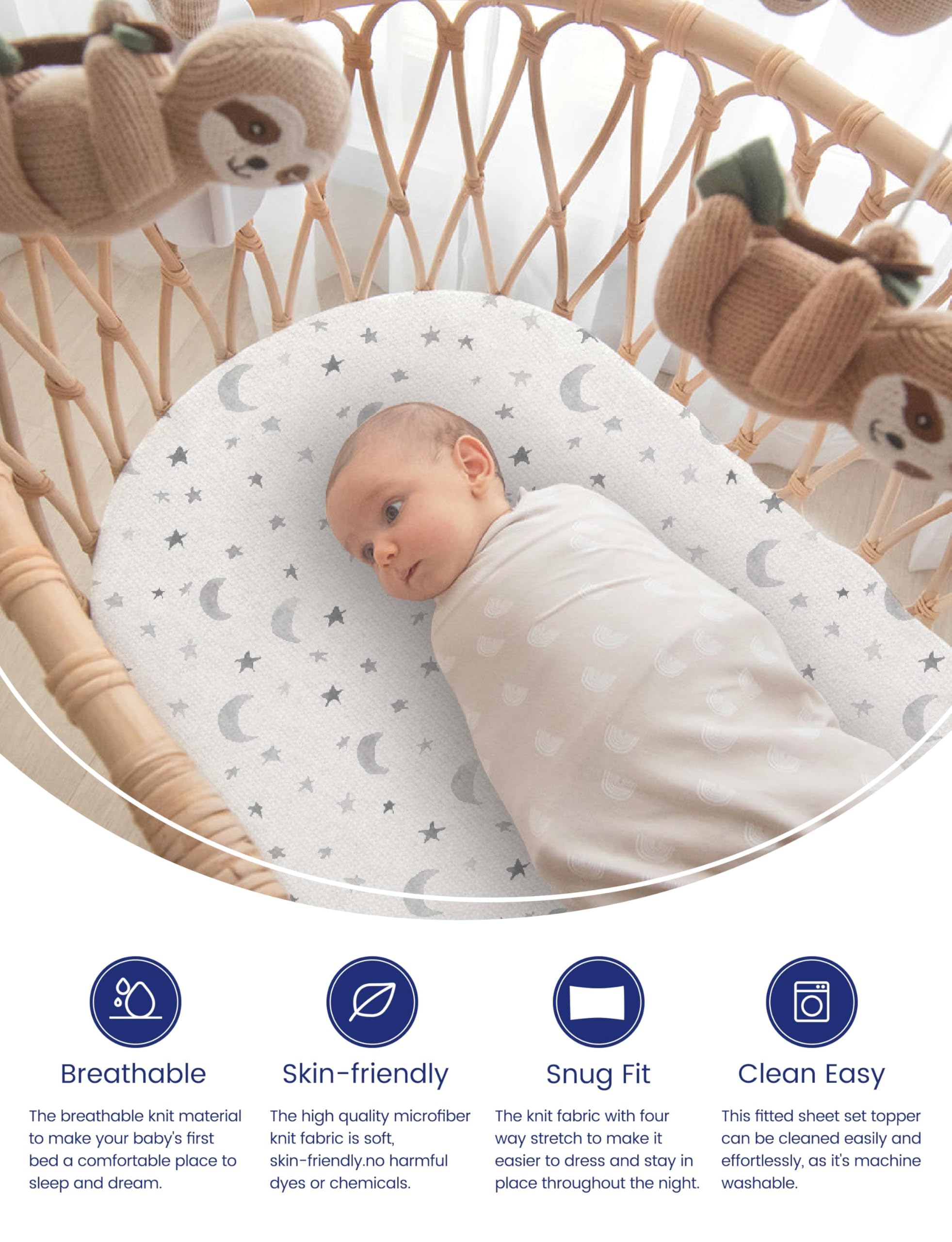 SOFT. SUPPLE. SILKY: TotCare fabric is weaved out of the finest fibers to ensure superb flexibility and smoothness.Make your baby's cradle the softest sleep space. The TotAha cradle sheets set will guarantee relaxation at night.