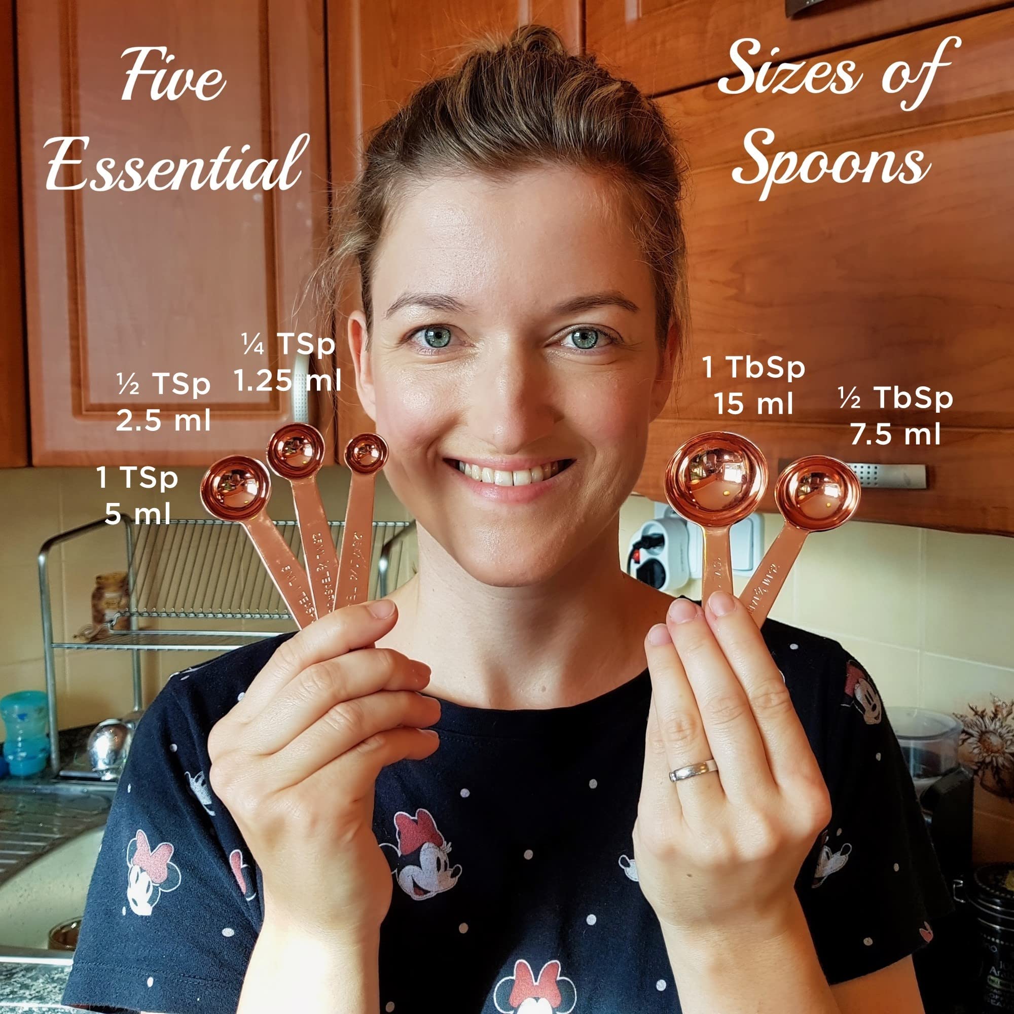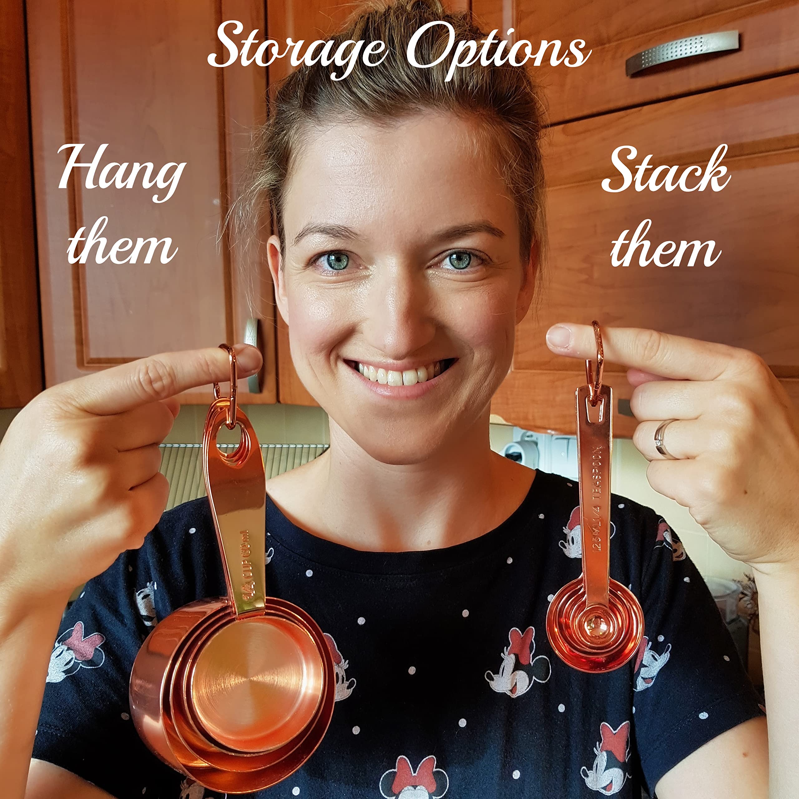 ⭐ 4 Cups + 5 Spoons + 2 Rings - Cups: 1 cup (240 ml), 1/2 cup, 1/3 cup, 1/4 cup. Spoons: 1 tablespoon (15 ml), 1/2 tbsp, 1 teaspoon (5 ml), 1/2 teaspoon, 1/4 tsp. + 2 copper D-rings to hook together