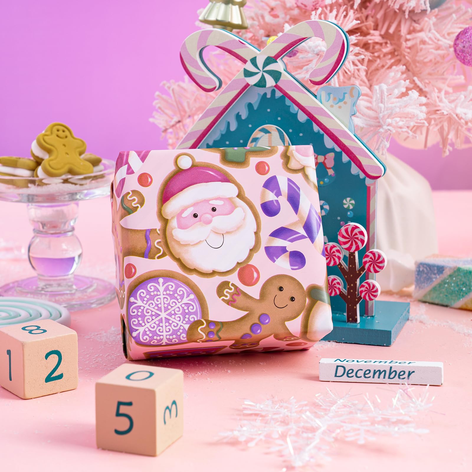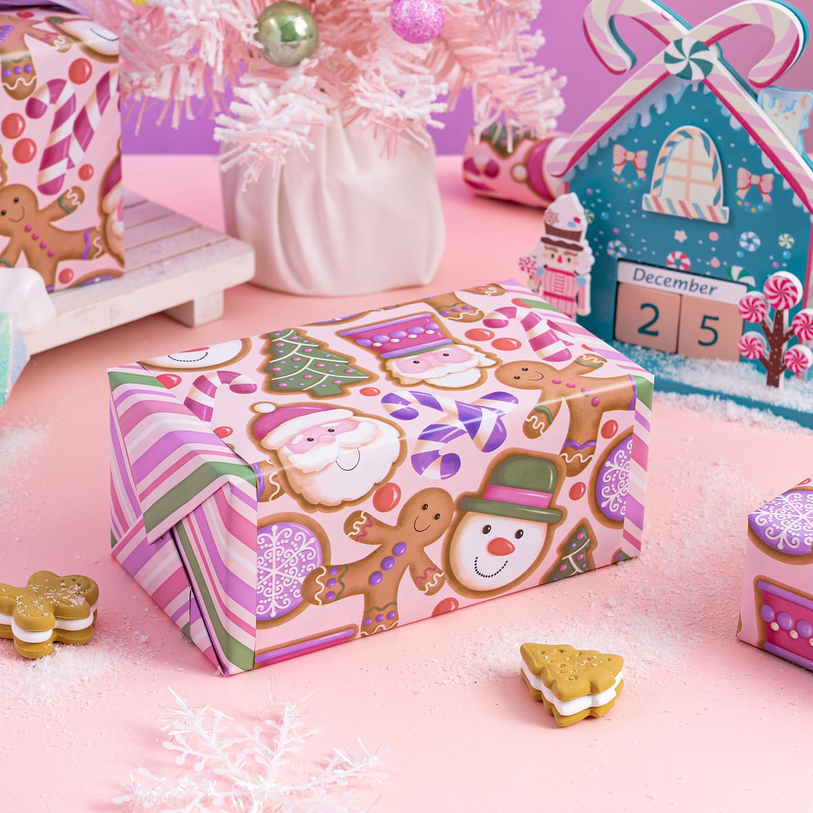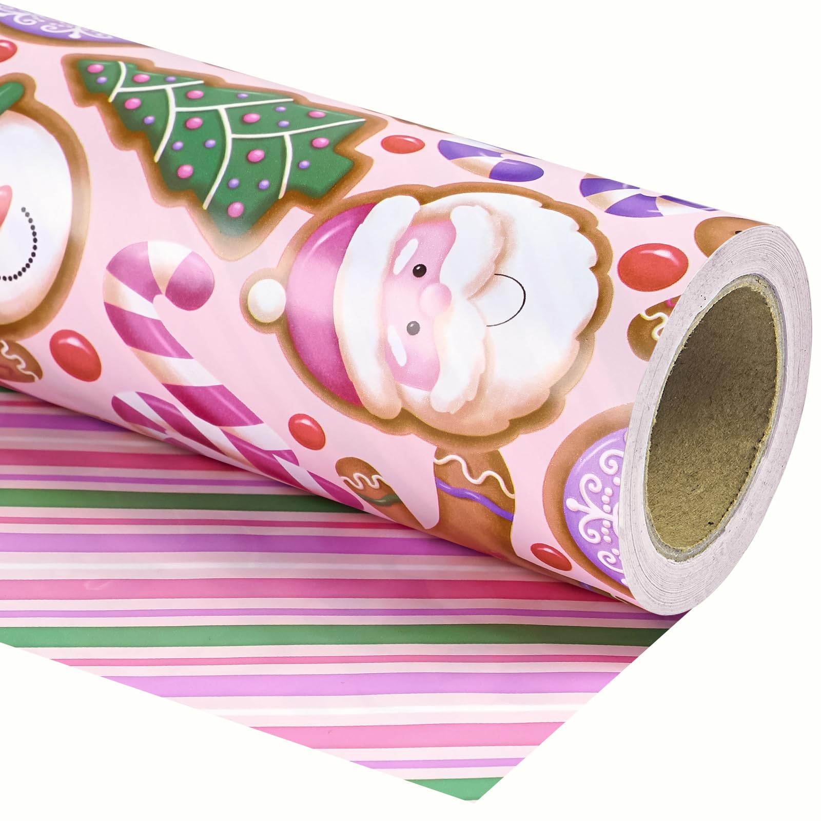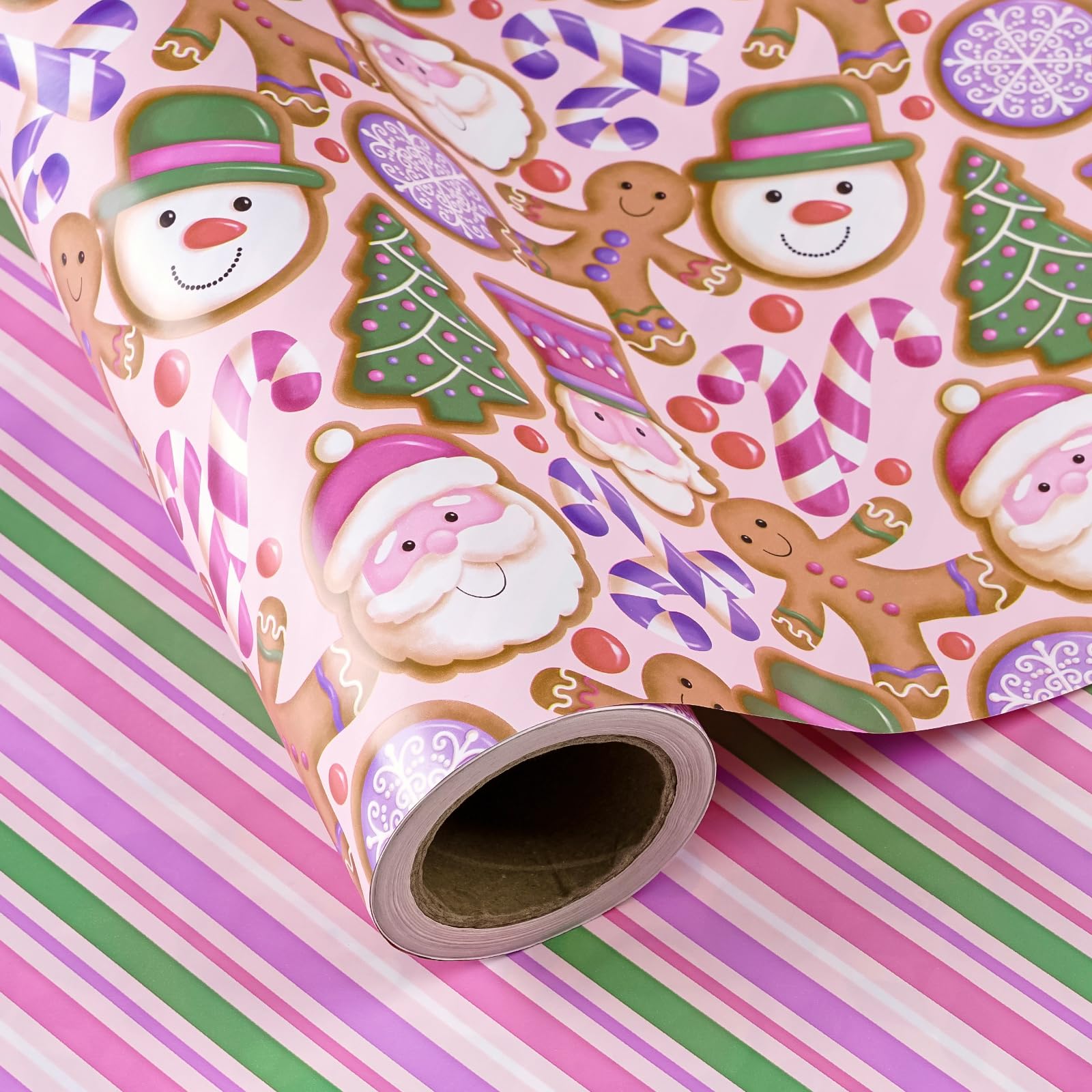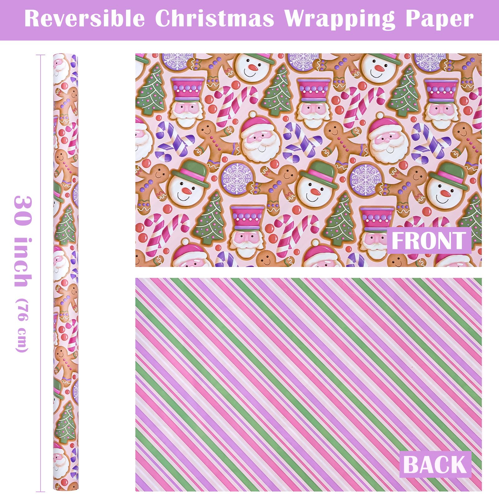 Reversible: Santa faced cookies, gingerbread men, snowmen, candy canes, and Christmas trees printed on one side; pink purple green diagonal stripes printed on the reverse. Two different designs make unique and varied gift presentations easy.