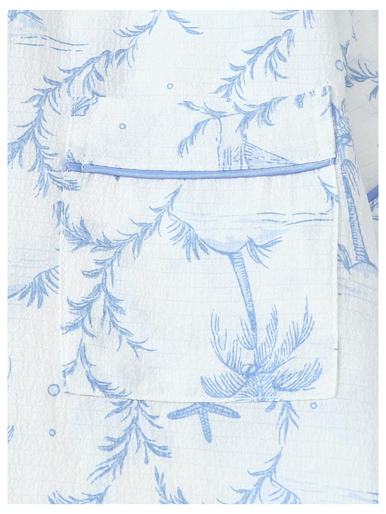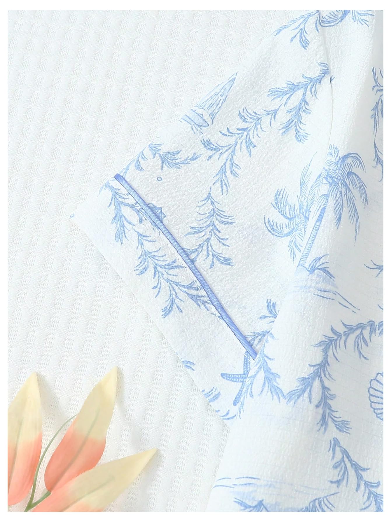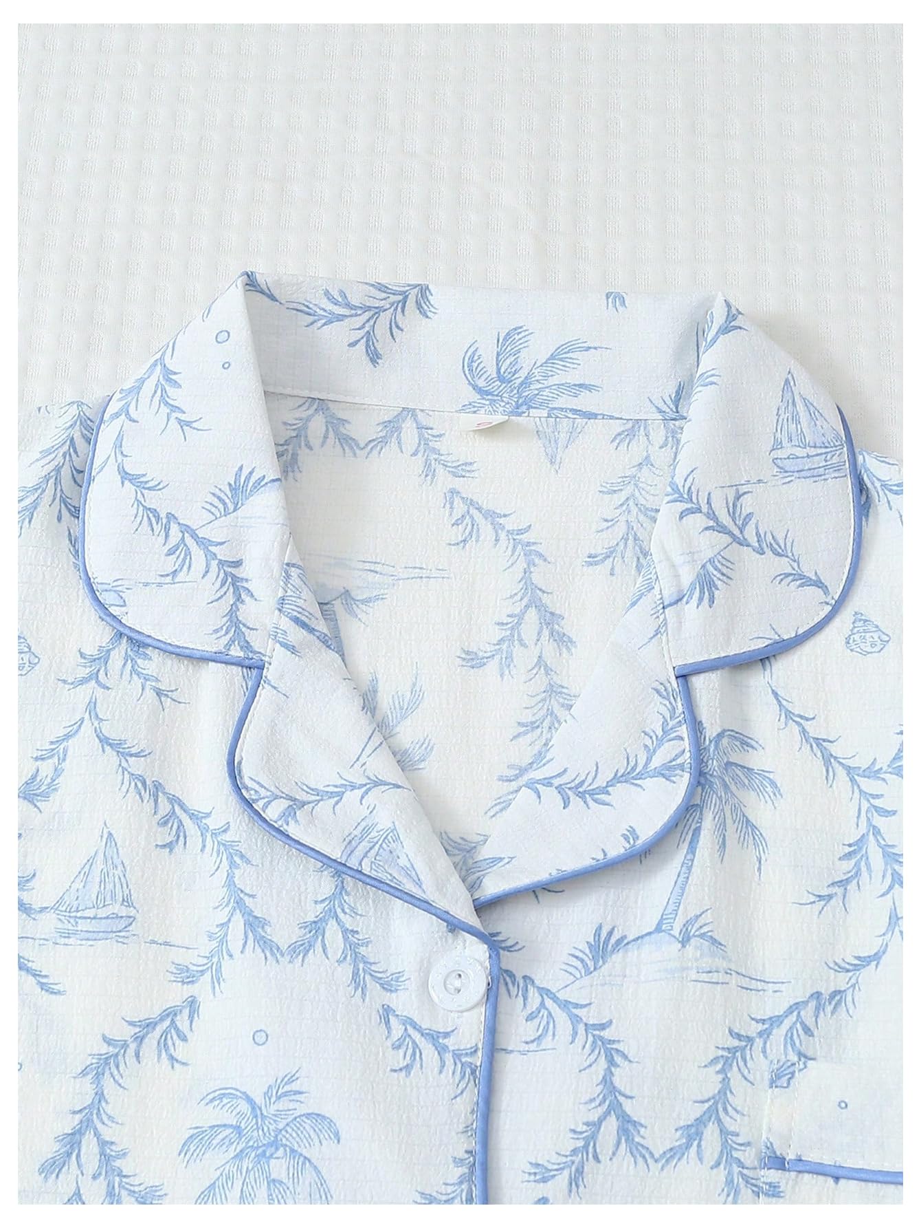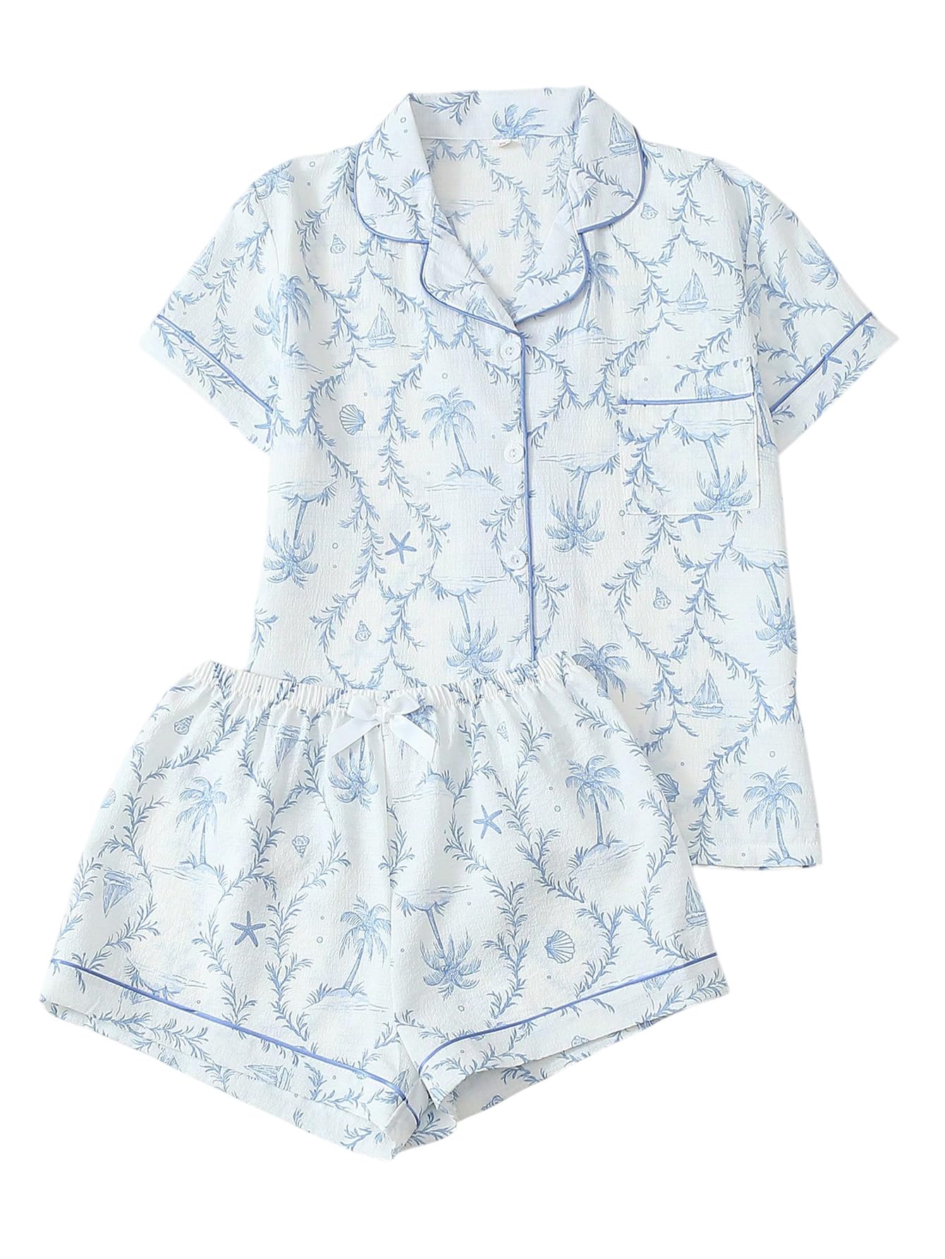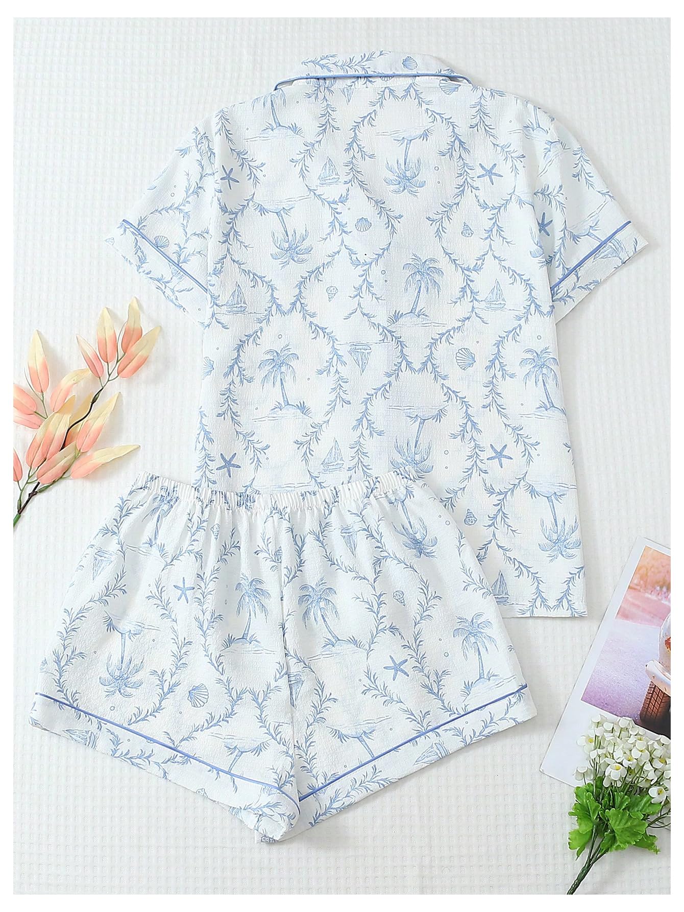 Lapel Collar, Short Sleeve, Print Pajamas, Bow Decoration, Button Down Top and Shorts, Loungewear Sets, Women's Sleepwear.