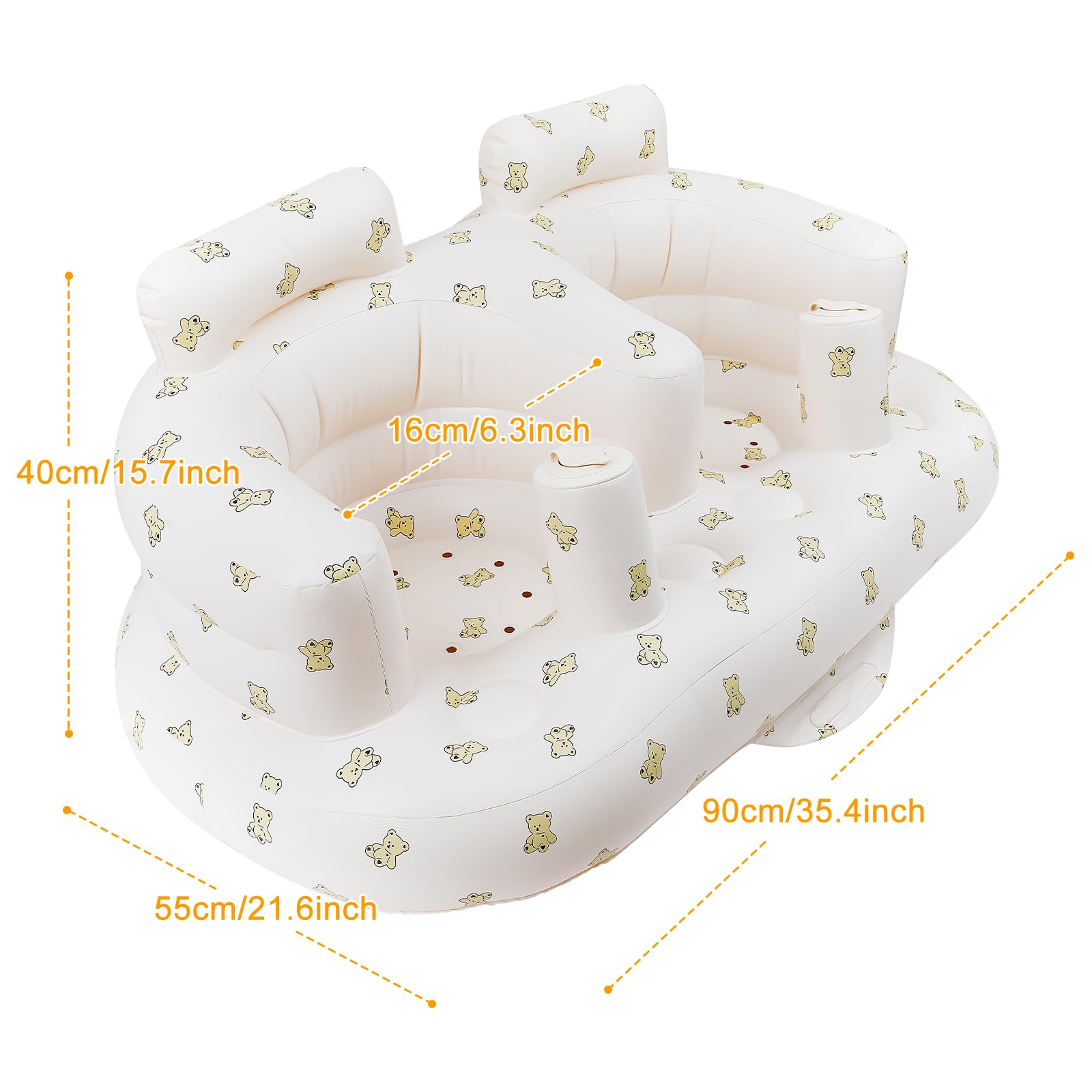 Side-by-Side Double Seat Design: Designed with two connected seats, this inflatable baby chair allows twin babies or siblings to sit side-by-side, encouraging interaction and bonding while ensuring each child has their own secure and comfortable space. Perfect for shared playtime, feeding, or relaxing together