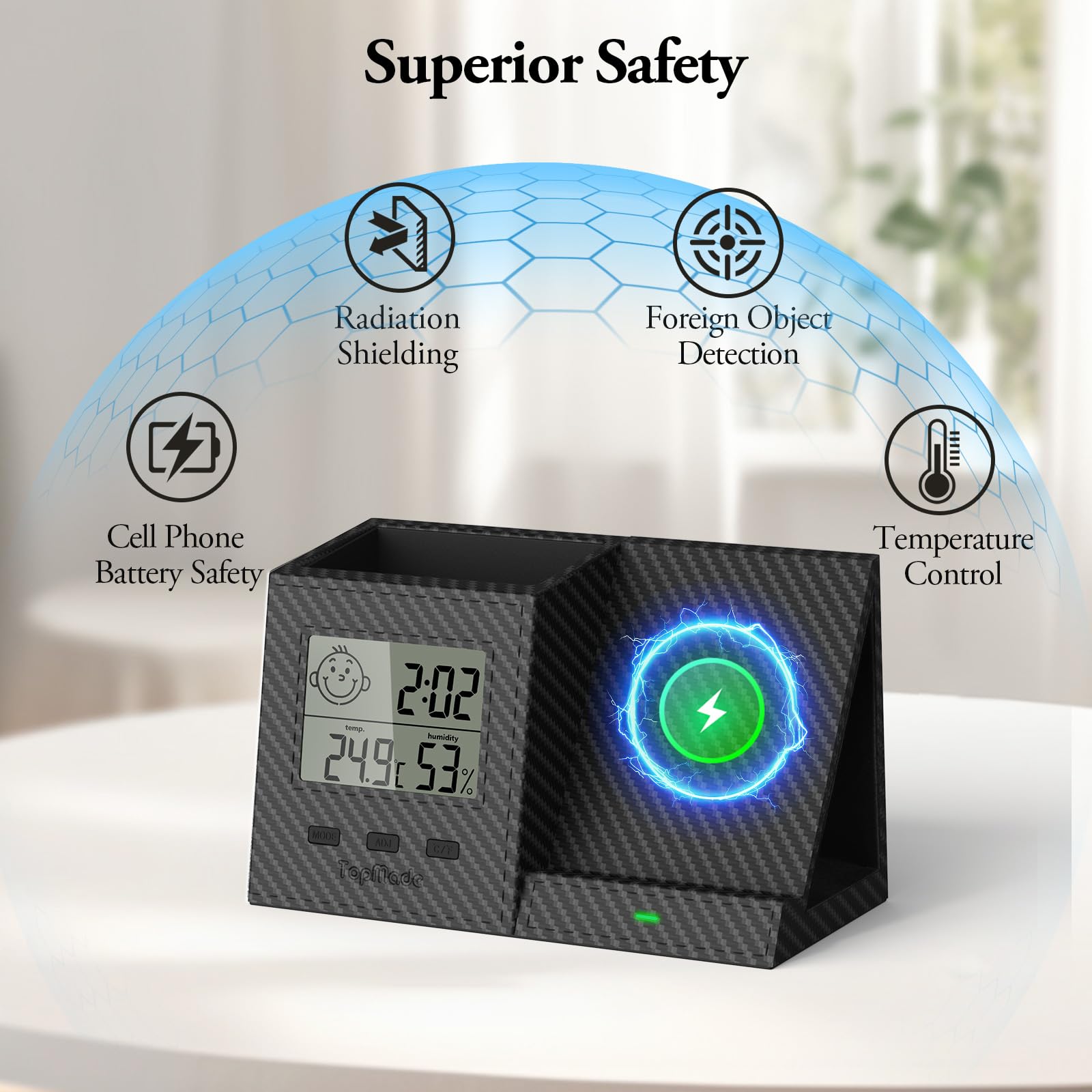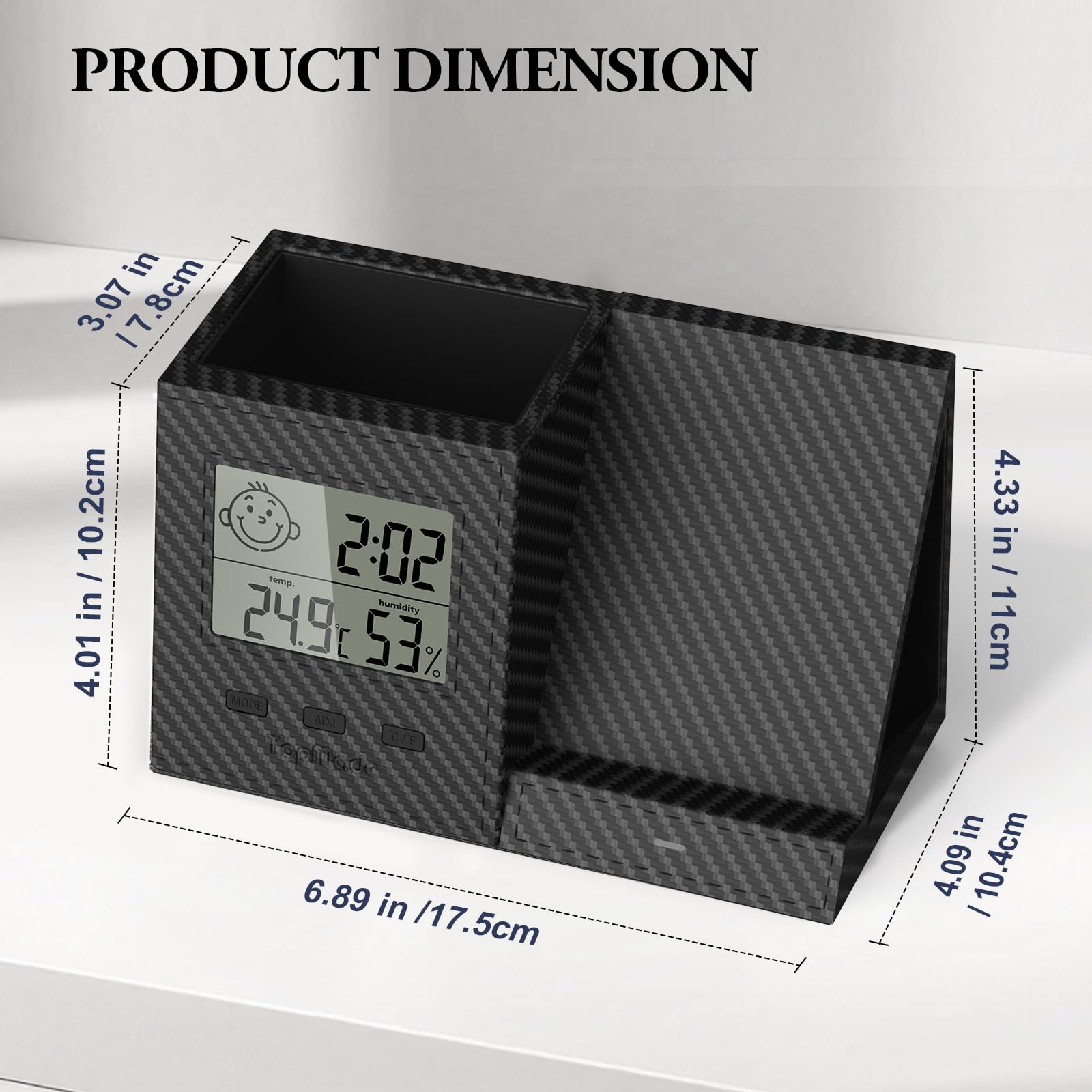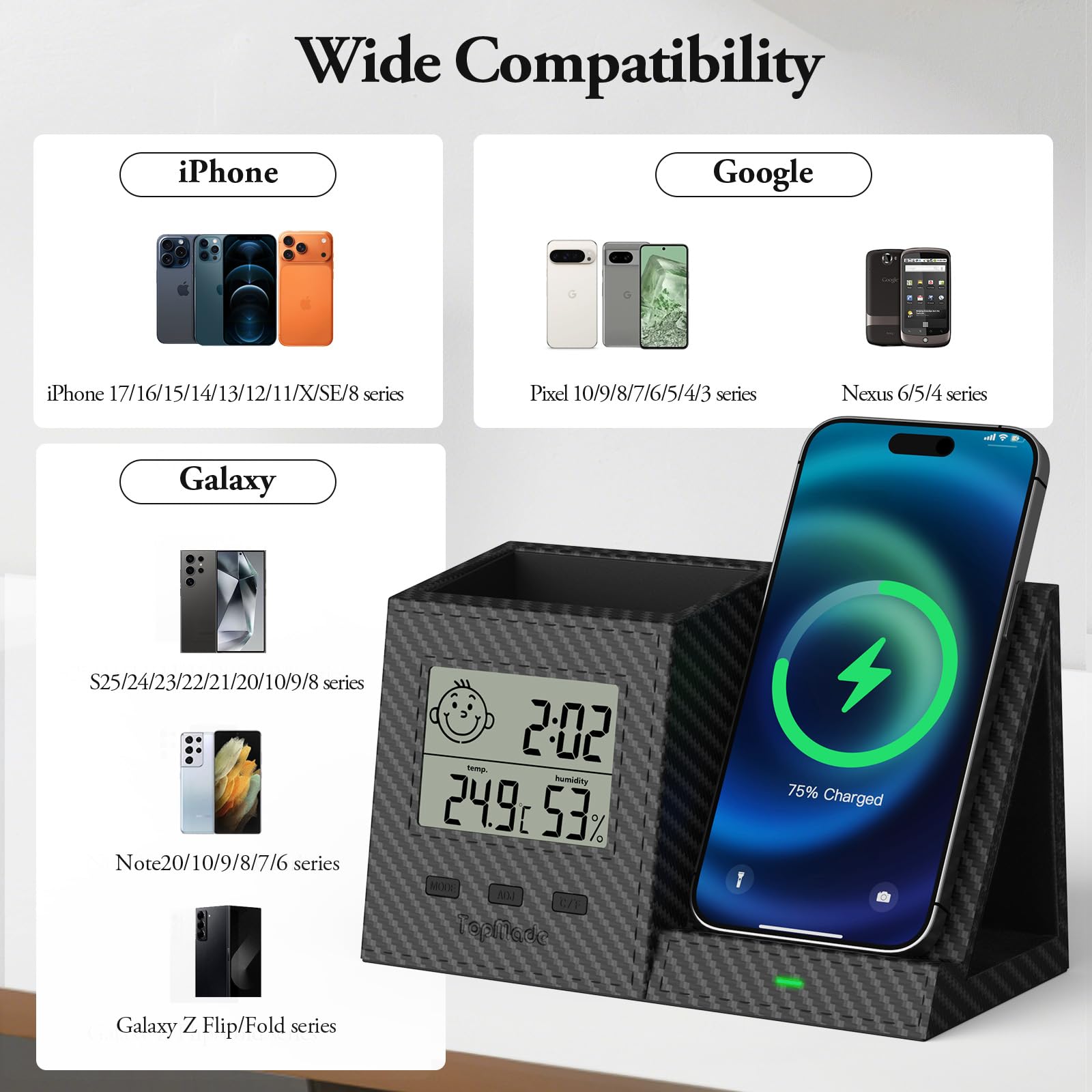 【Wireless Charger Desktop Organizer】: The wireless charging stand cleverly integrates a pen/pencil holder, digital thermometer, indoor hygrometer and clock, only one device can meet your various needs in office and study scenarios, to keep your desk tidy