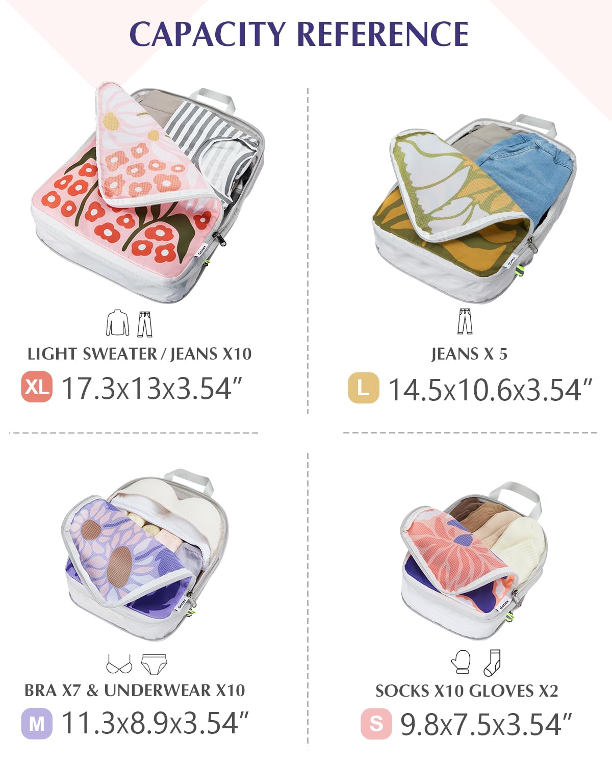 4 PCS Set For Diverse Scenarios: Size combinations perfectly fit the needs of weekenders, carry on, duffel, backpack and suitcases. Includes: 1x XL: 17.3x13x3.54 inches, 1x L: 14.5x10.6x3.54 inches, 1x M: 11.3x8.9x3.54 inches, 1x S: 9.8x7.5x3.54 inches