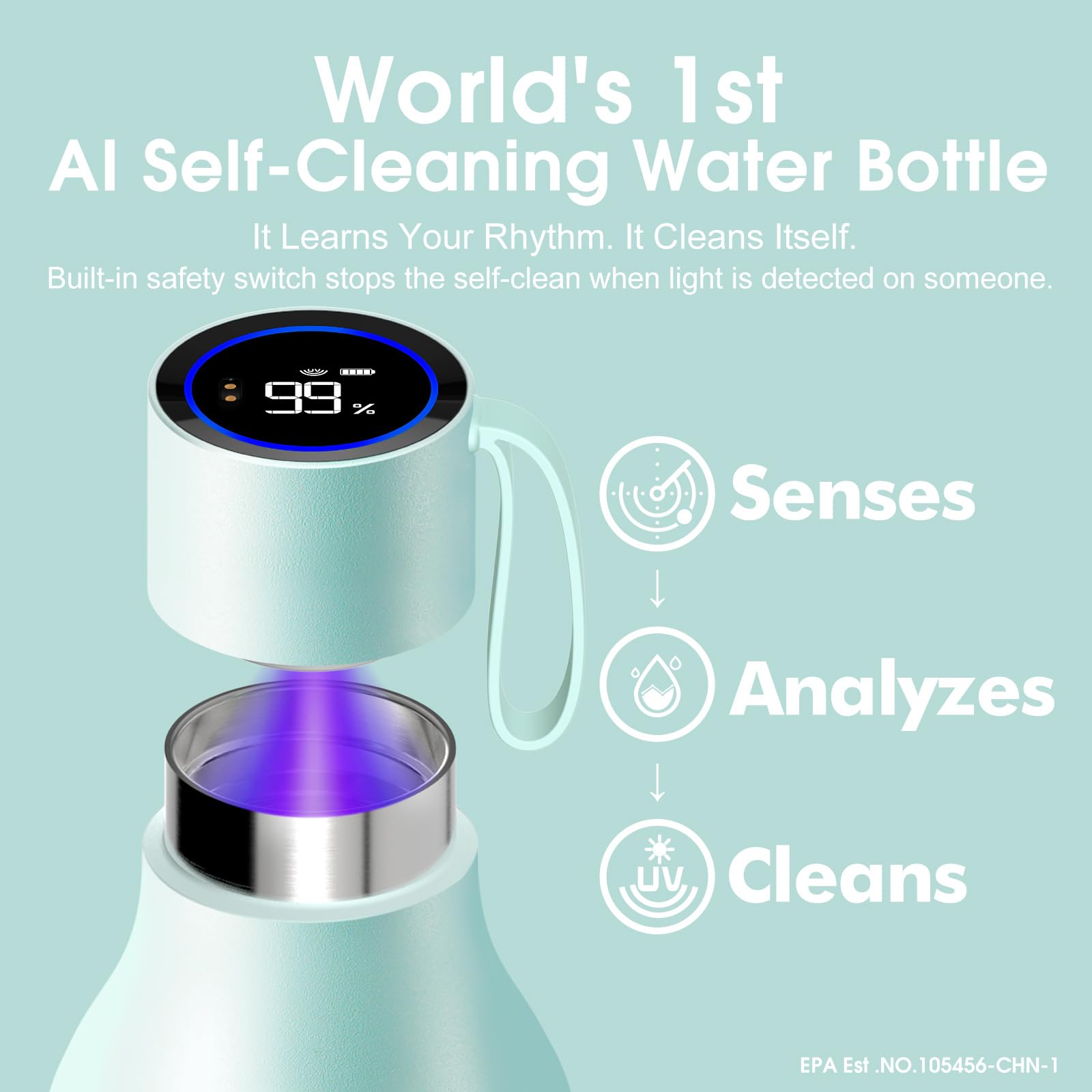 【AI-Powered Self-Cleaning with Safety Lock】This self cleaning water bottle features advanced AI that automatically activates the water bottle self cleaning function based on your usage patterns. The intelligent system includes a safety lock that pauses operation when directed toward the body, ensuring complete protection. With simple long-press activation, it delivers pure water through hands-free sanitization.