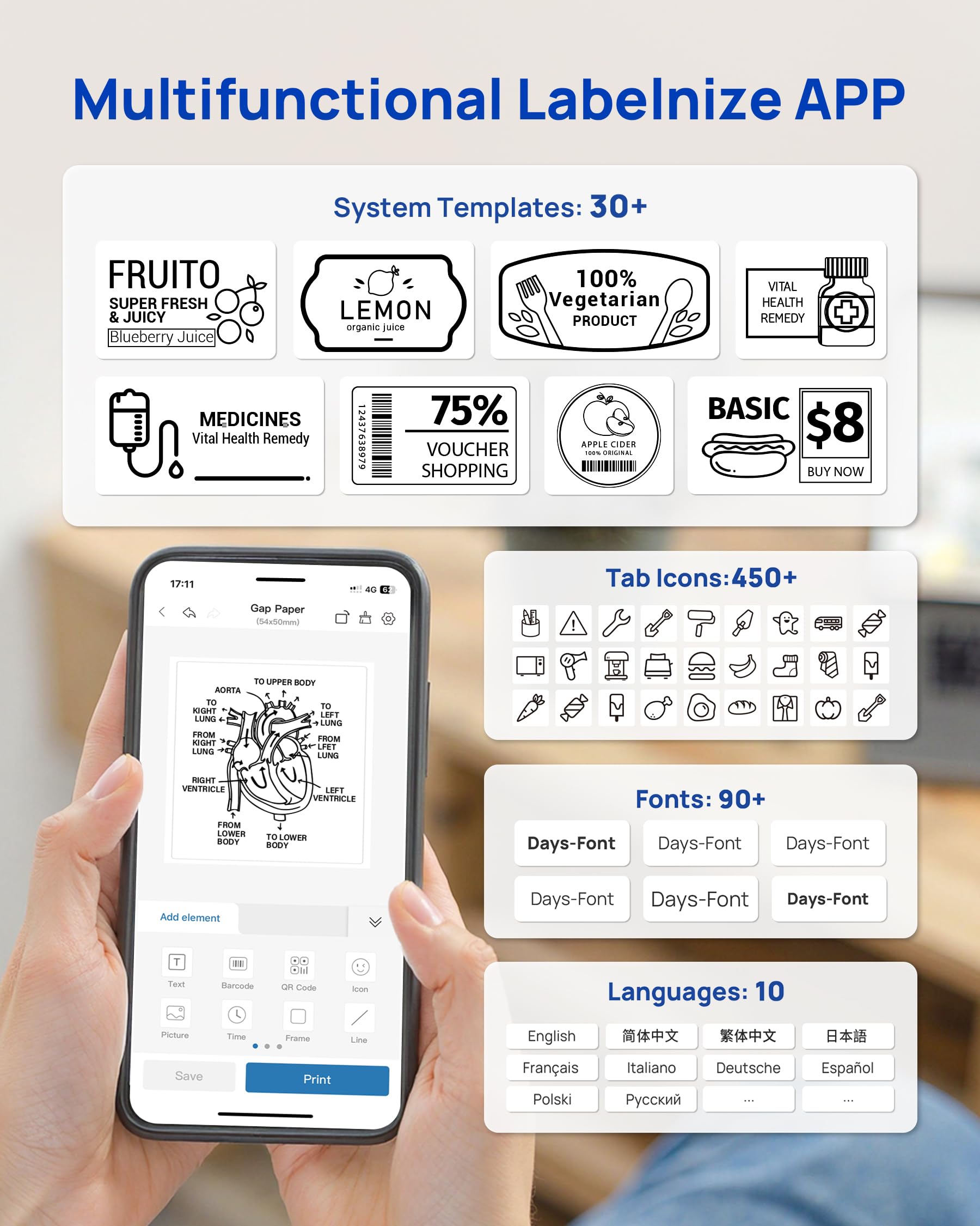 Feature-Rich App – The PM260 label maker with tape includes pre-made label templates and allows you to create custom templates. The label printer app supports QR codes, barcodes, tables, text, icons, and more. Enjoy 90+ fonts, 14+ languages, and 450+ material presets. Pro tip: Use our specialized labels for best results – do not tear the green backing to avoid printing issues.