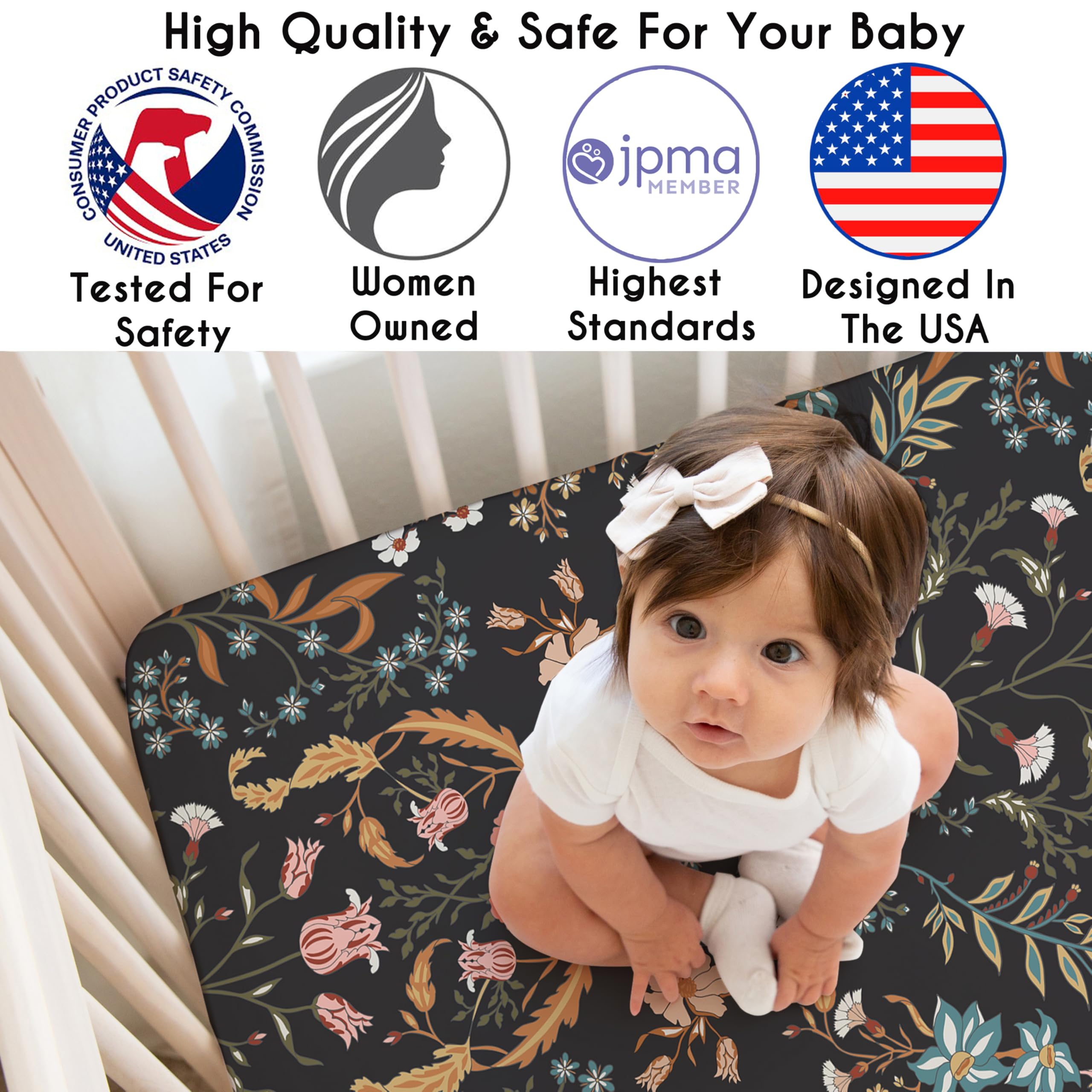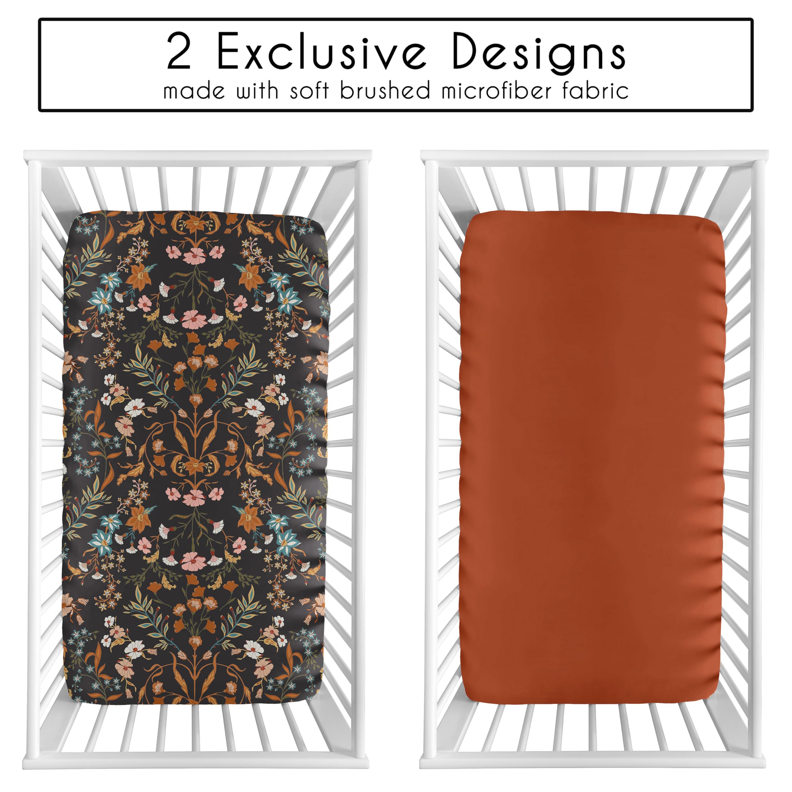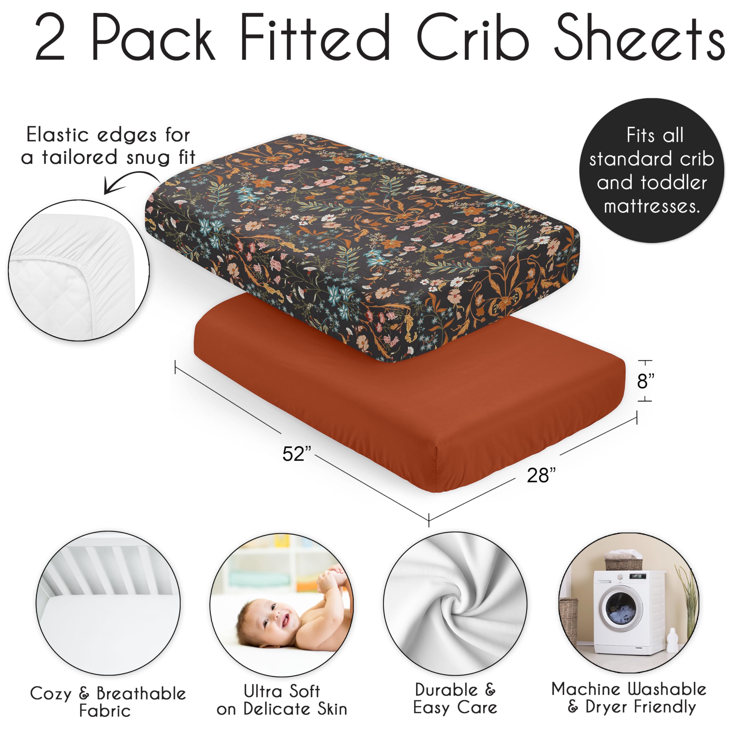 SNUG FIT: Includes: (2) Baby Crib Sheets: 52in. x 28in. x 8in. Our newborn standard crib sheets fit snugly, with premium elastic sewn around the entire bottom edge for a secure fit on most standard sized cribs and toddler beds, to reduce shifting & bunching. This microfiber cribsheets set features an exclusive design of solid rust orange paired with a black blue & green vintage botanical flower, daisy, leaves, wild floral print & is gentle on delicate skin to foster a soothing sleep environment.