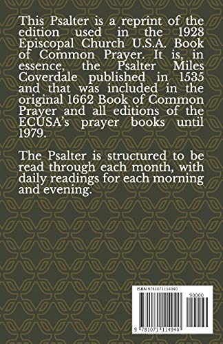 This Psalter is a reprint of the edition used in the 1928 Episcopal Church U.S.A. Book of Common Prayer. It is, in essence, the Psalter Miles Coverdale published in 1535 and that was included in the original 1662 Book of Common Prayer and all editions of the ECUSA’s prayer books until 1979.The Psalter is structured to be read through each month, with daily readings for each morning and evening.