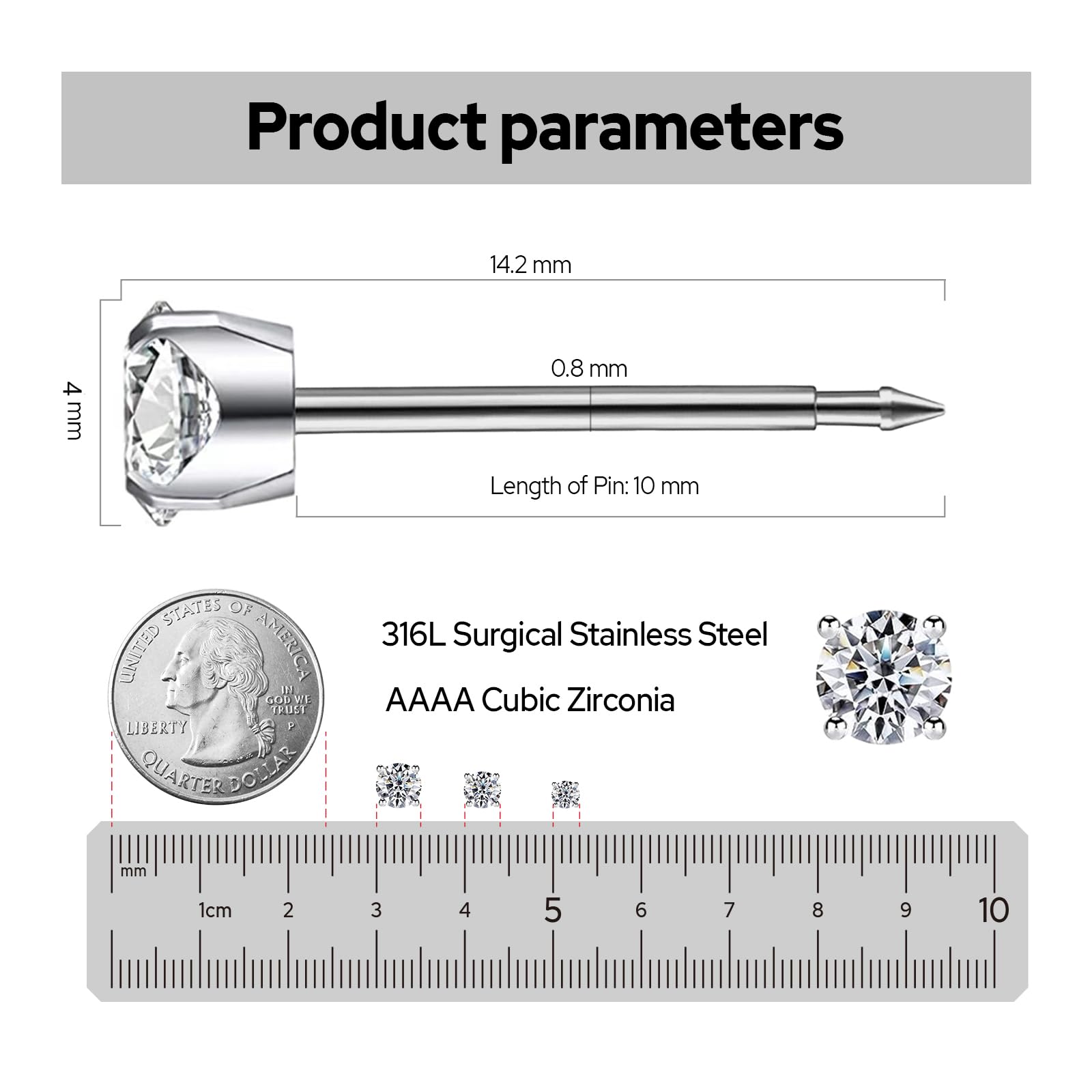 [Size] Cubic Zirconia:4mm; Diameter of Pin: 20 Gauge (0.8mm); Length of Post: 0.43"(11mm); sharp enough to make an actual clean incision thru the flesh.SugarTang offer styles of earrings stud, hoop earrings to change your starter earrings after 4-6 weeks
