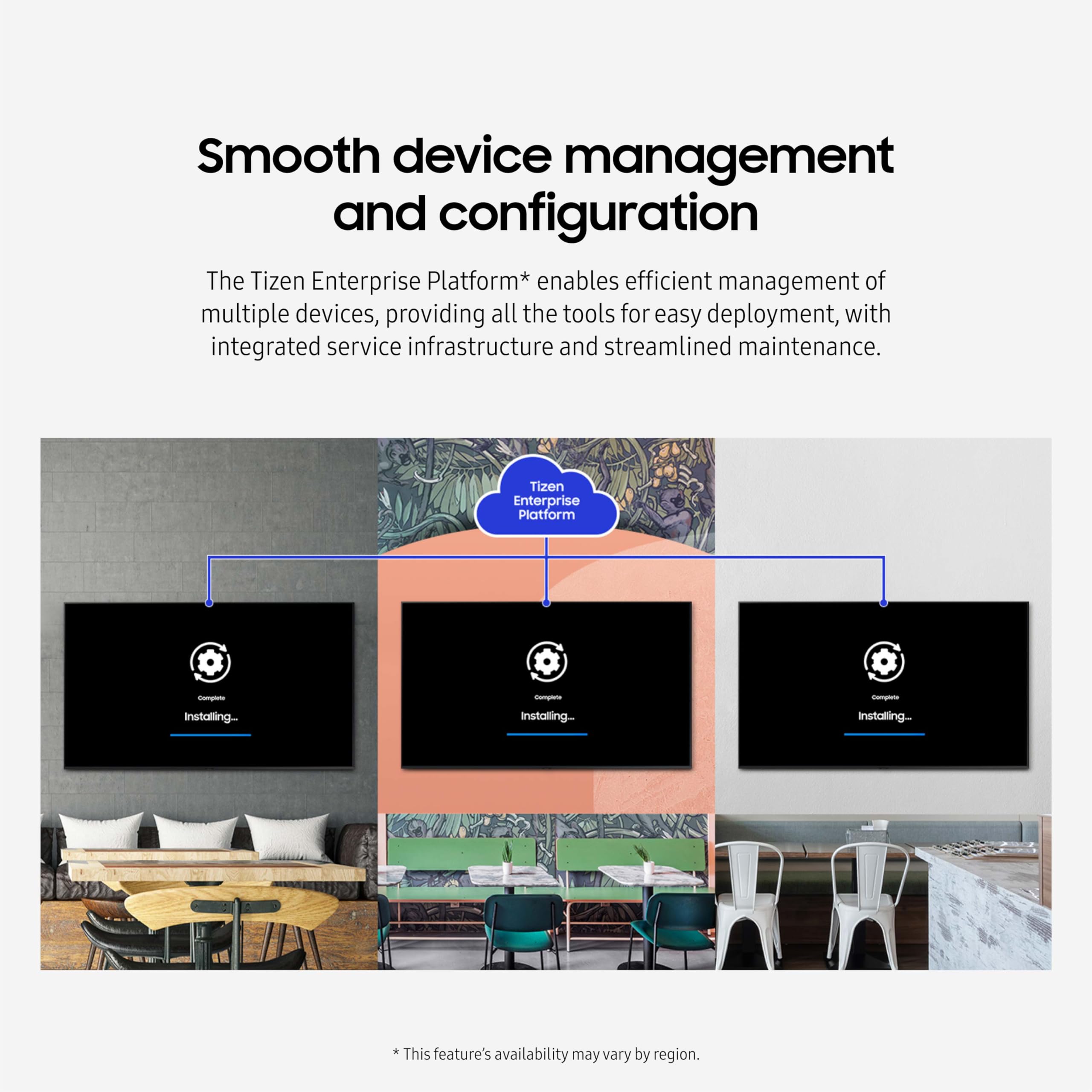 Samsung's BED-H Series is an ideal display solution. The Business TV App allows remote scheduling and display of customized content and the Tizen Enterprise Platform enables efficient management of multiple devices. Powerful Crystal UHD Processor 4K elevates low-res video to UHD, while HDR delivers stunning colors and detail. Slim, 3-sided bezel-less design maximizes space in any environment. ¹Images simulated for illustrative purposes. Actual user experience may differ. Actual UI may differ and is subject to change without notice. ²This feature’s availability may vary by region. ³Images simulated for illustrative purposes. Actual viewing experience may vary according to types of content and format. ⁴Multi-code IR function requires extra remote controller. ⁵Content service availability and user interface may vary according to customer environment. ⁶This feature's availability may vary by region. ⁷Samsung VXT sold separately. This feature's availability may vary by region. The Samsung VXT S-Series plan is only available for the BED-H series. Actual UI may differ and is subject to change without notice. ⁸Additional subscription for Niio Art is required. Please refer to Niio’s subscription plans on their website for details. .