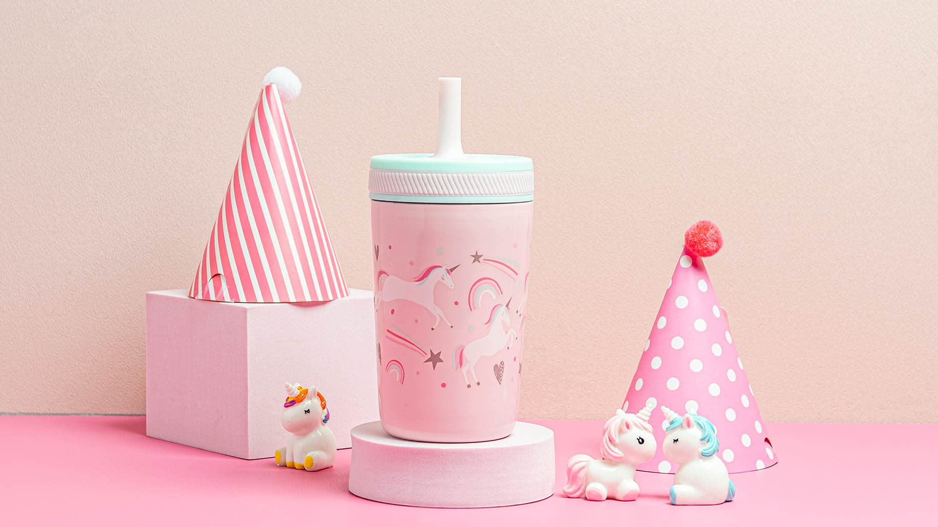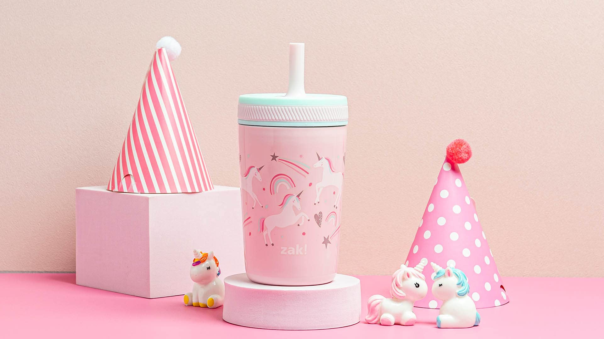 This leak-proof tumbler from Zak Designs makes hydration fun for kids! Durable Materials: The tumbler is made from food-grade, 18/8 stainless steel, and the comfortable straw is made from silicone. Everything is completely BPA free, and the lid can be disassembled for easy cleaning. Leak-Proof Straw: The straw spout has a built-in valve that allows liquid to flow when drinking and prevents spills when the tumbler is tipped over. It's perfect for travel or for young children graduating from sippy cups. Vacuum Insulation: The stainless steel tumbler has vacuum insulation that keeps drinks cold for up to 10 hours, so your water is always refreshingly chilled. The double-wall construction also prevents condensation from forming on the outer walls, eliminating messy water rings.Hydrate Anywhere: The tumbler won't splash or leak and fits in car cup holders, making it ideal to take on the go. At home, you don't have to worry about spills or stains around fabrics or electronics, and drinks stay easily accessible through the straw. Specifications: 12 oz capacity. Vacuum insulated. Made of durable stainless steel and silicone. BPA-Free - Zak is committed to safety. Hand wash tumbler, top rack washer safe, do not microwave. Length: 3.2-inch, Width: 3.2-inch, Height: 6.77-inch. Design: Fanciful Unicorn.