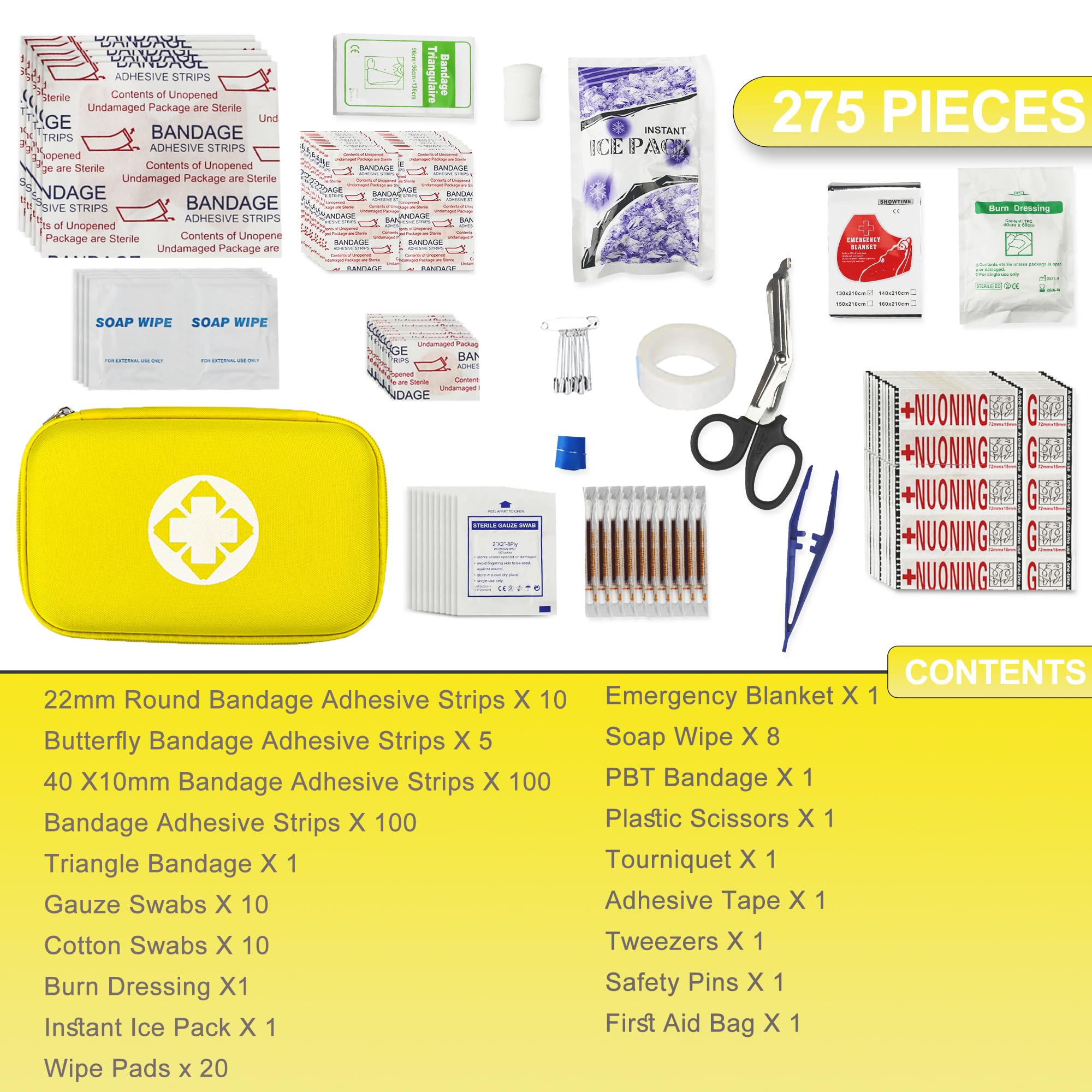 Essential Components: 275Pcs emergency first aid kit contains a variety of crucial items. For eg, adhesive bandages in different sizes to cover minor cuts and abrasions. And there are scissors, tweezers, bandages, pins, emergency blankets, adhesive tape, etc.