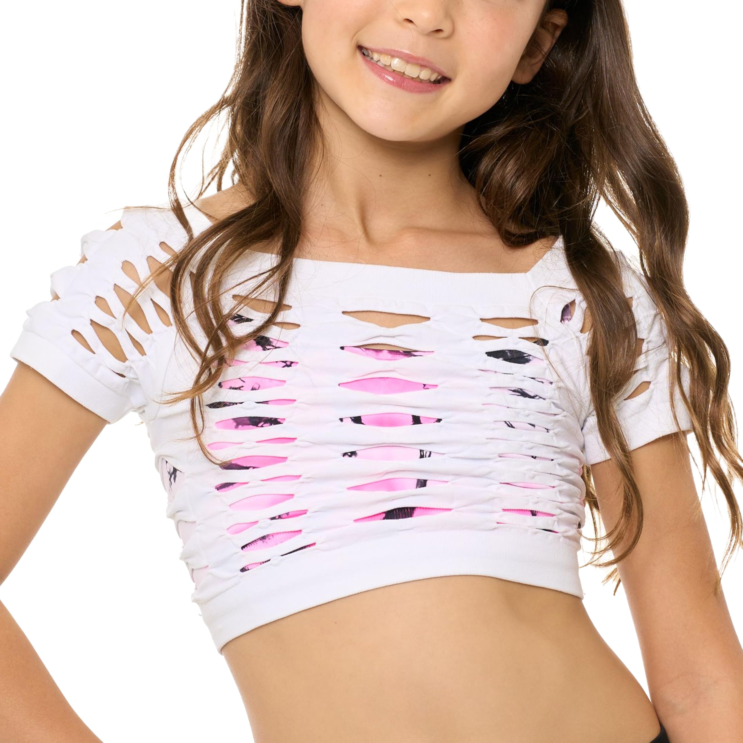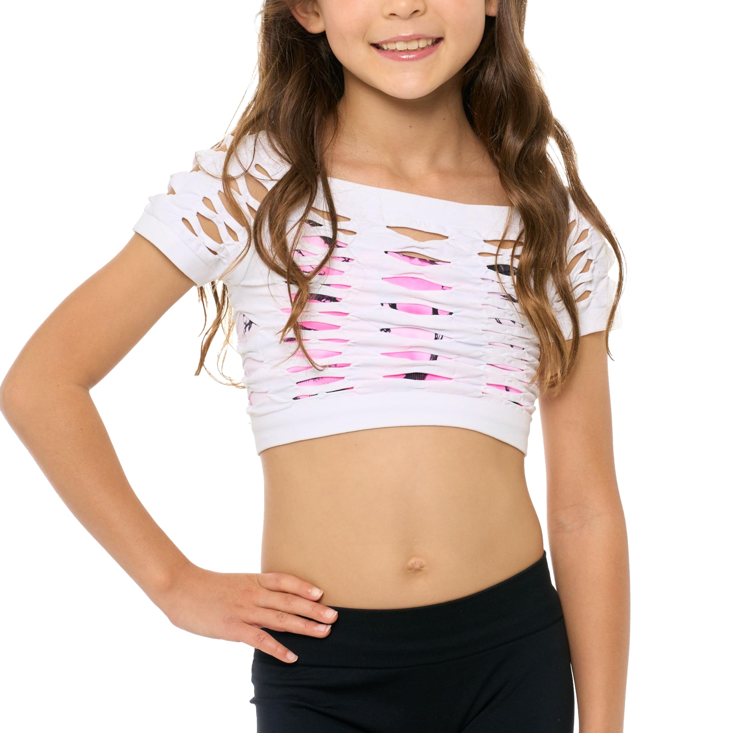 (Trendy and Fashionable Crop Top for School) This modern short sleeve fishnet crop top is perfect for girls ages 10 to 14 who want to stay stylish and confident during the school year, first-day outfits, or school events.