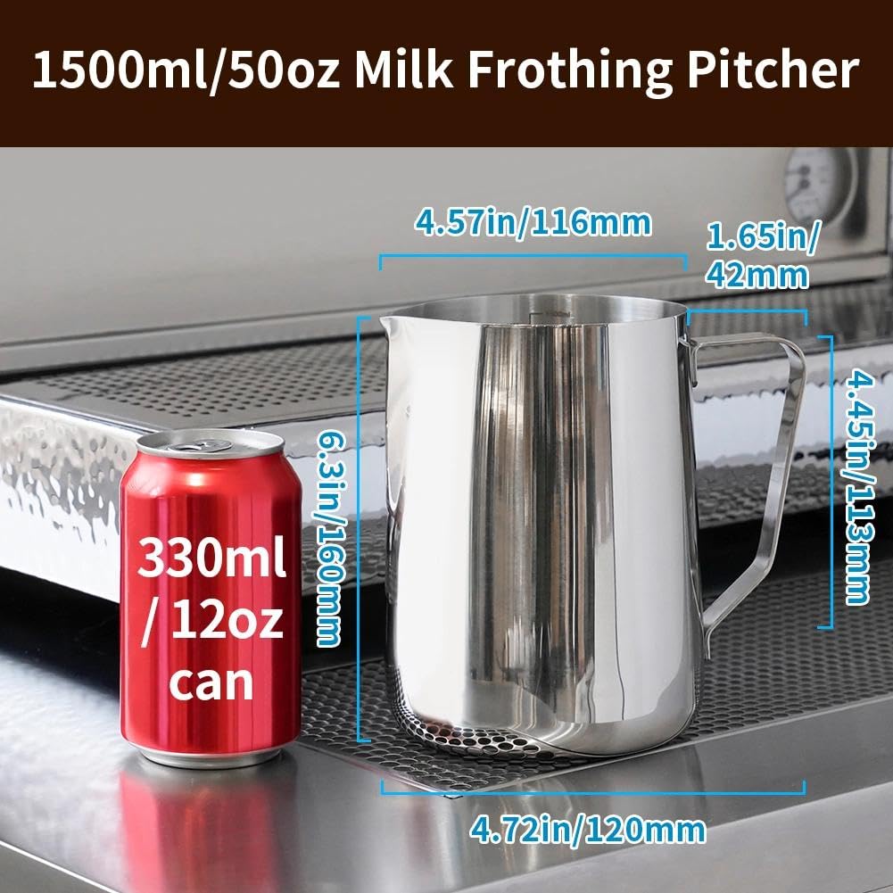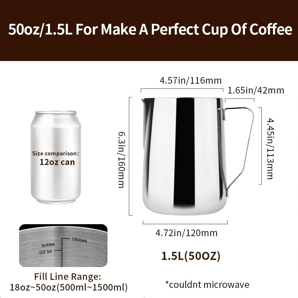 INSIDE SCALE LINES MEASURING: The milk pitcher has clear inside measurement lines(ml/oz), making it easier to control the amount of milk or cream per cup of coffee. 12oz/20oz/32oz/50oz milk frother pitcher can satisfied your different demands. Ideal for foaming or steaming milk, used in espresso and cappuccinos, it can be used for any liquid measuring like water, juices, batter mixes, smoothies etc.