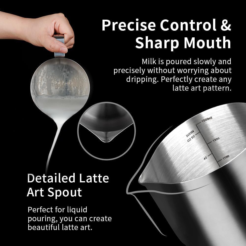 DRIPLESS SPOUT DESIGN: The dripless spout allows you pour milk foam smoothly and precisely without dripping. You can practice and create your own beautiful latte artwork easily!