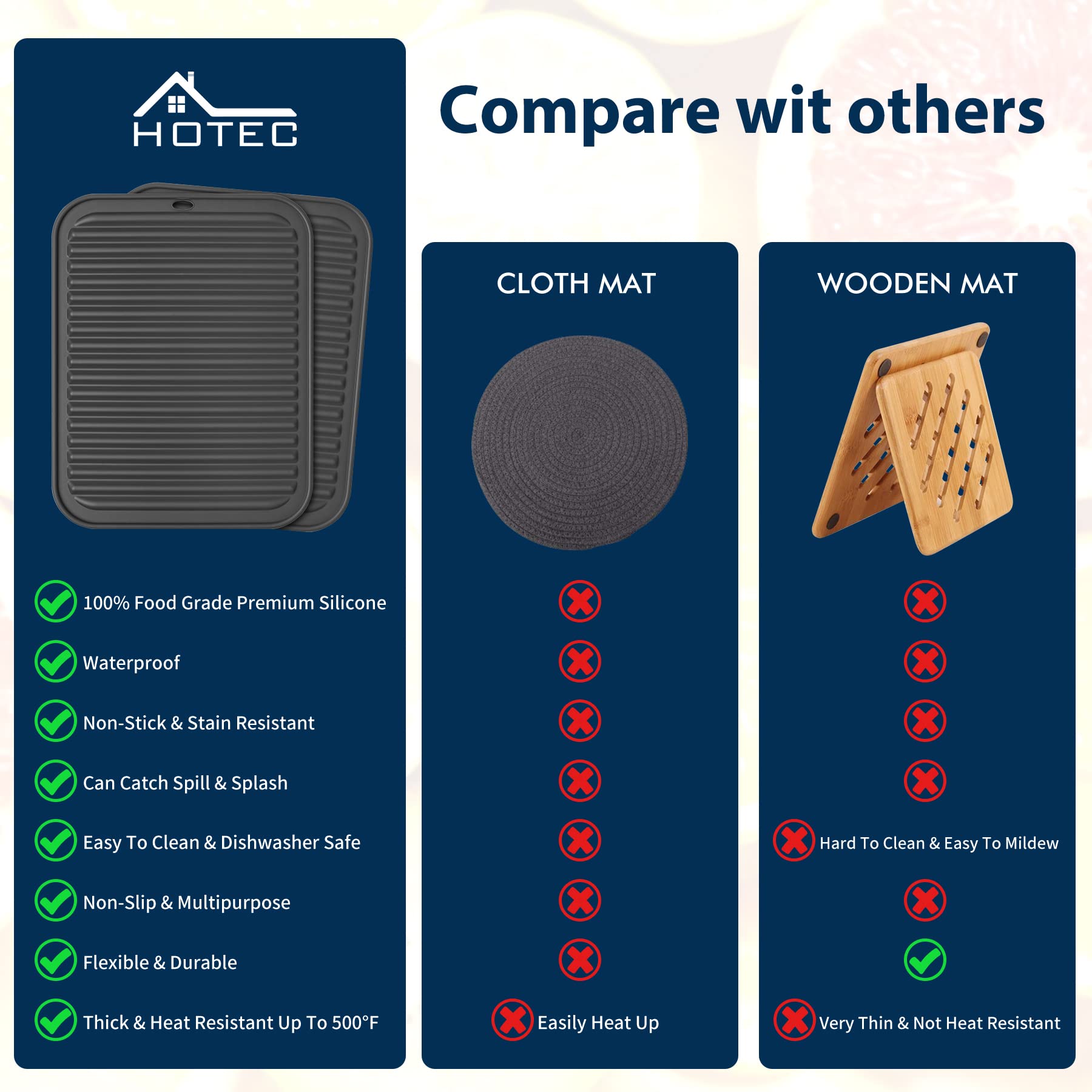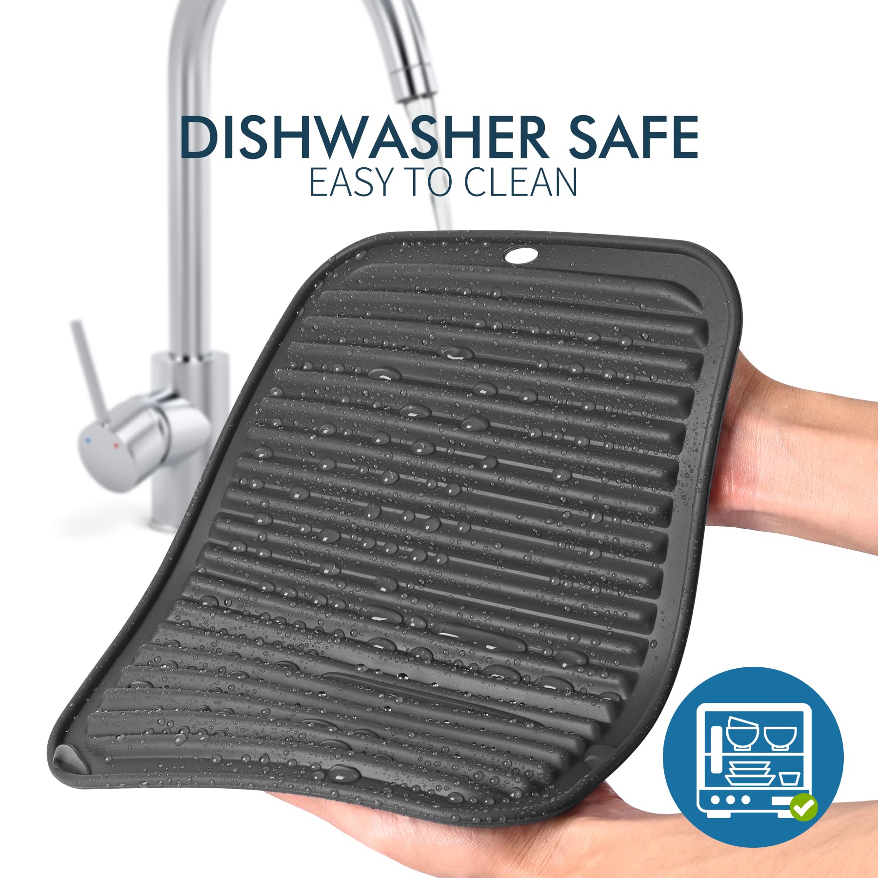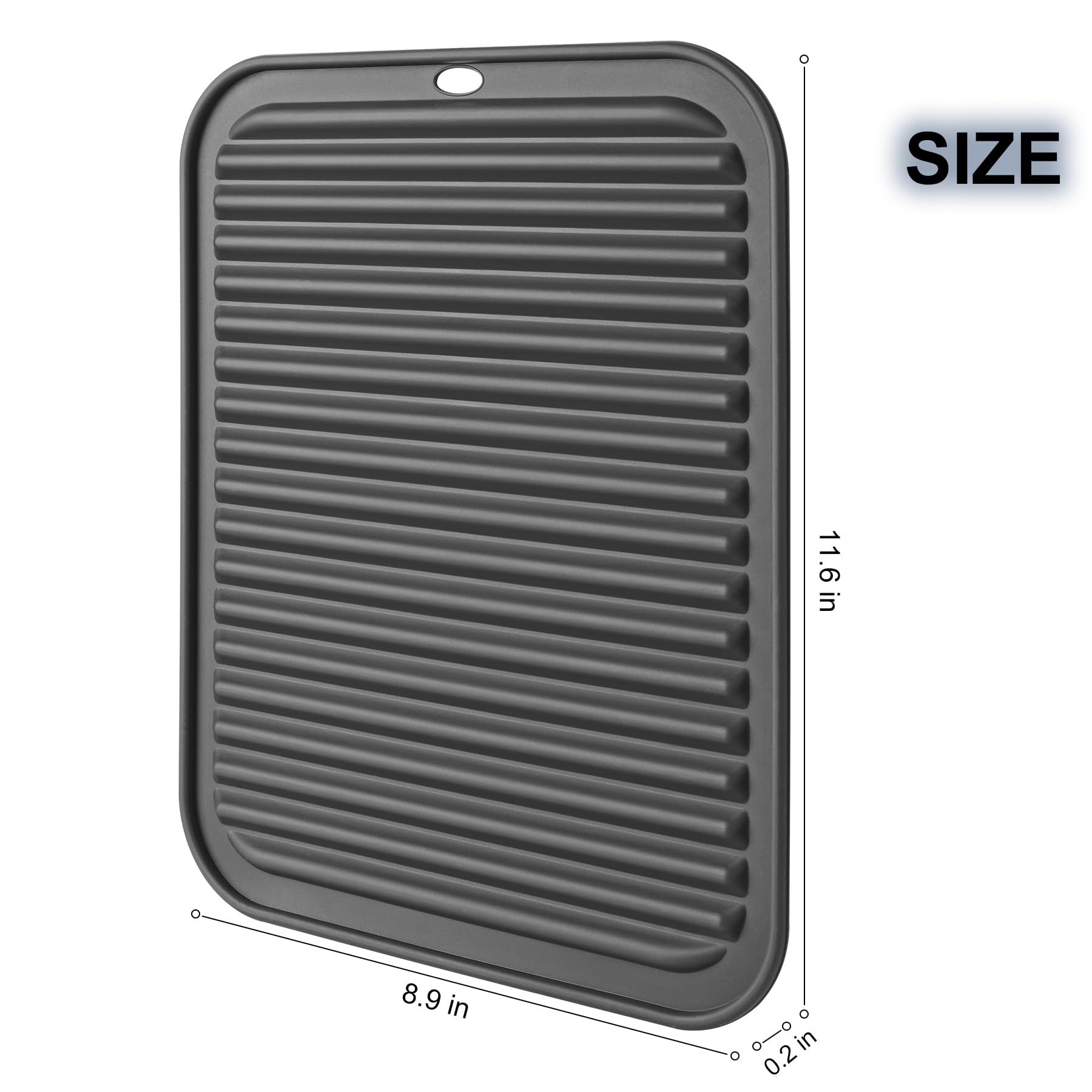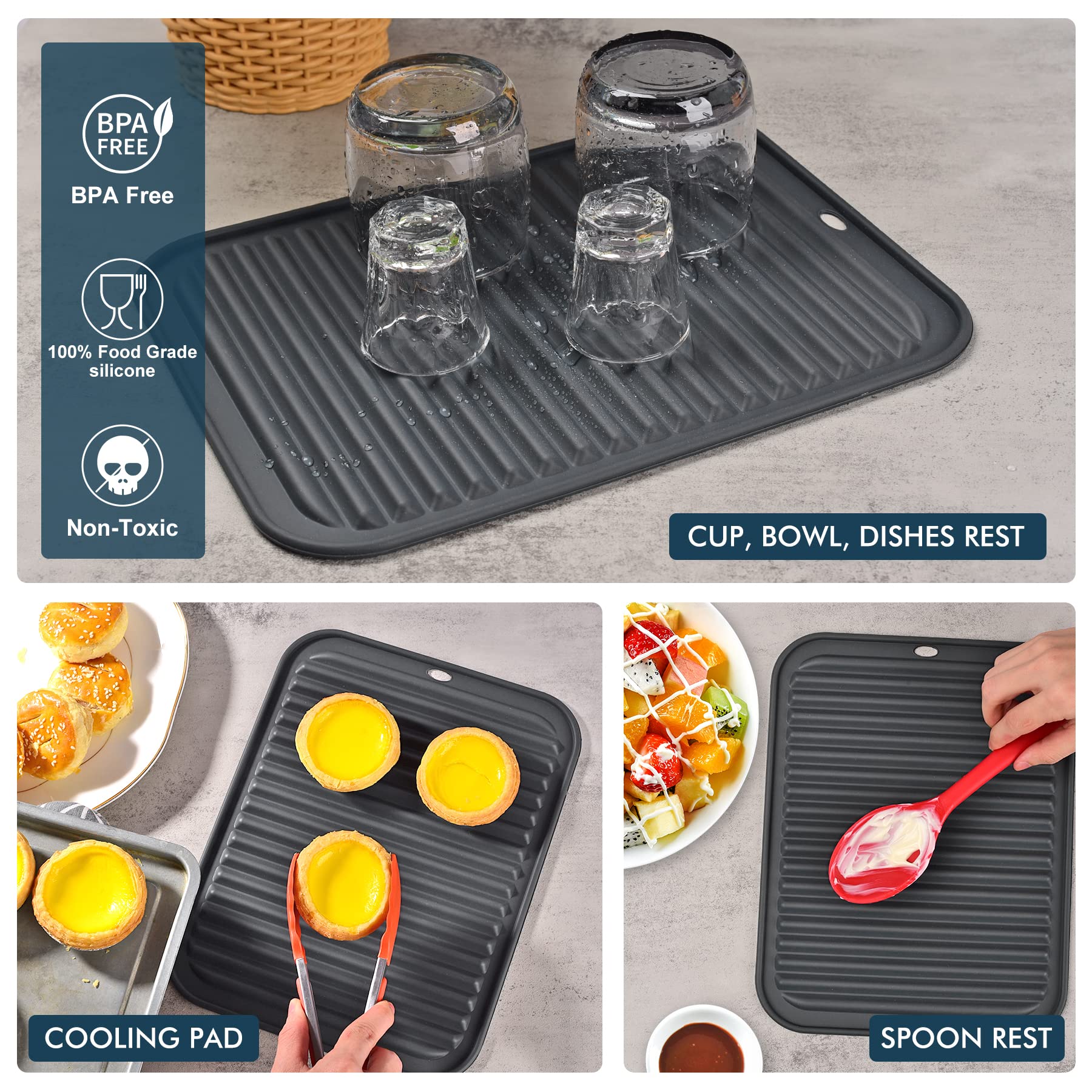Wide Variety of Uses: Non-slip, flexible and soft, great choice for drying mat or placemat,like if necessary, somewhere to rest errant spoons,even act as excellent dish mats. if you want something nice-looking protecting your counter and it perfectly fits the bill. The silicone is easily wiped after spots or spills; the double-sided grooves allow air space so the mat grips well and is not heat conducive.