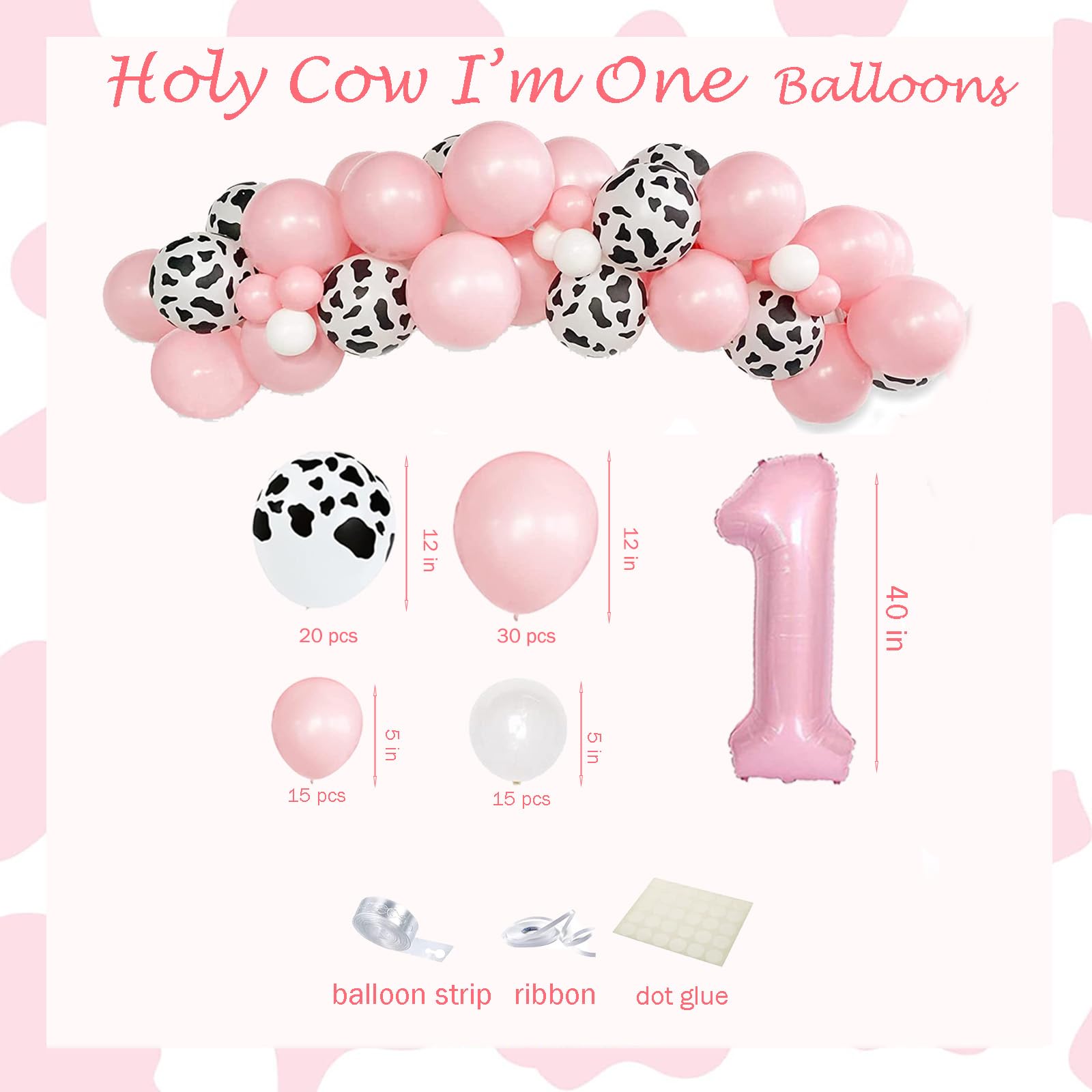 [HOLY COW IβM ONE BIRTHDAY DECORATIONS INCLUDES] - 30 x 12β pink latex balloons | 30 x 5β latex balloons | 20 x 12β cow print latex balloons | 1 x backdrop | 1 x glitter banner | 1 x monthly photo banner | 1 x highchair banner | 1 x 40β number β1β foil balloon | 3 x white balloon boxes | 2 x βONEβ cutouts | 10 x cow cutouts | 1 x cake topper | 1 x cow crown | 1 x poster | balloon strip | glue dots | ribbons