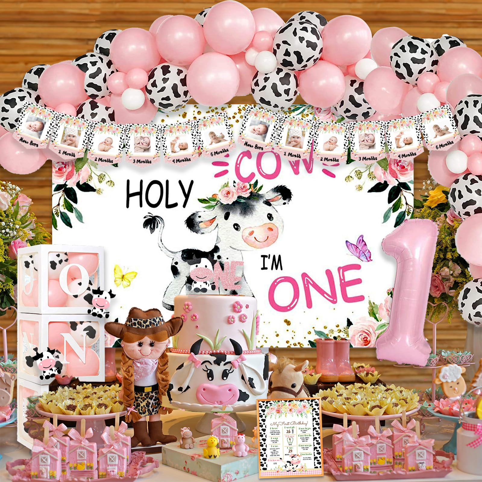 [AN ADORABLE COW 1ST BIRTHDAY PARTY] β Your beautiful baby girl is about to turn one. What better way to celebrate than a Holy Cow Iβm One Birthday Theme? Cow print is such a unique vibe to convey your blessings. The eye-catching highchair banner and crown are the best photo prop. Holy cow, where does this lovely princess from?