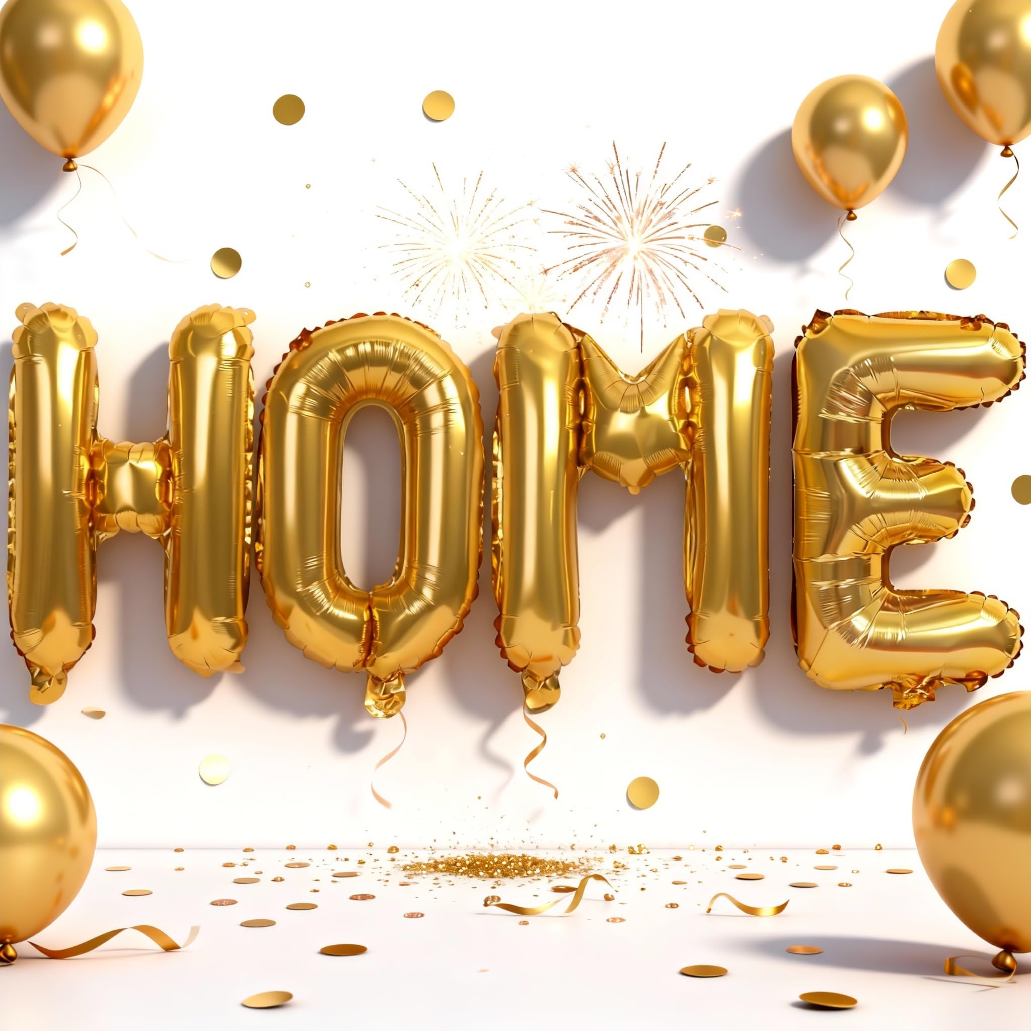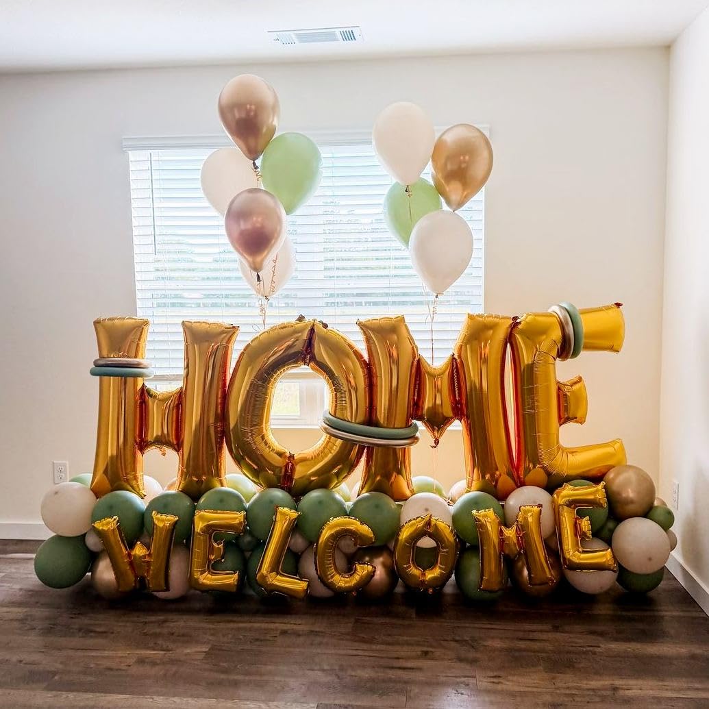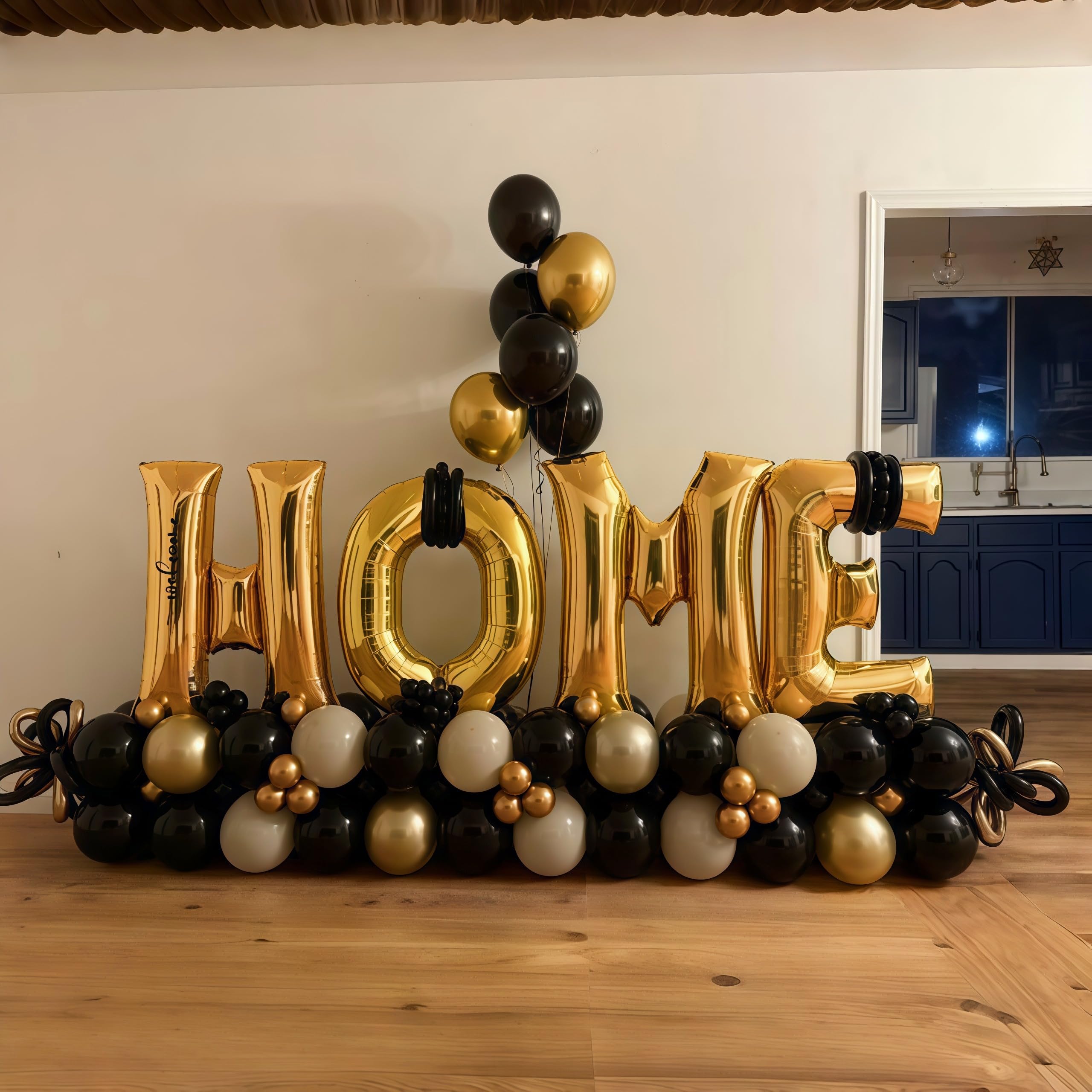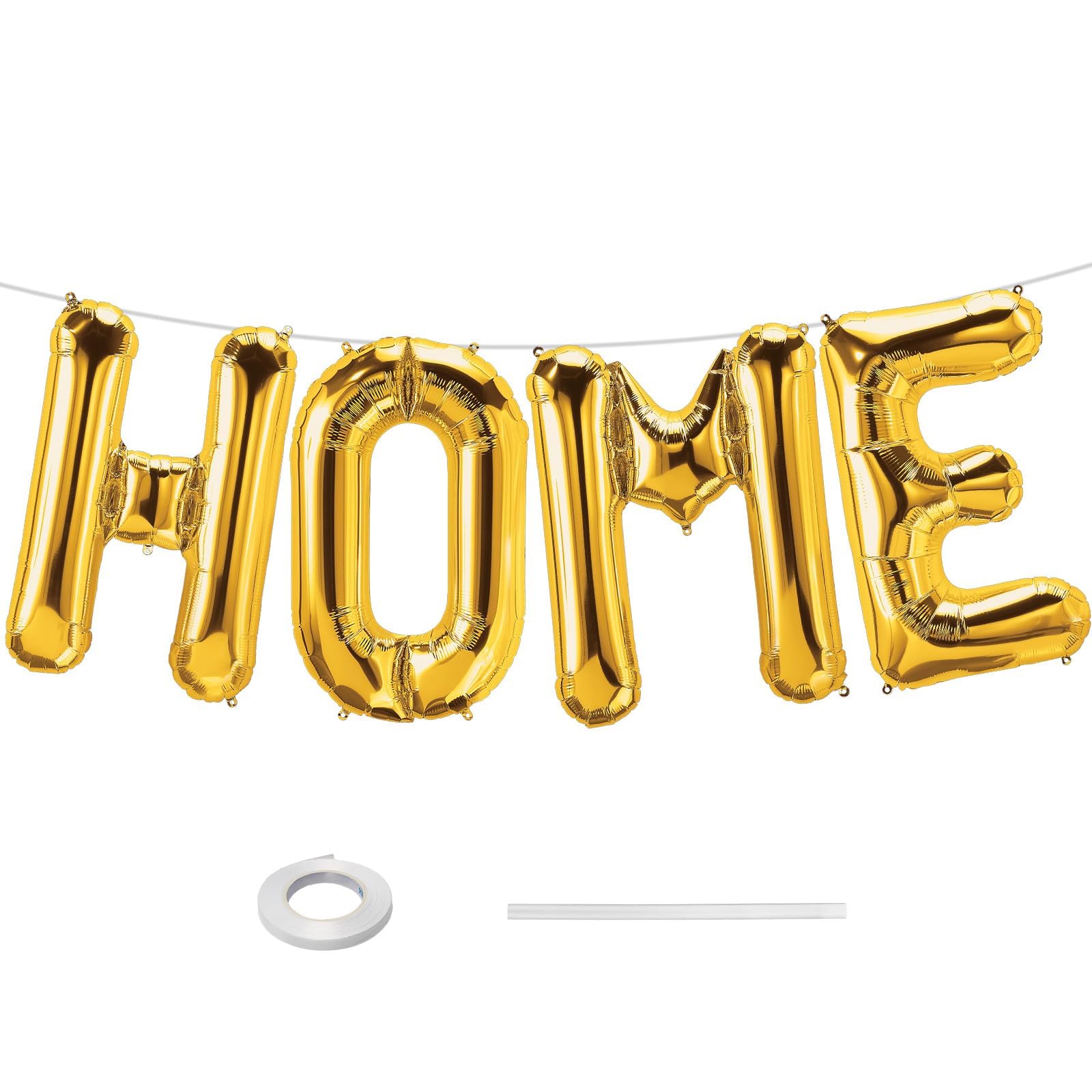 40 Inch Large HOME Foil Letter Balloons Kit is Perfect Gift for Boys Girls Women Men Housewarming New Home Welcome Home Sweet Party Decorations Supplies and other indoor and outdoor activities. Specifications: 🎉 Material: Aluminium Foil 🎉 Quantity: 4 pcs 🎉 Size: 40 Inch What You Will Get: 🎁 Giant Letter HOME Balloons pcs 🎁 Balloon Ribbon 1pc Features: 🎈 Super cute and pretty HOME foil letters balloon with metallic texture appearances. 🎈 The alphabet HOME foil balloons are made of high-quality foil, which is safe for children and can be used multiple times. 🎈 These house warming party decoration balloons can be filled with air or helium, the latex balloons can float when filled with helium. 🎈 There are holes on the bottom and top of the letter HOME foil balloons, you can use the balloon ribbon to hang the balloons or stick it on the wall. Warm Reminder: ⚠️ Please don't over inflate the HOME foil balloons, 80%-90% is the best. ⚠️ Keep the balloons away from the flame, lemon juice or sharp objects, avoid exploding. ⚠️ Due to the light and screen difference, the item's color may be slightly different from the pictures. ⚠️ Due to manual measurement, the size and weight may have a certain error. ⚠️ This product is not suitable for children under 12.