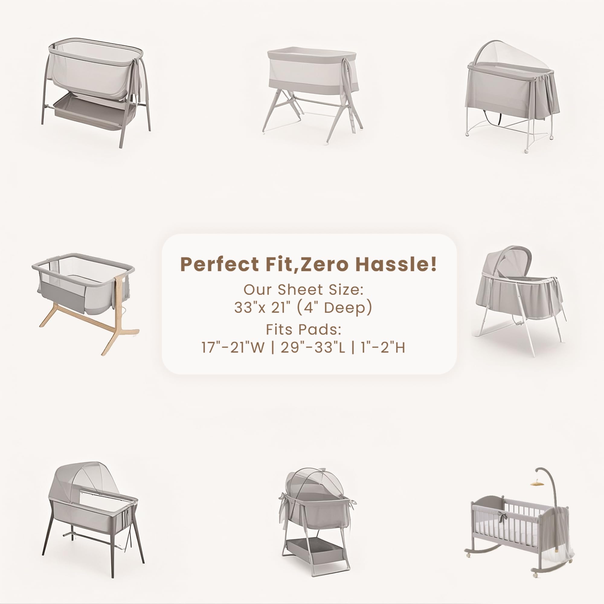 Universal Fit for Most Bassinet Mattresses: These bassinet mattress sheets (33" x 21") fit most bassinet mattresses, including oval, round, rectangle, and hourglass shapes. The elasticized edges provide a snug, secure fit for added safety