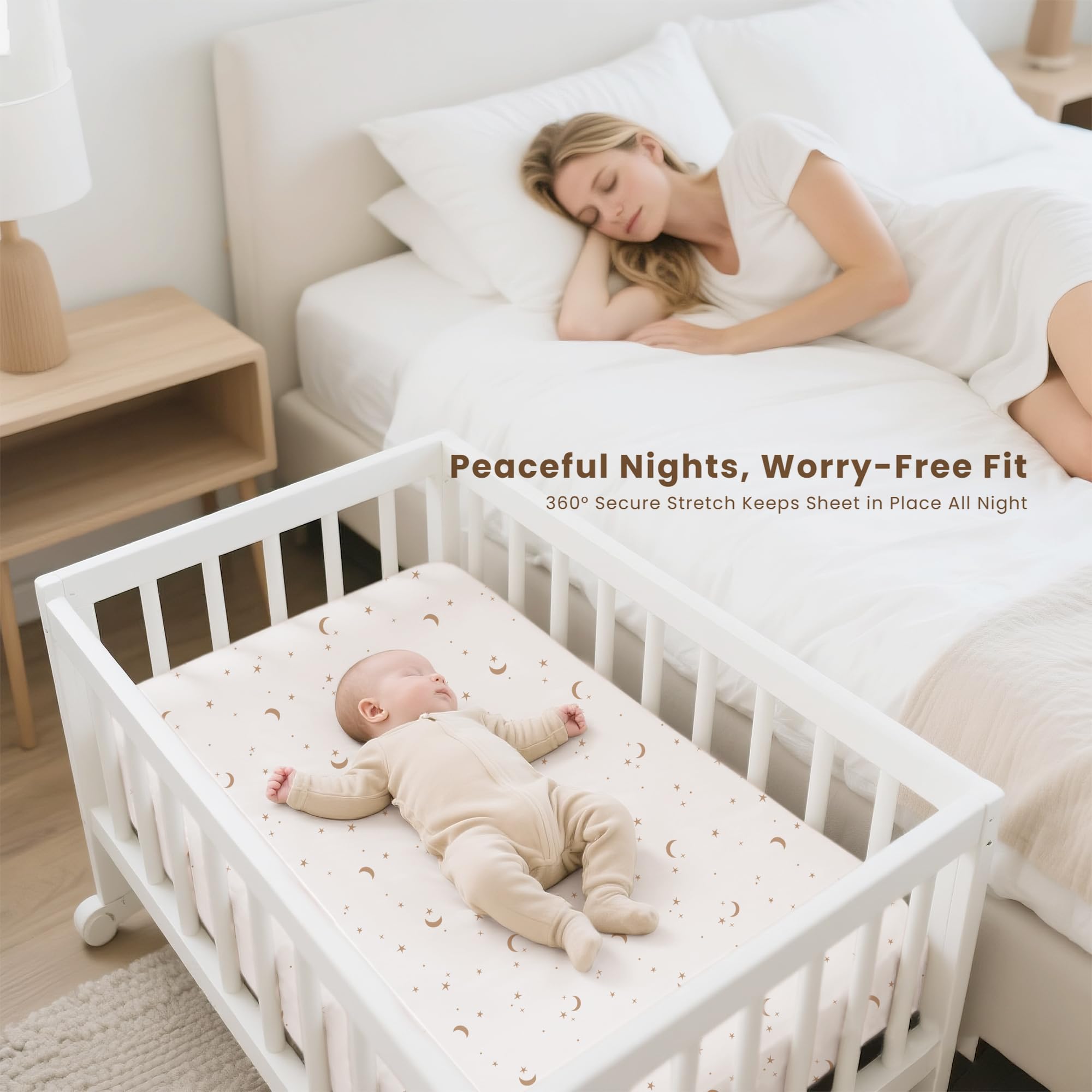Stretchy & Soft: Made from 89% polyester and 11% spandex, Konssy bassinet sheets are ultra-soft and stretchy. They offer a breathable feel, absorb sweat, and promote airflow, ensuring your baby stays cozy and comfortable for restful sleep