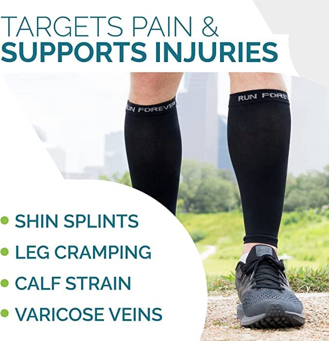 Multiple designs, colors & sizes: Run Forever Sports calf compression sleeve for men & women has many engaging colors and caters to all sizes, from small, to xl, to plus size!