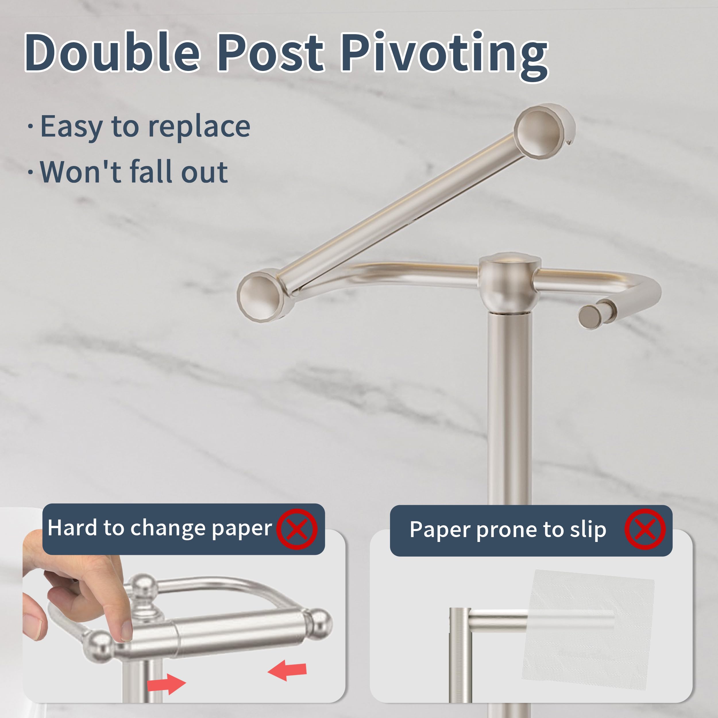 [Double Column Rotation Design] Toilet paper stand's double column rotation design is fits most roll sizes, replacement the toilet paper more effortless. Toilet paper can be firmly fixed and won’t fall off from bathroom tissue holder