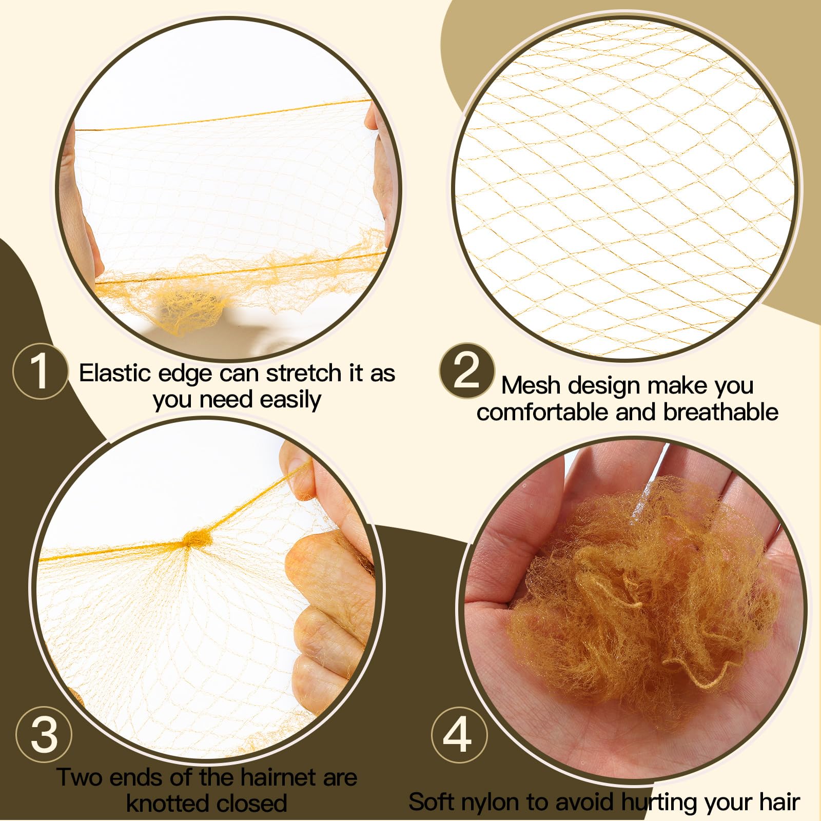 Reasonable Design Bun Net: The invisible hair nets are designed with good elastic edge that can suit different head size and hair length and will not make you feel tight. You can stretch it to your desired length and shape easily. The mesh design make you more comfortable and breathable. Soft enough to avoid hurting your hair. The two ends of the hairnet are knotted closed.