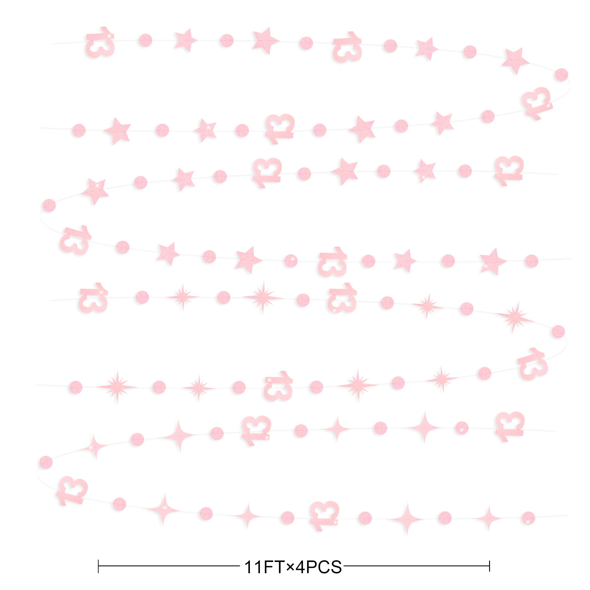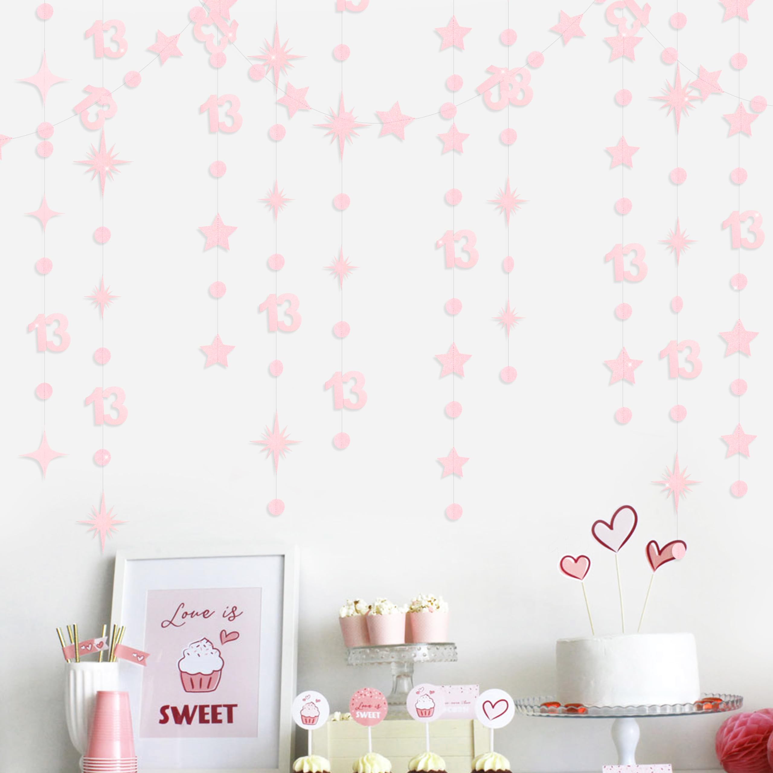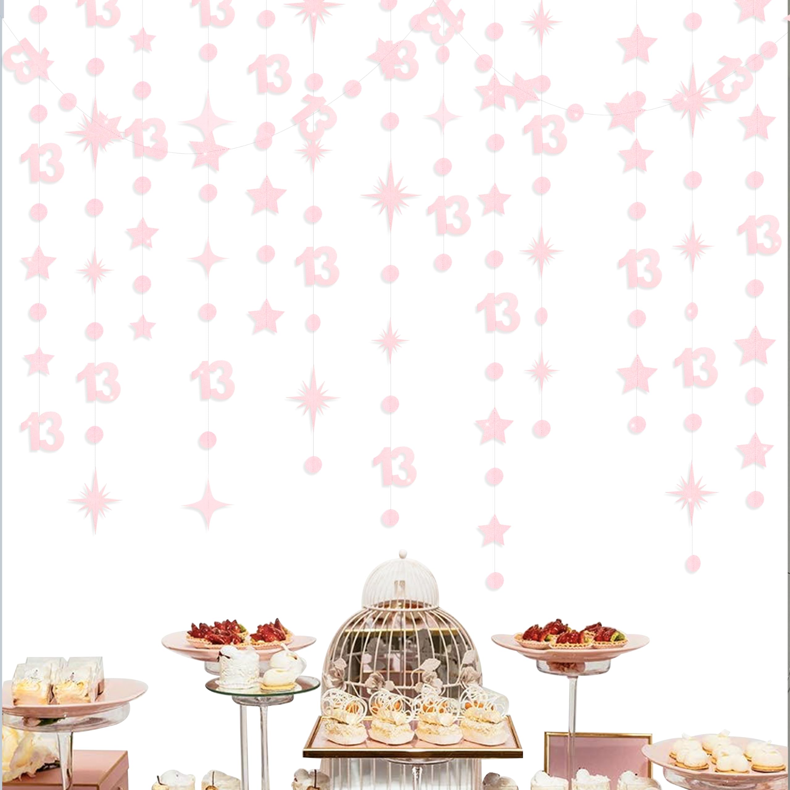 👍 Package includes - 4 strings of 11.5 feet/3.5 meters glitter light pink number 13 sparkling twinkle star and circle dots garlands , totally is 46 feet/14 meters