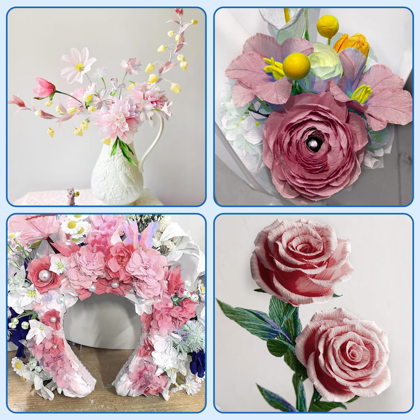 【DIY Use】 You can share the colorful crepe paper sheets with your children, friends, family, or anyone who likes handicrafts, to do craft projects with your children and friends to build a warm parent child relationship, friendship. Note: Use tape and other adhesives carefully; keep away from water to avoid fading or breaking.