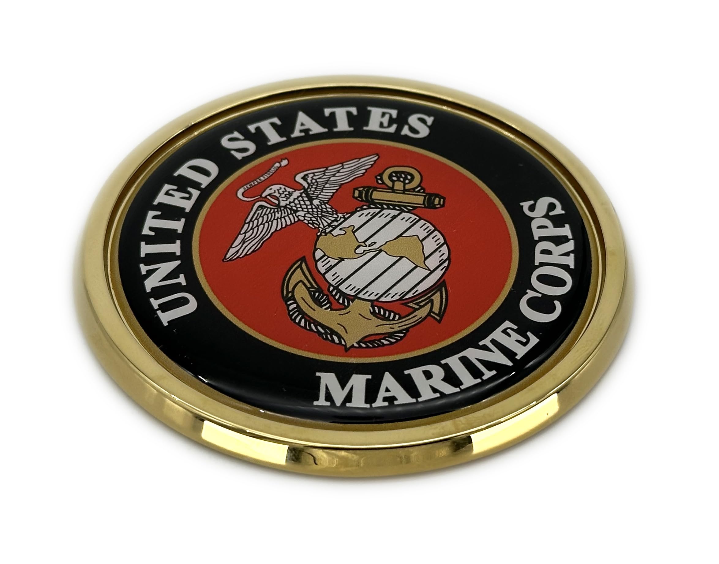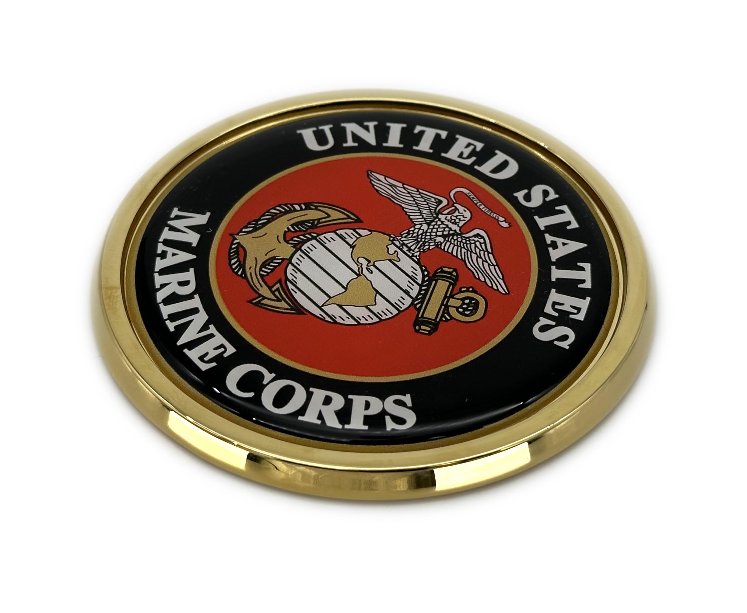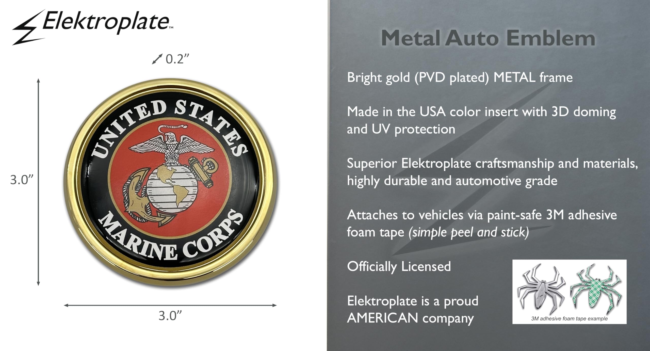 Officially Licensed U.S. Marine Corp crest shiny auto emblem (Small - 3.0" x 3.0" x 0.2") by Elektroplate. An all-metal emblem with a bright gold PVD plated metal frame and a full-color domed decal insert. The decal is UV-protected with a laminated 1/8” thick PVC made to withstand any outdoor conditions. The emblem attaches via paint-safe 3M adhesive foam tape. All Elektroplate car emblems are comprised of a chrome metal finish made to withstand harsh outdoor conditions. This auto emblem will look brand new for years to come. Our high-end auto emblems are the perfect way to showcase your pride everywhere you drive. In addition, all Elektroplate chrome emblems are packaged in elegant retail packaging to make a great gift!