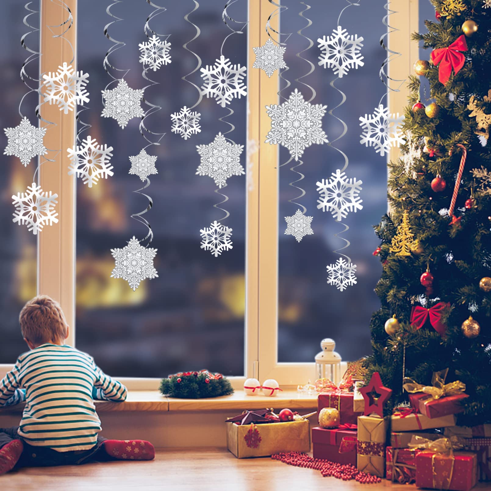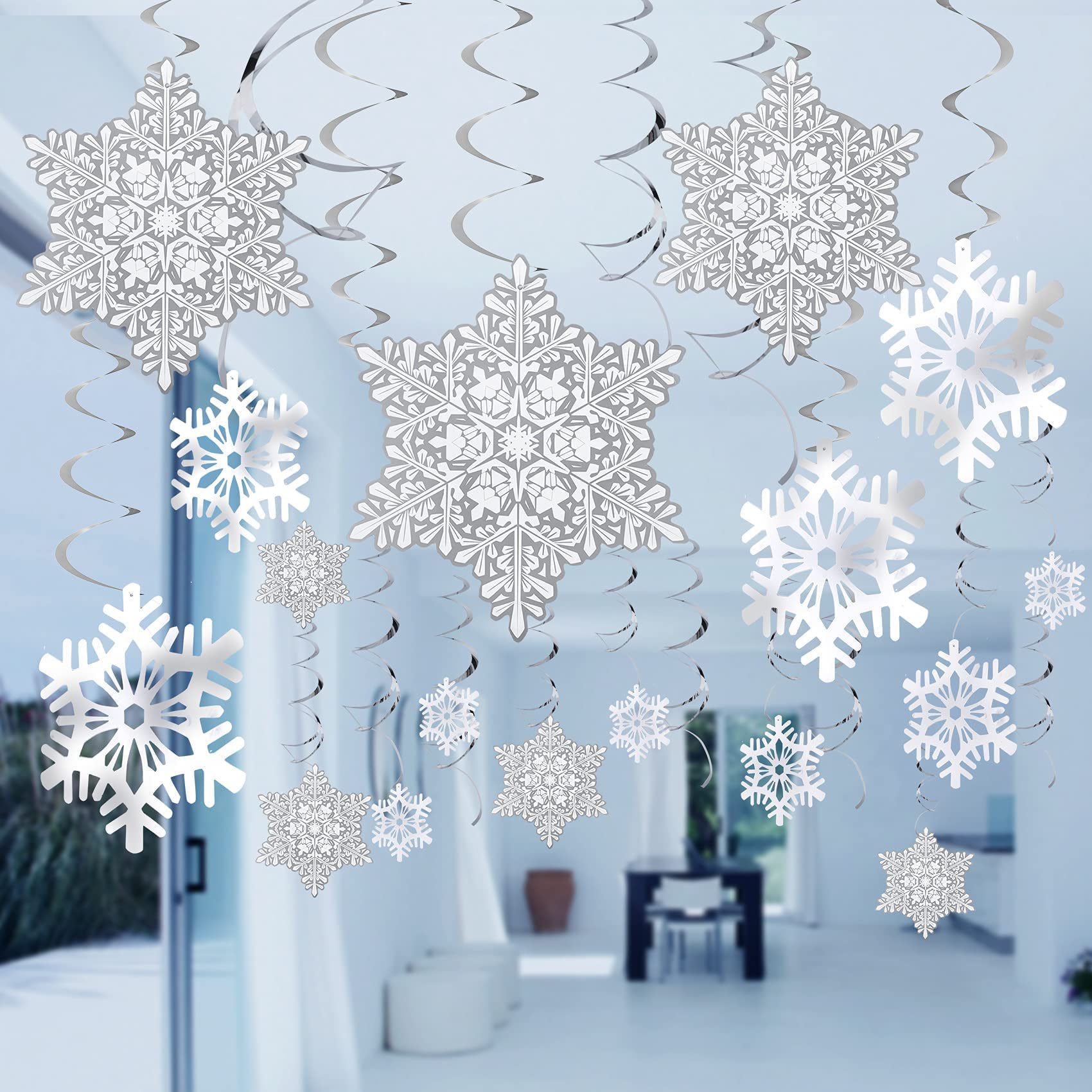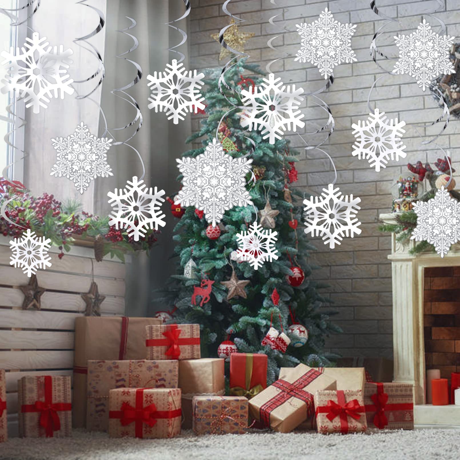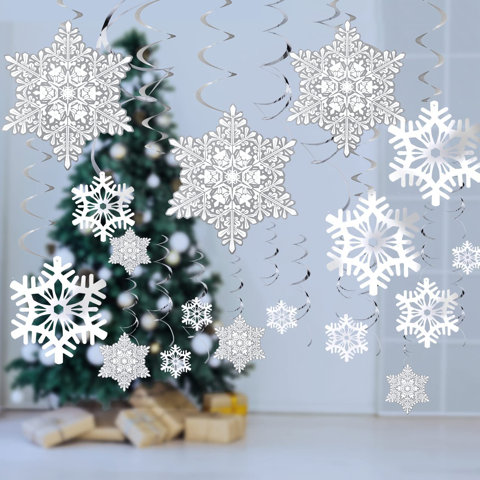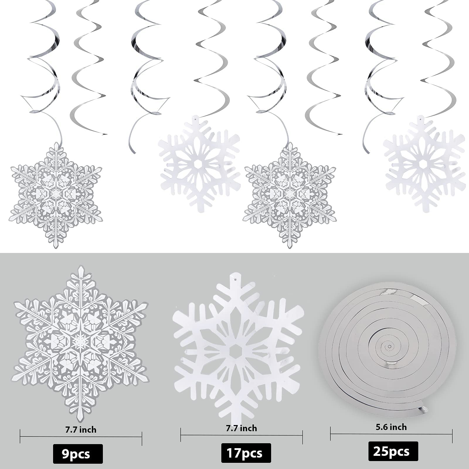 Snowflake Decorations: Contains 51pcs exquisite hanging swirls snowflake ornaments(17 pcs PET snowflakes, 9 pcs spiral printed snowflakes, and 25 silver spiral strips); Hanging these christmas decorations on your party will bring more festive atmosphere