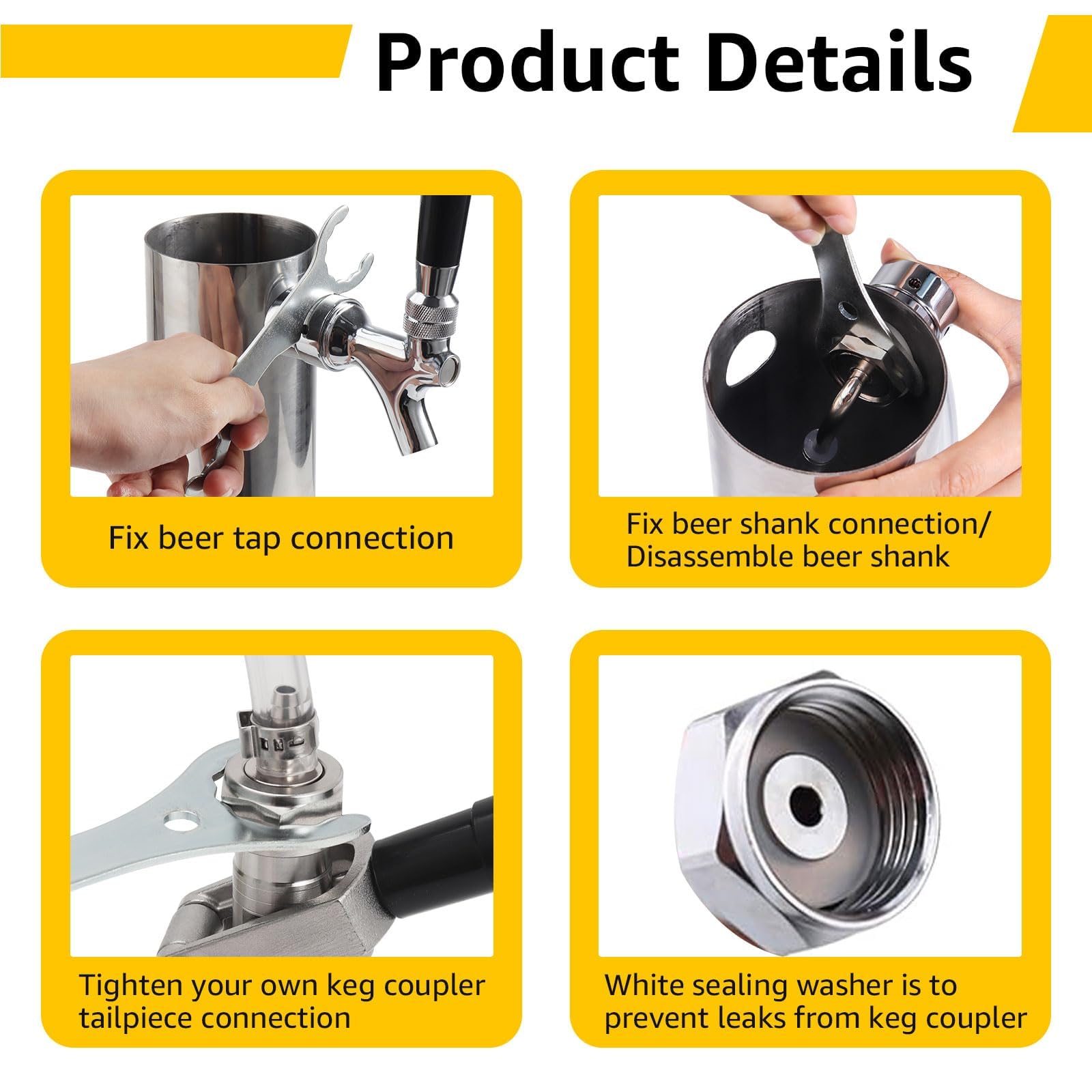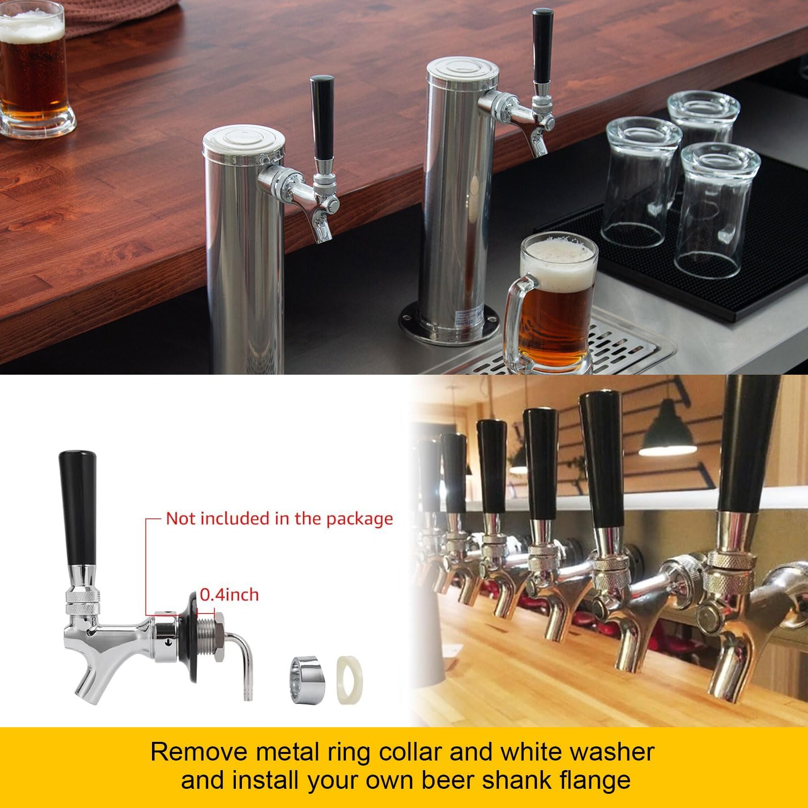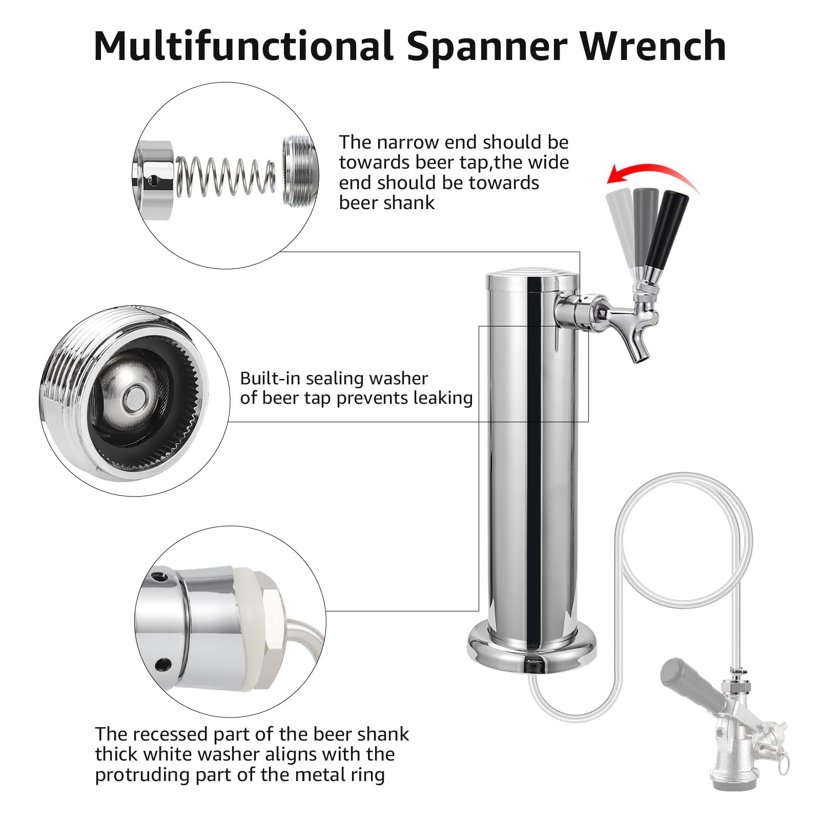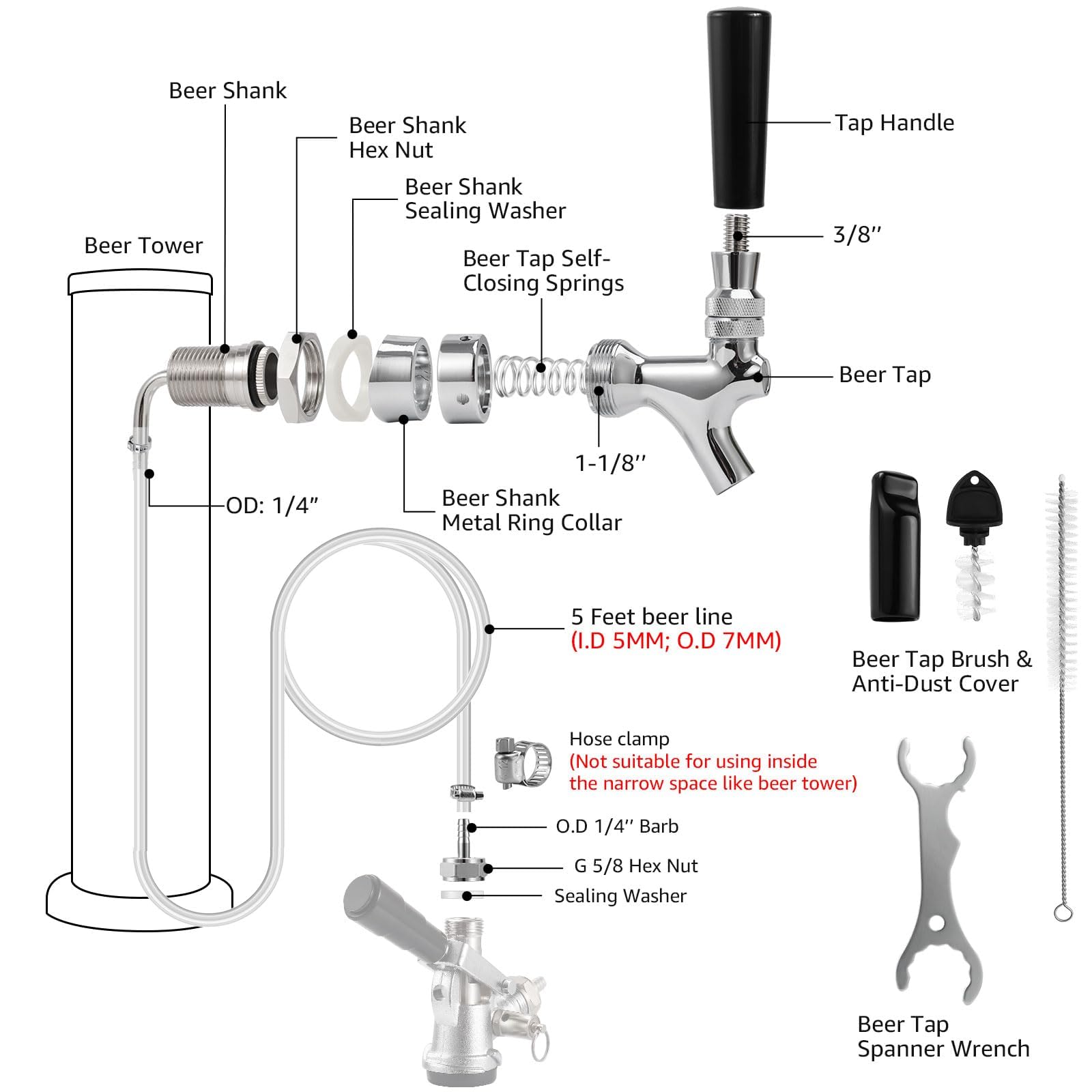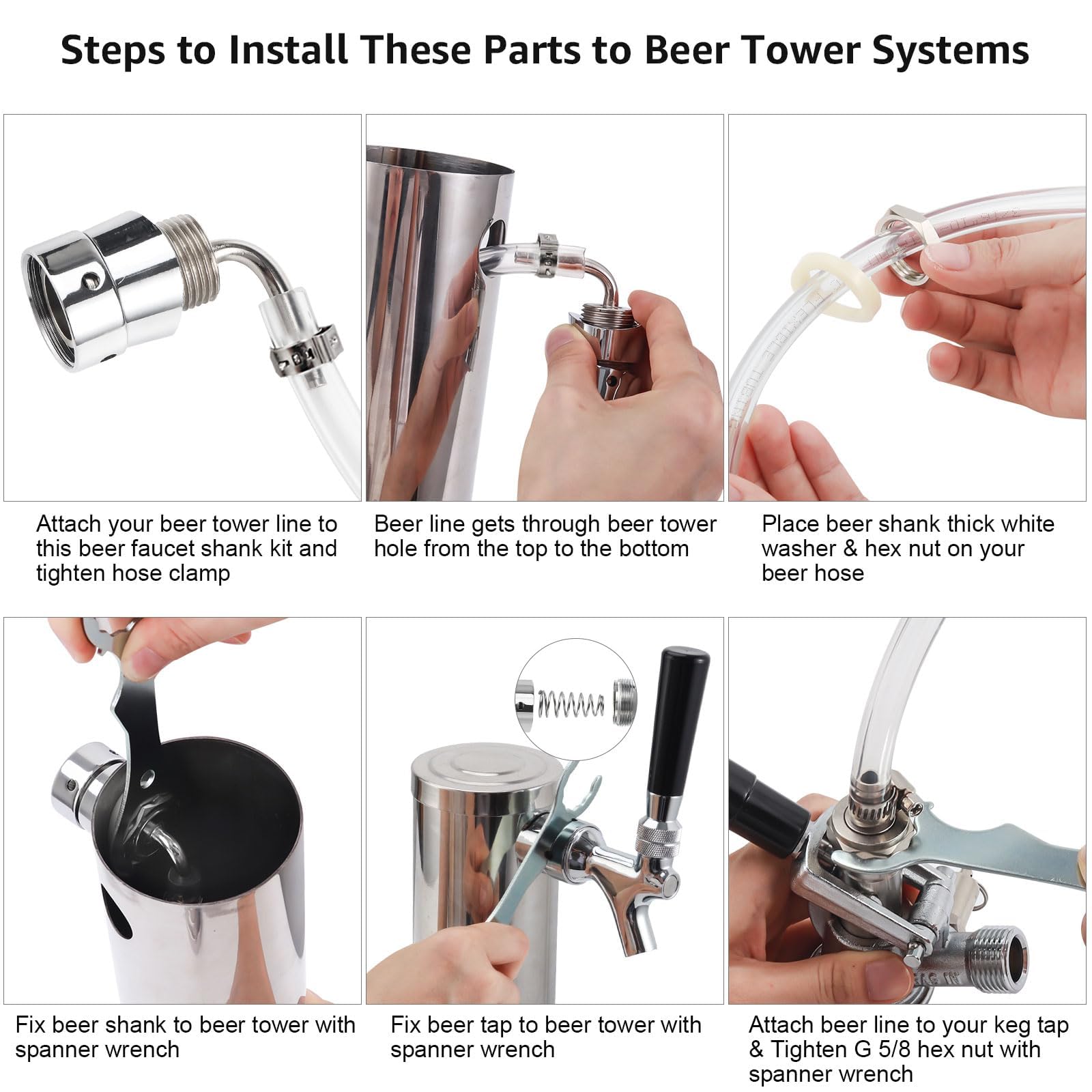 Easy Installation on Beer Tower – Hassle-Free Setup: Connect the beer line to the shank and tighten the one-time hose clamp →Feed the beer line through the beer tower hole, then slide on the white washer and hex nut→Secure the beer tap shank to the tower using wrench pliers for a leak-free seal-----quick setup with a tight, professional fit.