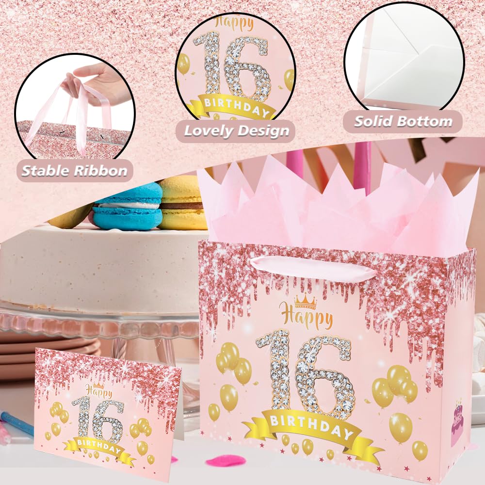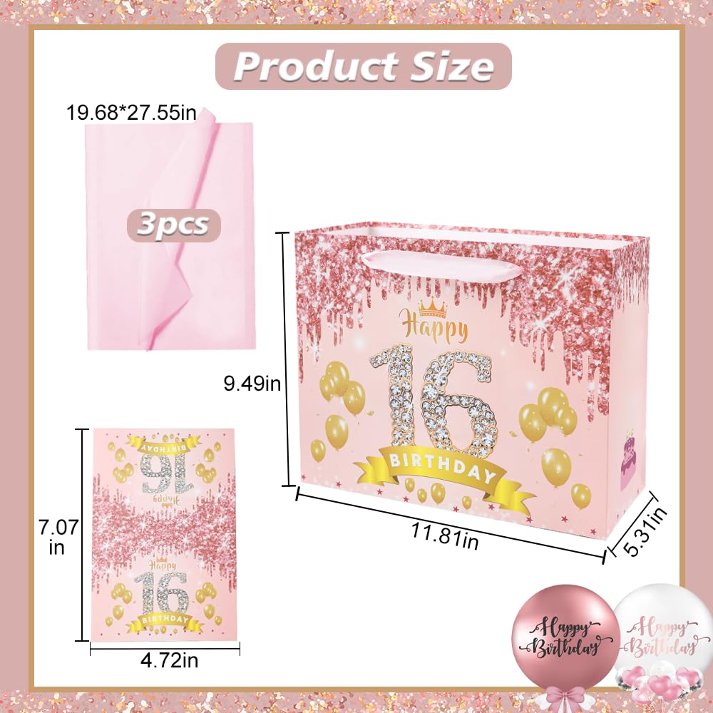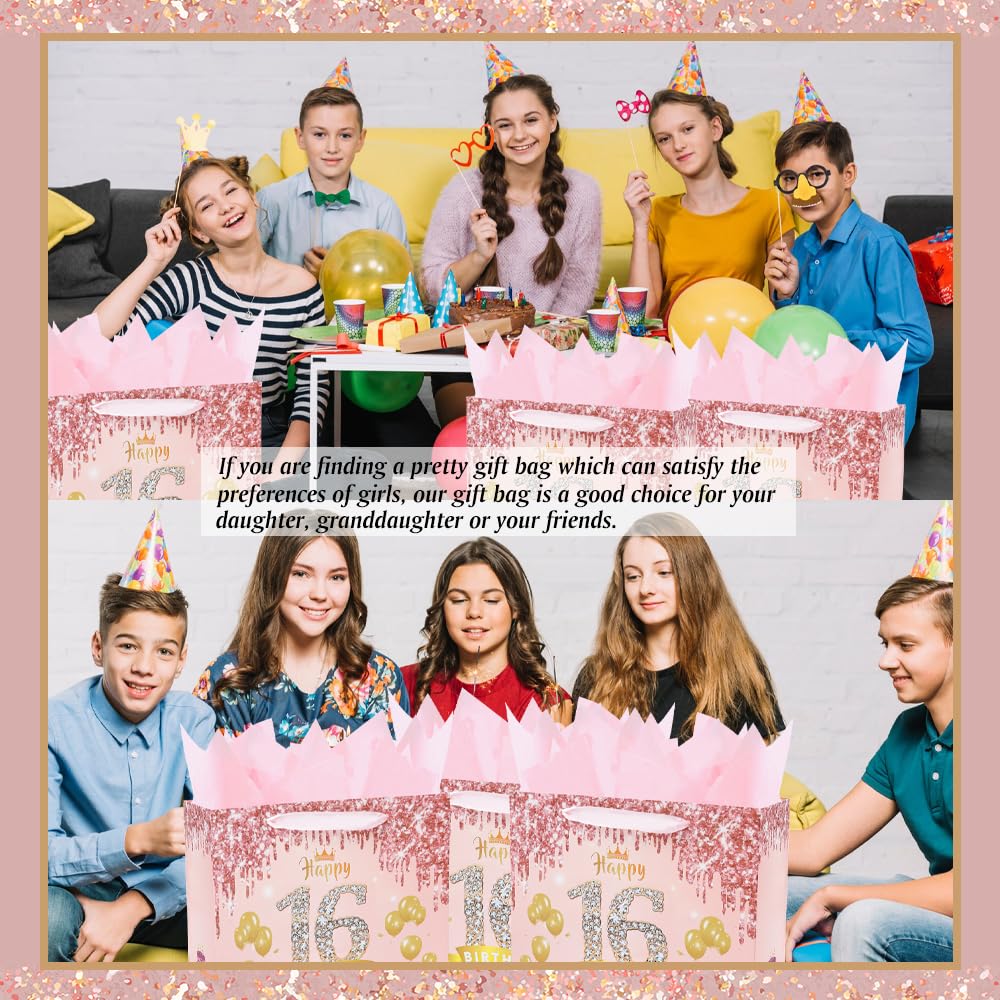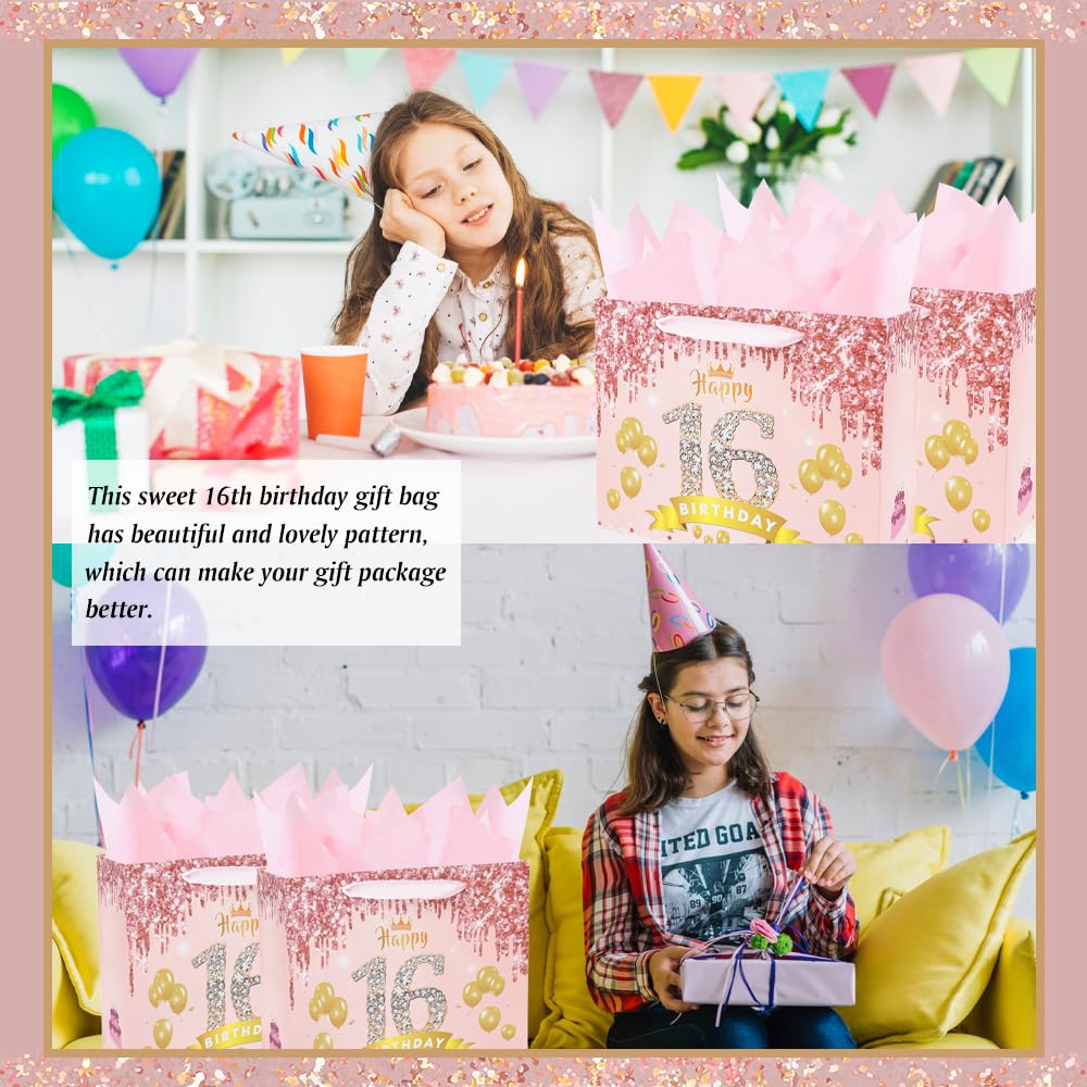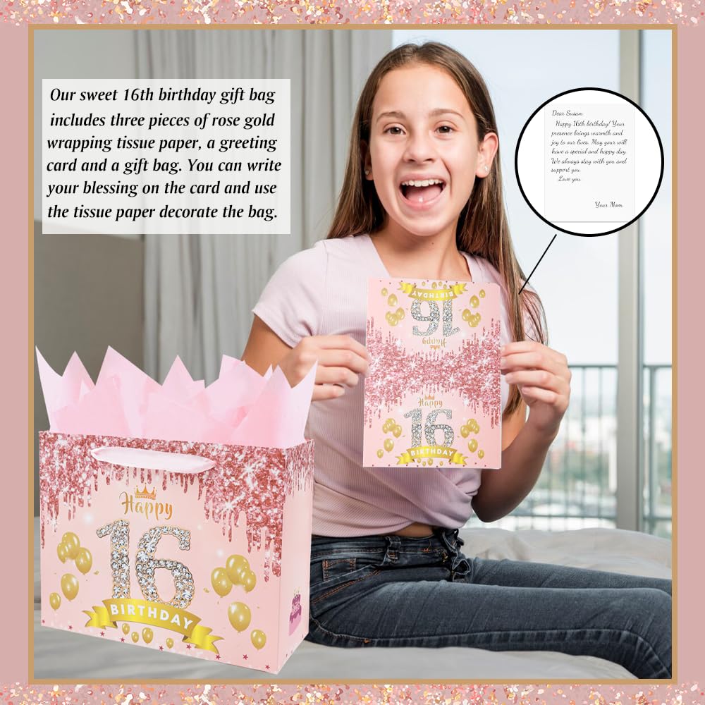 Product Include: Our sweet 16th birthday gift bag includes 3 pieces of rose gold wrapping tissue paper, a beautiful greeting card and a large gift bag. It can be a suitable and great decorations of 16th birthday gifts.