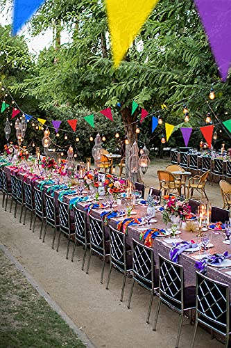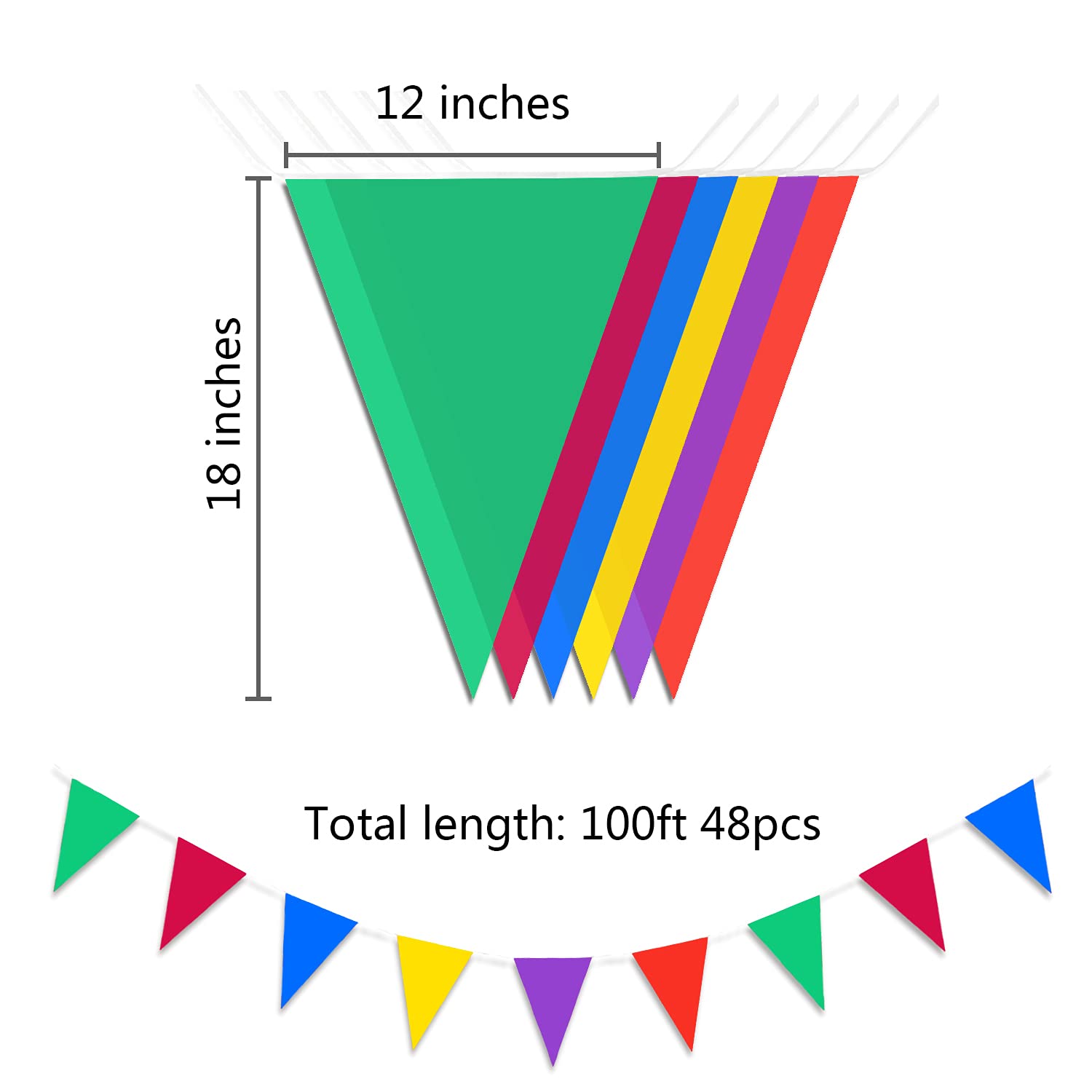 VERY LONG: 100ft multicolor pennant banners, Includes 48 pcs 12" x 18" pennants, The polyethylene material can be cut to the required length and size as required.