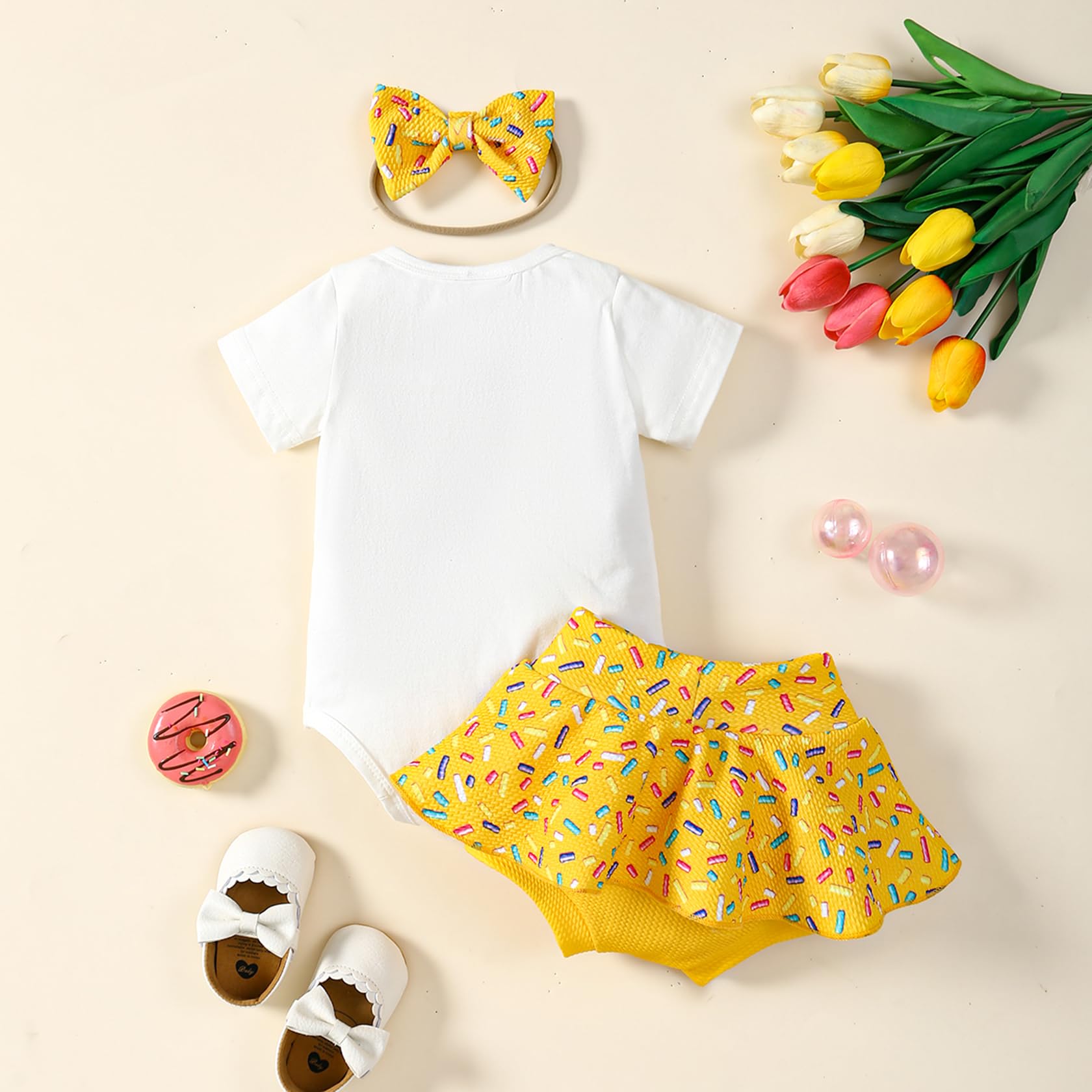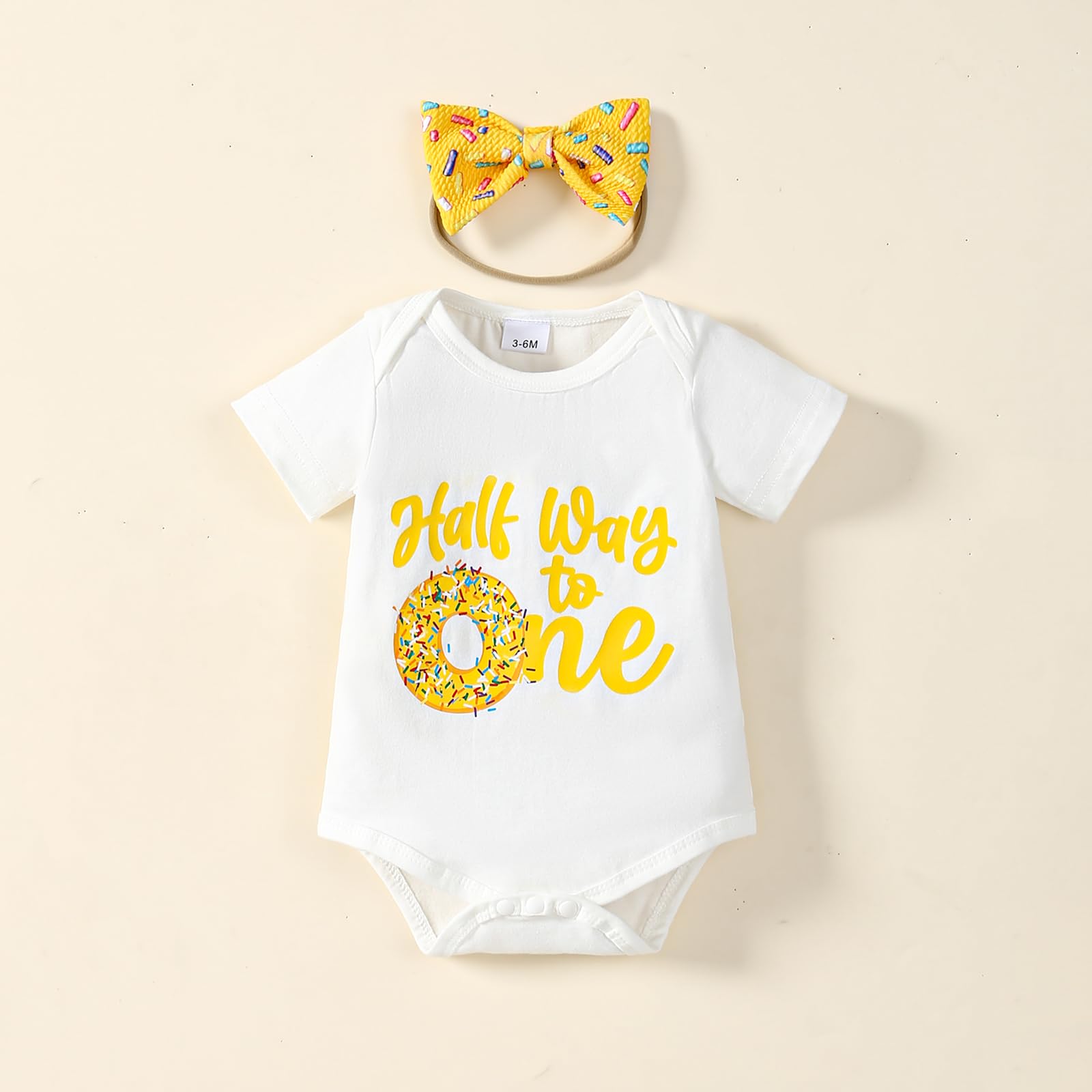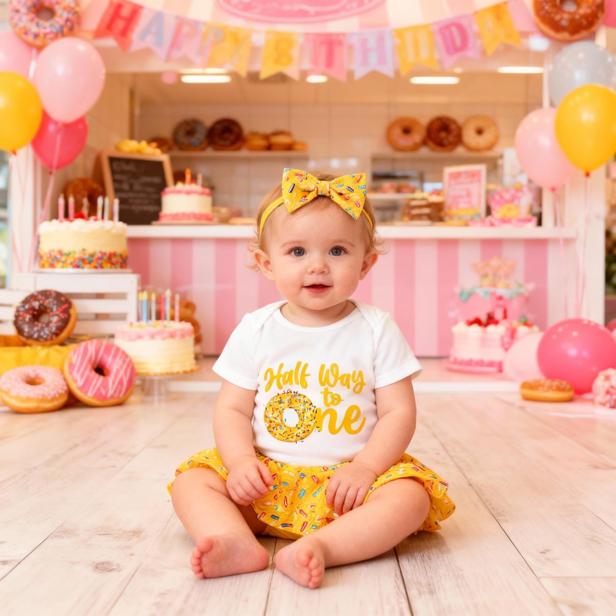 Design: stylish Half Way to One, with cute donut shorts, fun Half Way Around the Sun, with Sun print shorts. Best Gift for Darling's first birthday!
