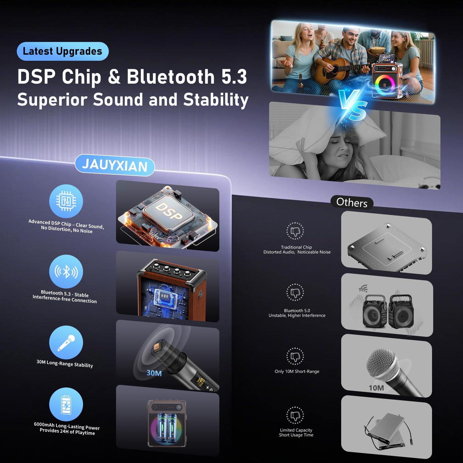 【Ultra-high-definition Stereo Sound Quality】: This Upgraded Karaoke Speaker is equipped with high-performance audio drivers and an advanced digital signal processor. Even at relatively high volumes, it can deliver clearer sound quality, more powerful bass, and balanced volume without distortion. The built-in 6.5" subwoofer and 2" tweeter can amplify your voice, play the radio, and stream music, providing you with a high-quality audio experience free of noise.