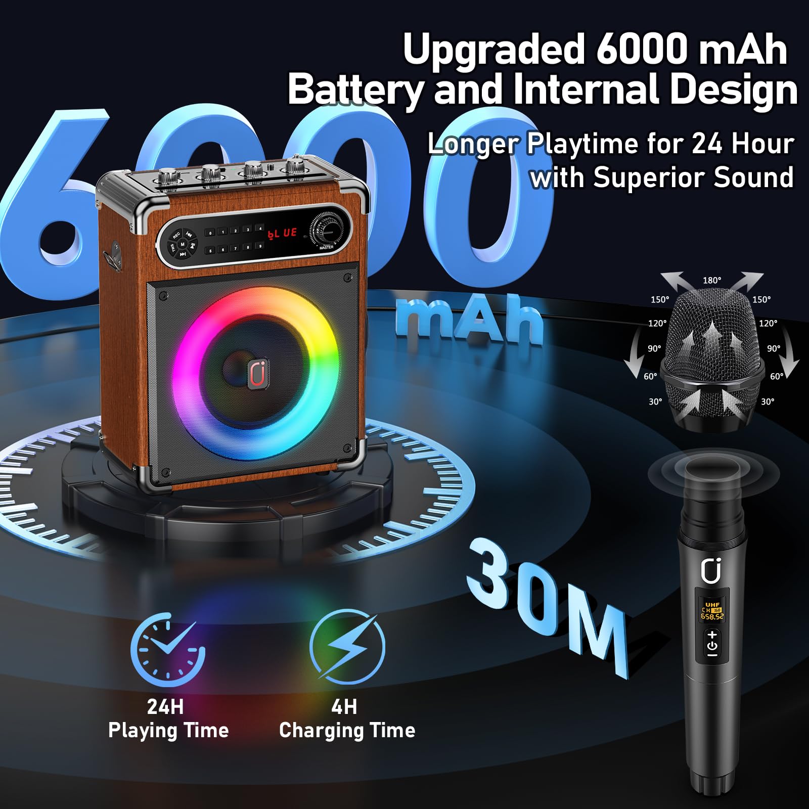 【Lightweight & Durable & Long-lasting】: The shell of this party speaker is meticulously fabricated from either durable wood or high-quality leather, and it is furnished with a shoulder strap, which renders it extremely convenient for users to carry around. It is powered by a 6000mAh rechargeable lithium-ion battery can offer an music playback time of up to 24 hours and the standby time extends up to 72 hours. This makes it an ideal choice for various outdoor events.