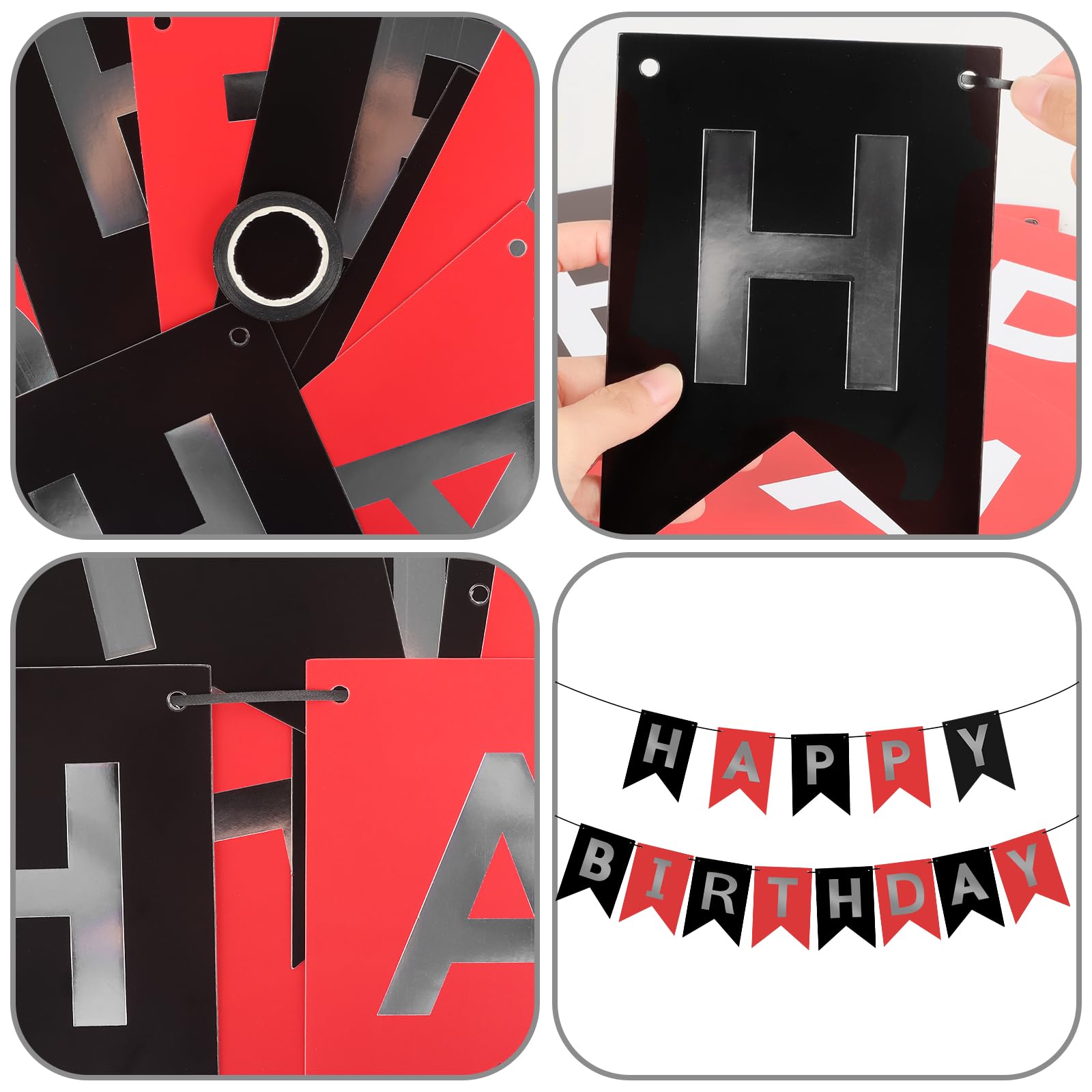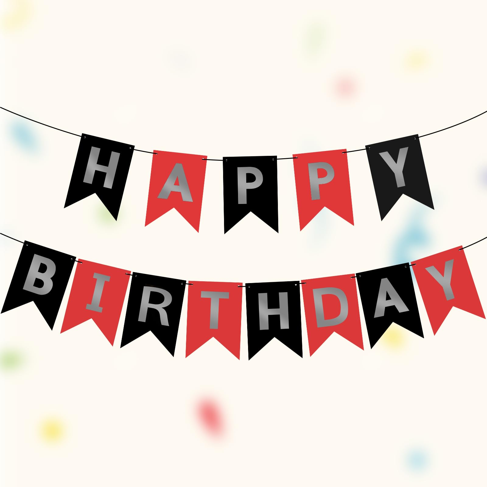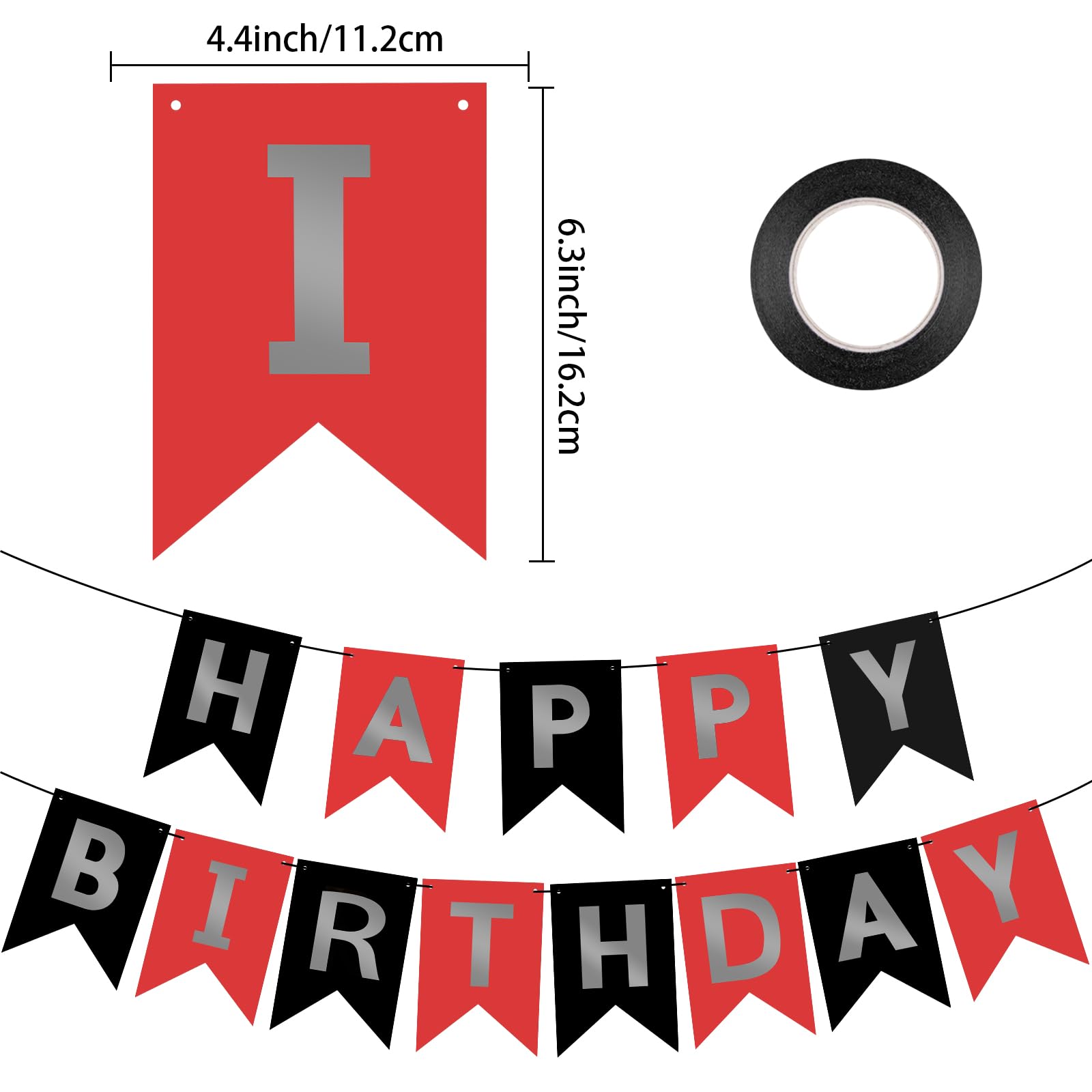 EASY TO MAKE: Each red black banner flag card size is 4.5" × 6.3". 13 paper flags that spell the phrase "HAPPY BIRTHDAY" on 1 ribbon (length 16.4ft). You can use a plastic needle with the ribbon to easily string all the letters together without effort, the spacing between the flags is adjustable. You can move the triangle flags to have a different look