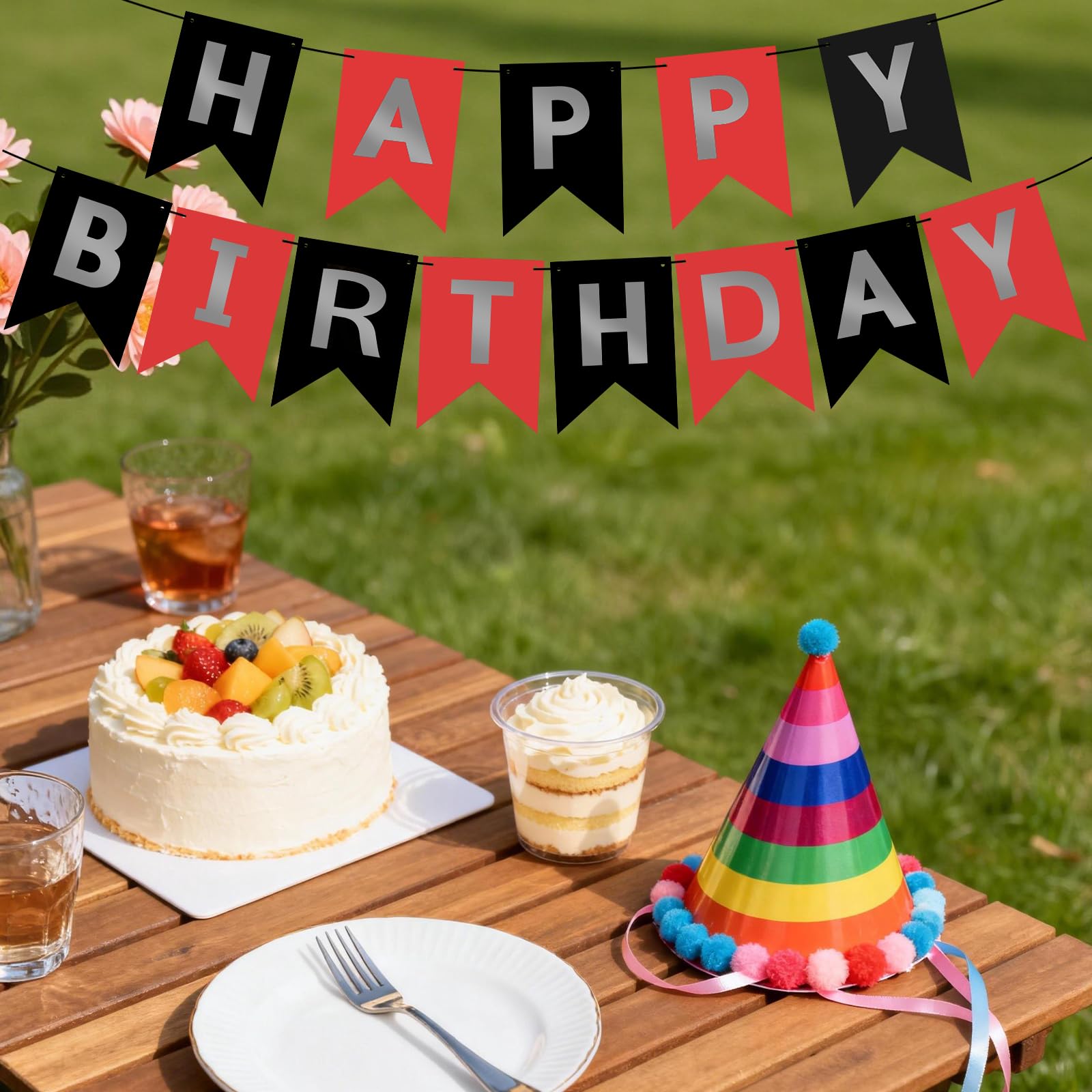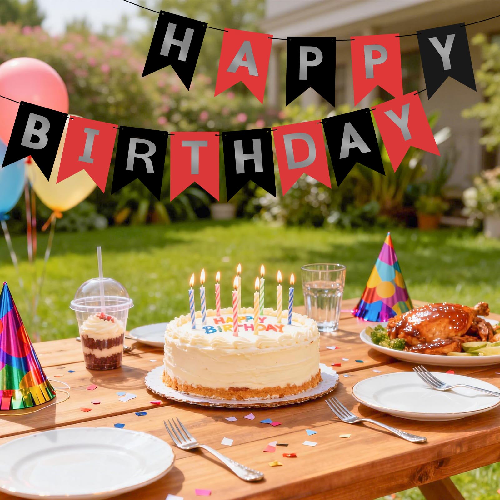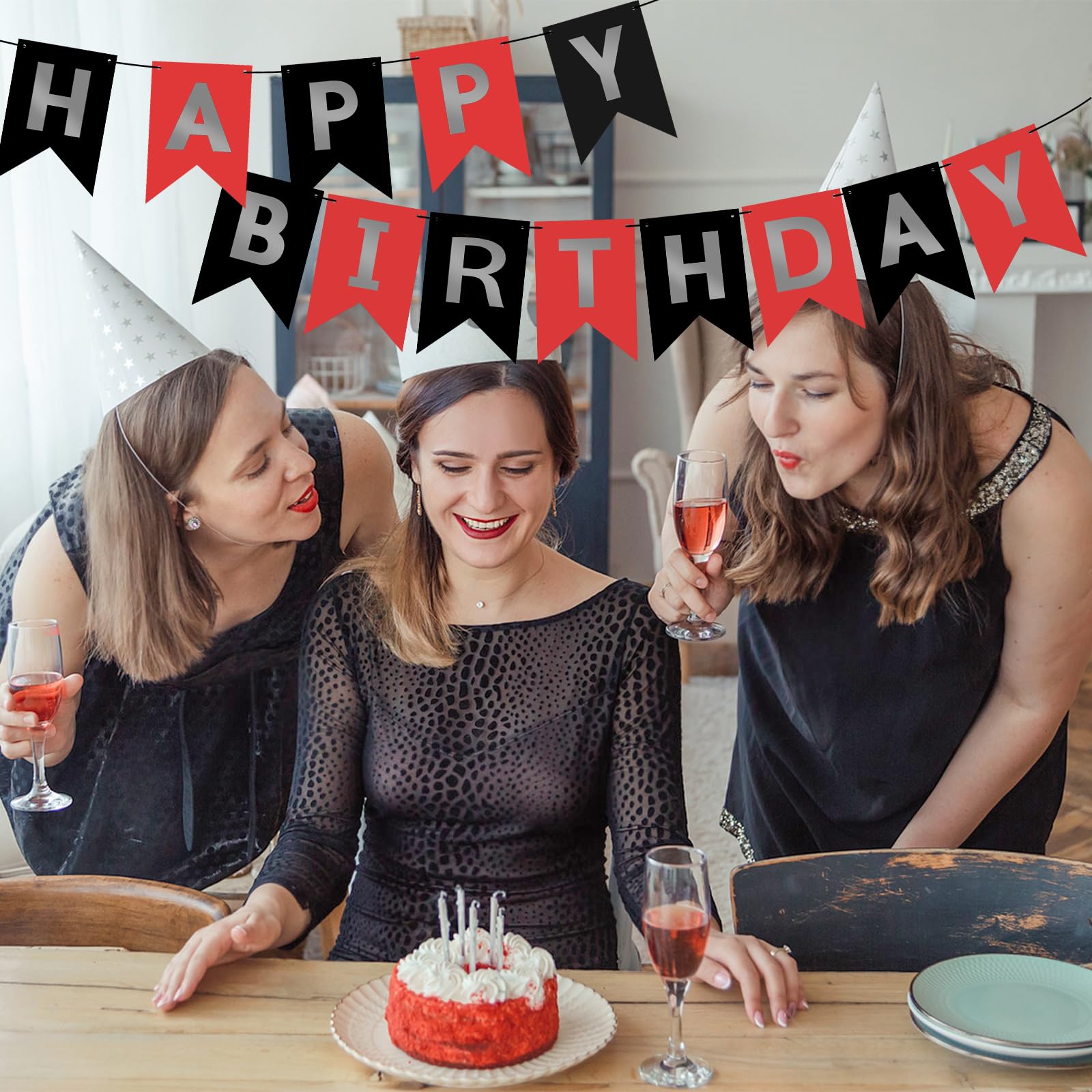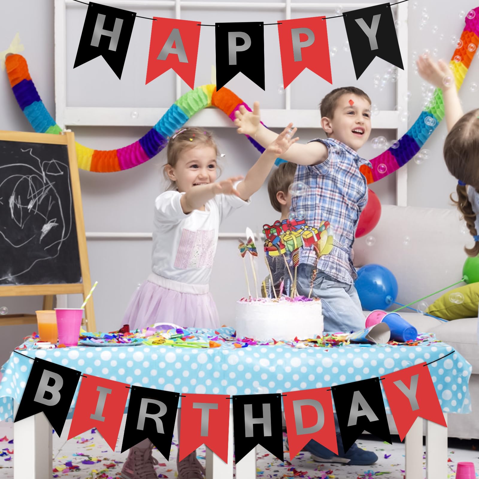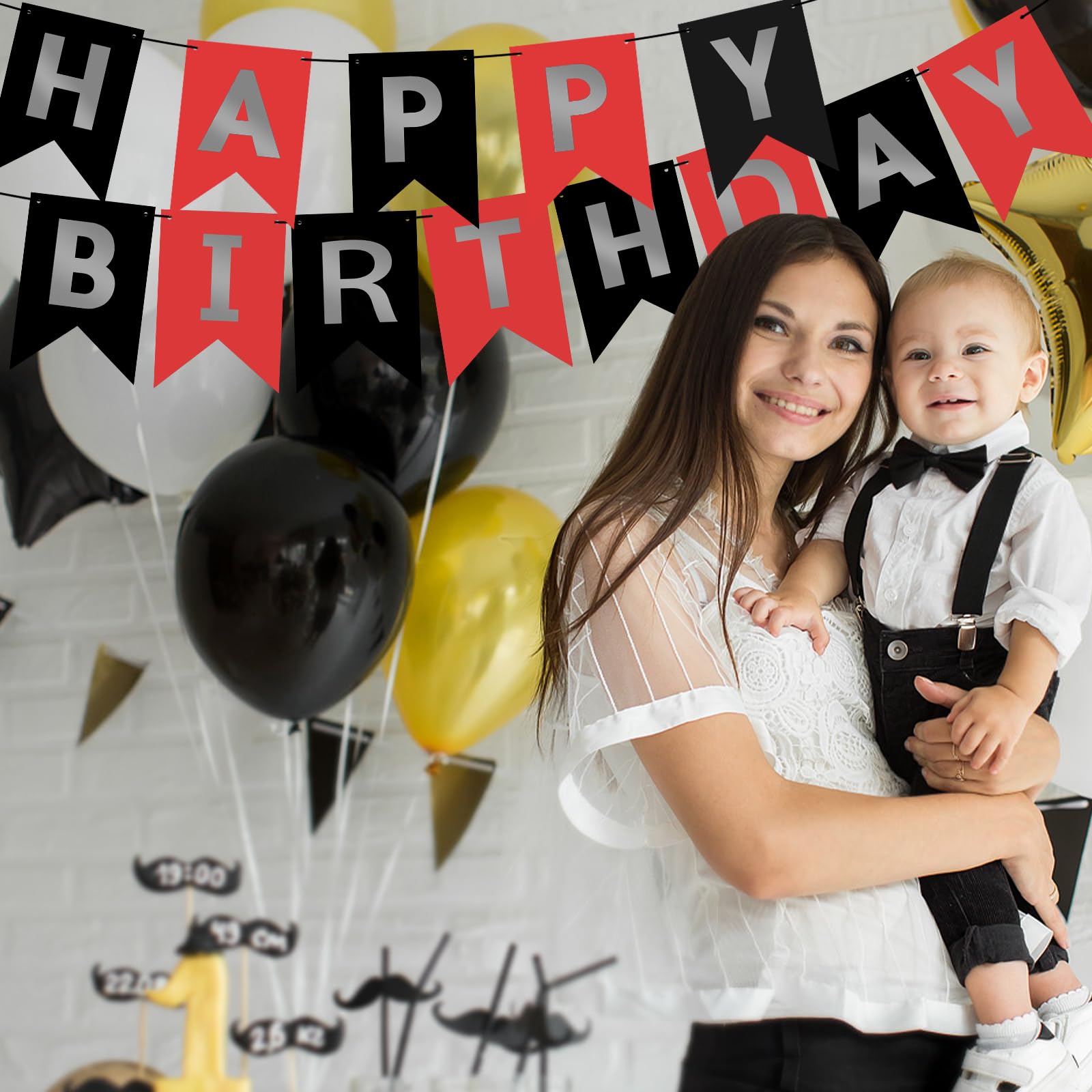 HIGH QUALITY: Made of high-quality cardstock paper, resistant and reusable. Lovely and lively colors add luster to the space decoration. Happy birthday, banner black red easily fit any wall, fireplace, gift table, buffet table, garden, living room, family room, banquet hall, indoor or outdoor