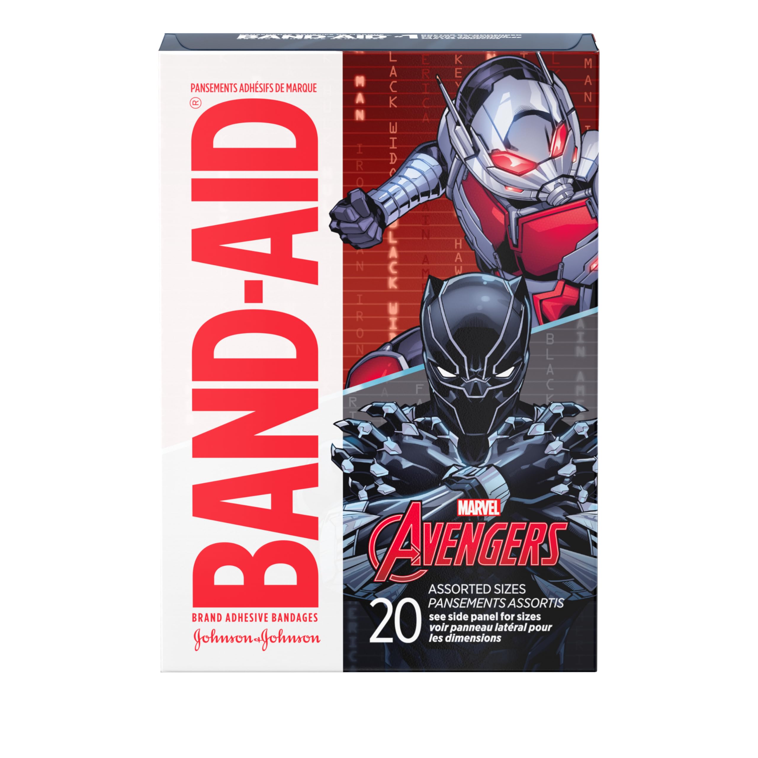 Band-Aid Brand Adhesive Bandages for kids, featuring Marvel Avengers designs, cover and protect minor cuts and scrapes with fun Marvel Avengers graphics. These sterile bandages come in assorted sizes with designs that include Iron Man, Hulk, Captain America, and others. Band-Aid Brand Adhesive Bandages stick to the skin, not the wound. This package contains 20 sterile bandages in assorted sizes suitable for small wounds.