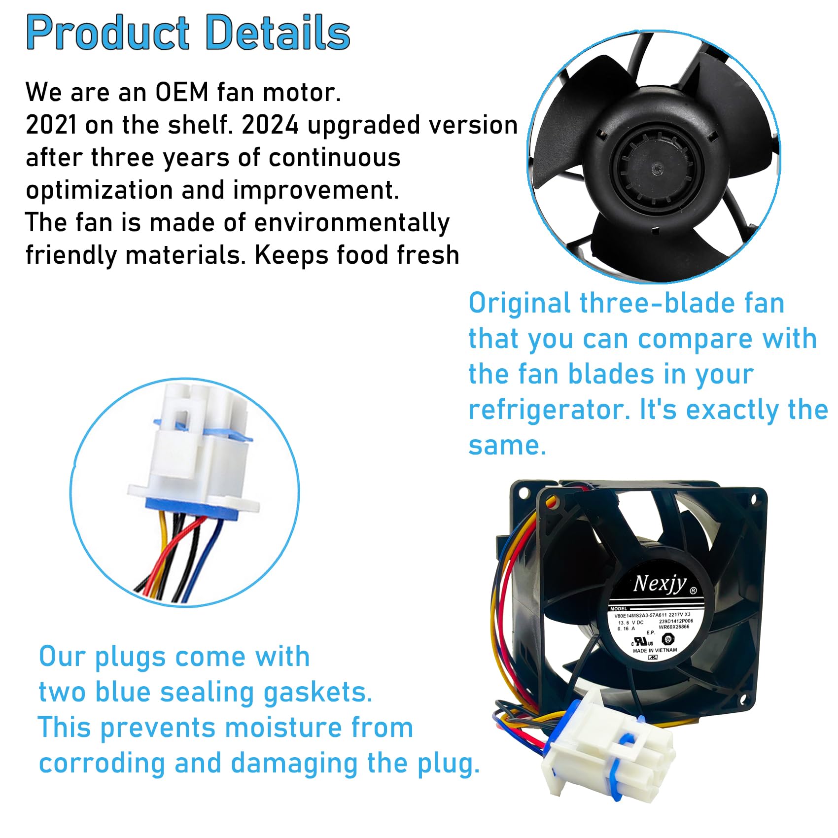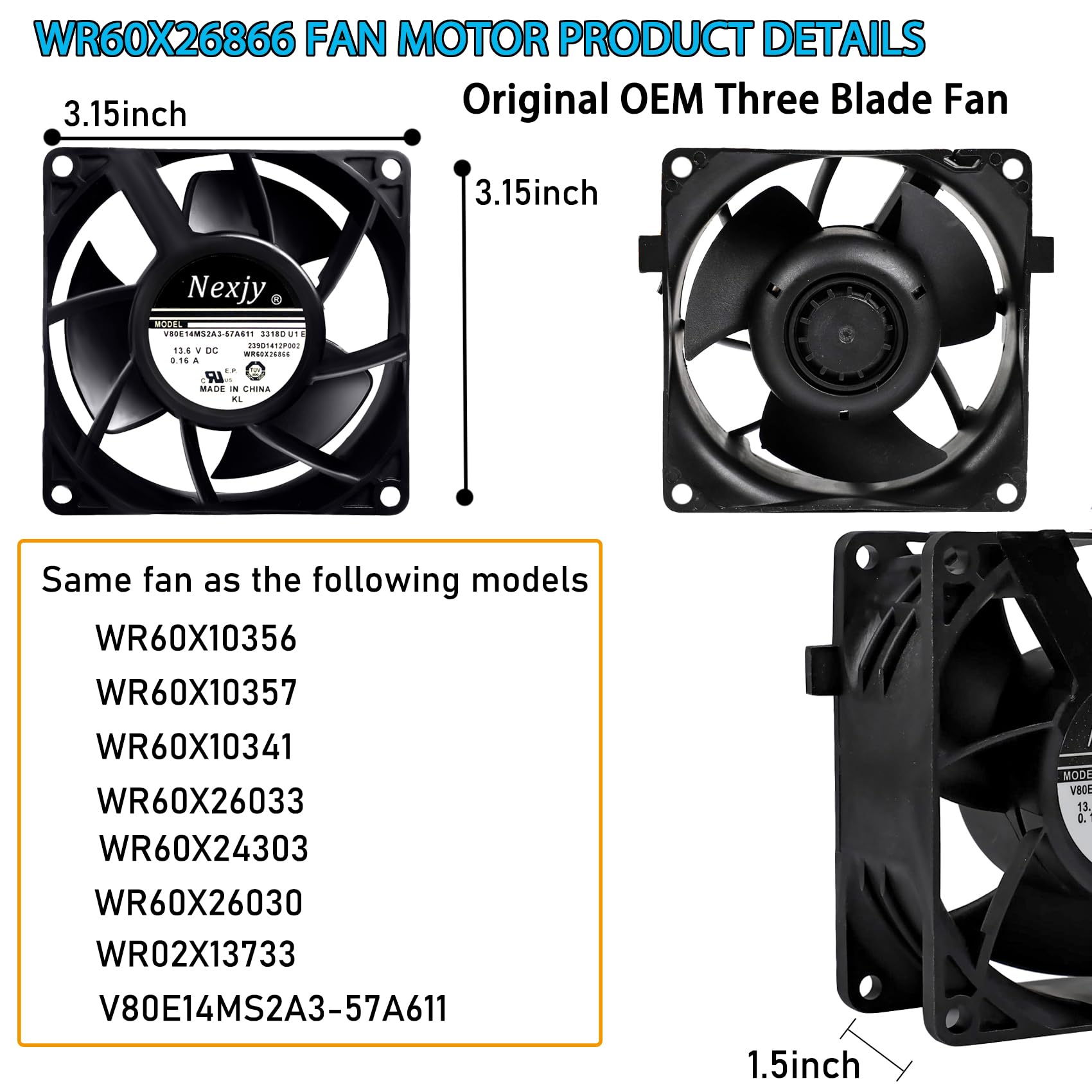 【WR60X26866 Fridge Fan Motor Product Information】WR60X26866 Evaporator Fan Motor is the same three-blade fan as the original WR60X26866 fan in your refrigerator. part number WR60X26866 Evaporator Fan Motor replaces WR60X24303, WR60X26030, WR60X26033, WR60X10341, WR60X10356, WR60X10357, WR02X13733, V80E14MS2A3-57A611, AP6278228, EAP12172983.