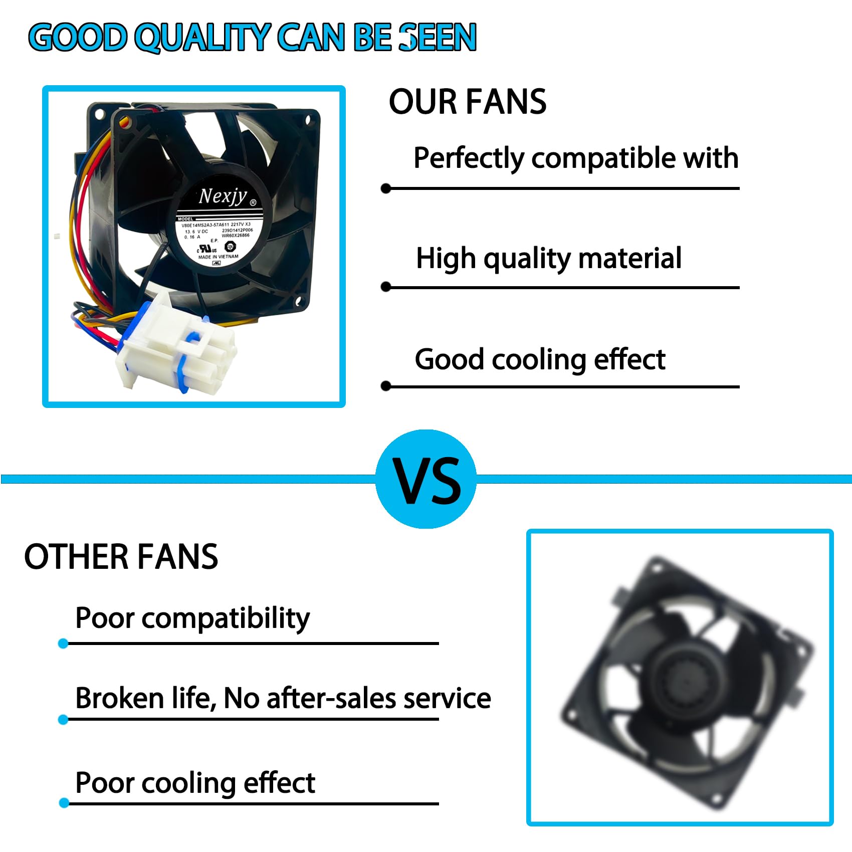 【Excellent after-sale service】 wr60x26866 V80E14MS2A3-57A611 Fans are precision parts. It may be damaged during logistics and transport, resulting in noise, breakage and other problems. If the wr60x26866 fan you receive is faulty. Please do not worry. Please contact us, our after-sales team will solve the problem and resend you a new wr60x26866.