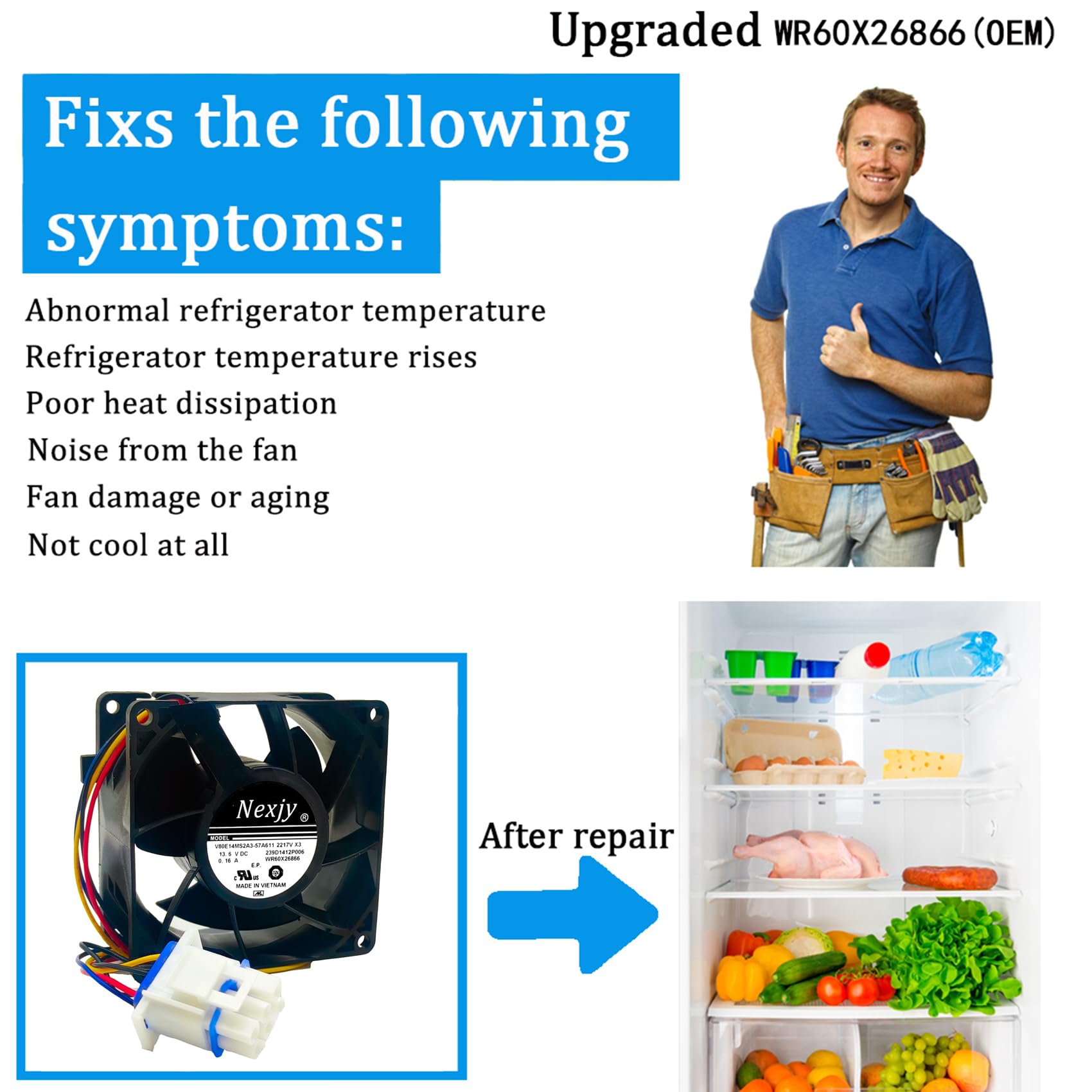 ❄【V80E14MS2A3-57A611 Evaporator Fan Motor】 Our Nexjy wr60x26866 evaporator fan motor is compatible with GE refrigerators. As long as the first five digits of your refrigerator model number is CFE28 CFE29 CWE23 CYE22 CYE23 DFE28 DFE29 GFD28 GFE26 GFE27 GFE28 GFE29 GFS26 GFS28 GNE26 GNE29 GYE22 GYS22 PFD28 PFE28 PFE29 PWE23 PWE23 PYD22 PYE22 PYE23 ZWE23 etc. You can send us your refrigerator model directly to ask us a question. We will help you to quickly check if wr60x26866 is compatible with your fridge.