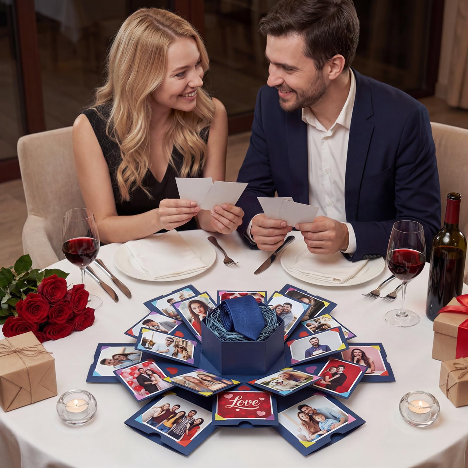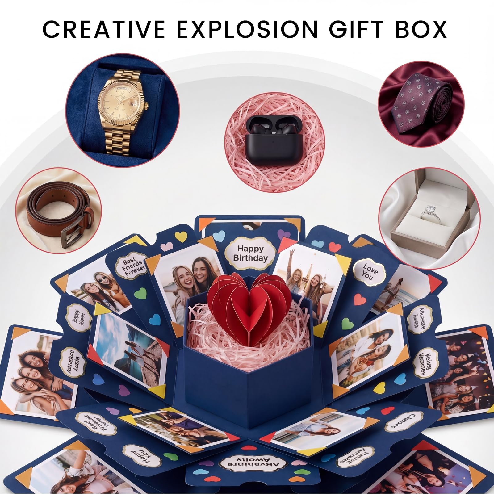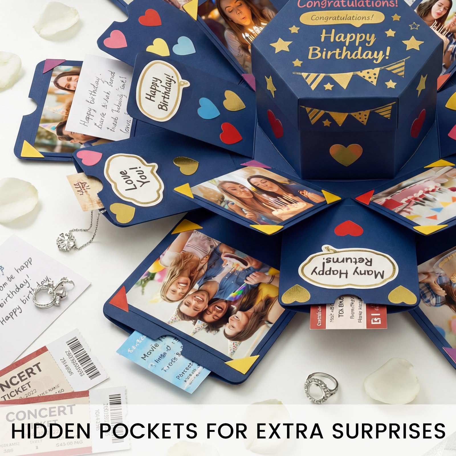 Unfold Surprises, Cherish Memories - You'll find a super surprise when this blue gift box opens. 4 layers of cards will explode. You can paste carefully selected photos on every layer, up to 36 pieces. The smallest gift box can hold gifts like rings, lipstick, necklace, watch, earrings, chocolates, perfume, etc., creating an unforgettable memory for your loved ones