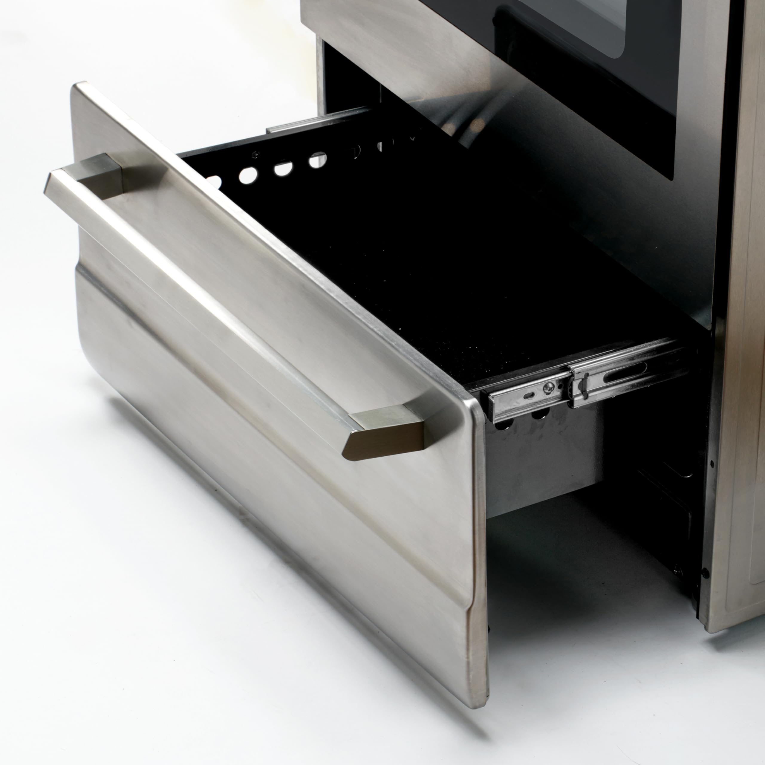 USER-FRIENDLY OVEN DESIGN: Features a bake/broil oven with a broiling pan, seamless framed glass oven door, and a pull-out storage drawer with a handle for added convenience.