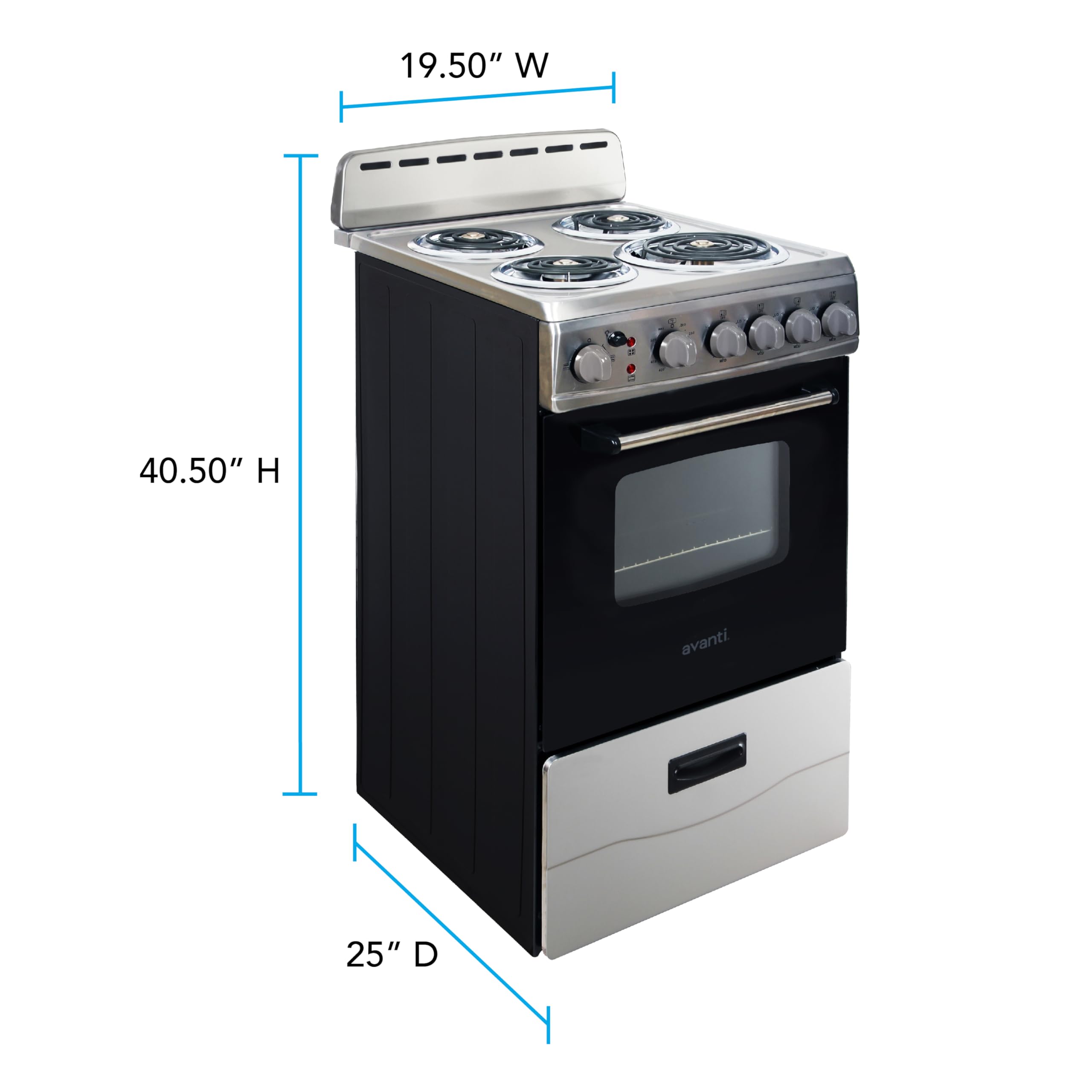 Save valuable kitchen space without compromising performance with the Avanti 20-Inch Electric Range Oven in sleek stainless steel. Ideal for studio apartments, RVs, tiny homes, vacation properties, condos, and office break rooms, this compact freestanding electric range brings full-size cooking functionality to small spaces. With a spacious 2.1 cu. ft. oven capacity, you can easily bake, roast, and broil meals with confidence. This space-saving range features four coil burners—three 6-inch and one 8-inch—with chrome reflector bowls and integrated temperature safety sensors to ensure even heat distribution and safer cooking. The bake/broil oven comes complete with a broiling pan, and the seamless framed glass door adds a modern touch while allowing you to check your food at a glance. Additional user-friendly features include an electronic oven thermostat for precise temperature control, oven light with an ON/OFF switch, and surface and oven indicator lights that offer added safety and ease of use. A pull-out storage drawer with a handle provides extra room to keep pots, pans, or baking trays within reach. ADA-compliant and backed by Avanti’s 1-Year Manufacturer Limited Warranty, this range is both practical and stylish—perfect for anyone looking to maximize kitchen efficiency in a compact space.